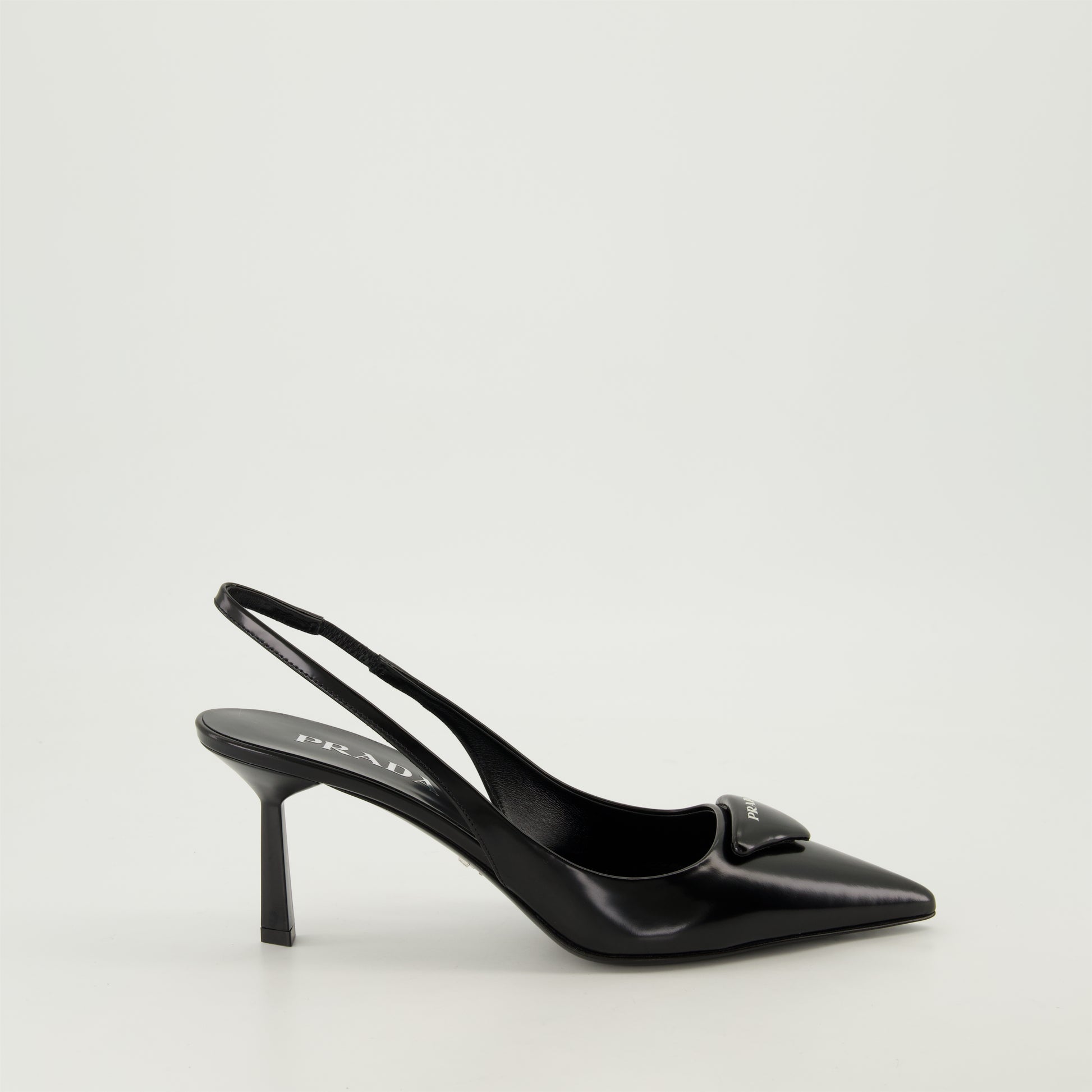 Escarpin en cuir noir de Prada pour femme, réalisé en cuir de veau. Ce modèle fait partie de la collection Printemps-Été 2025 et présente un design élégant avec un talon fin.