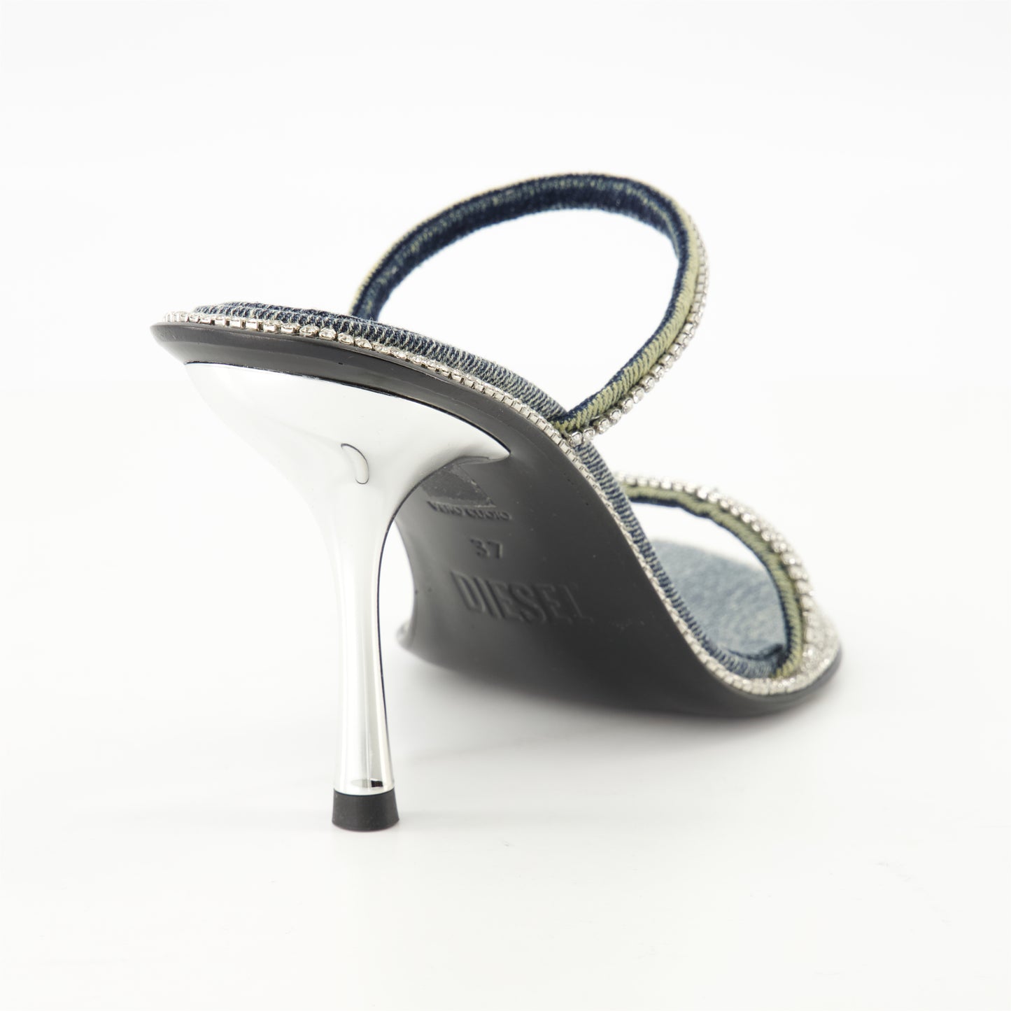 Sandales à talons D-havanna Sdl en denim bleu de la marque Diesel, conçues pour les femmes. Cette pièce fait partie de la collection Printemps-Été 2025 et arbore des ornements en cristal.