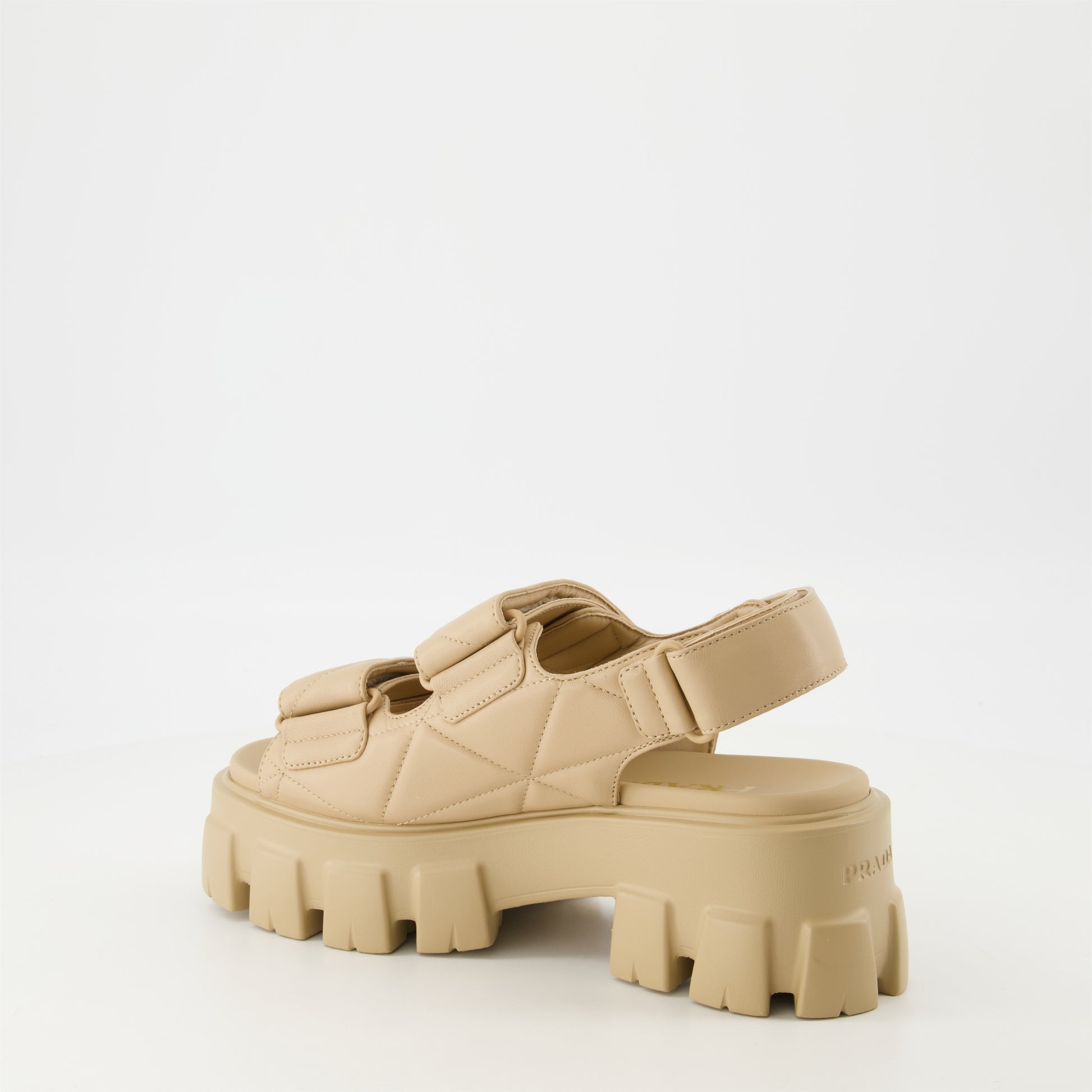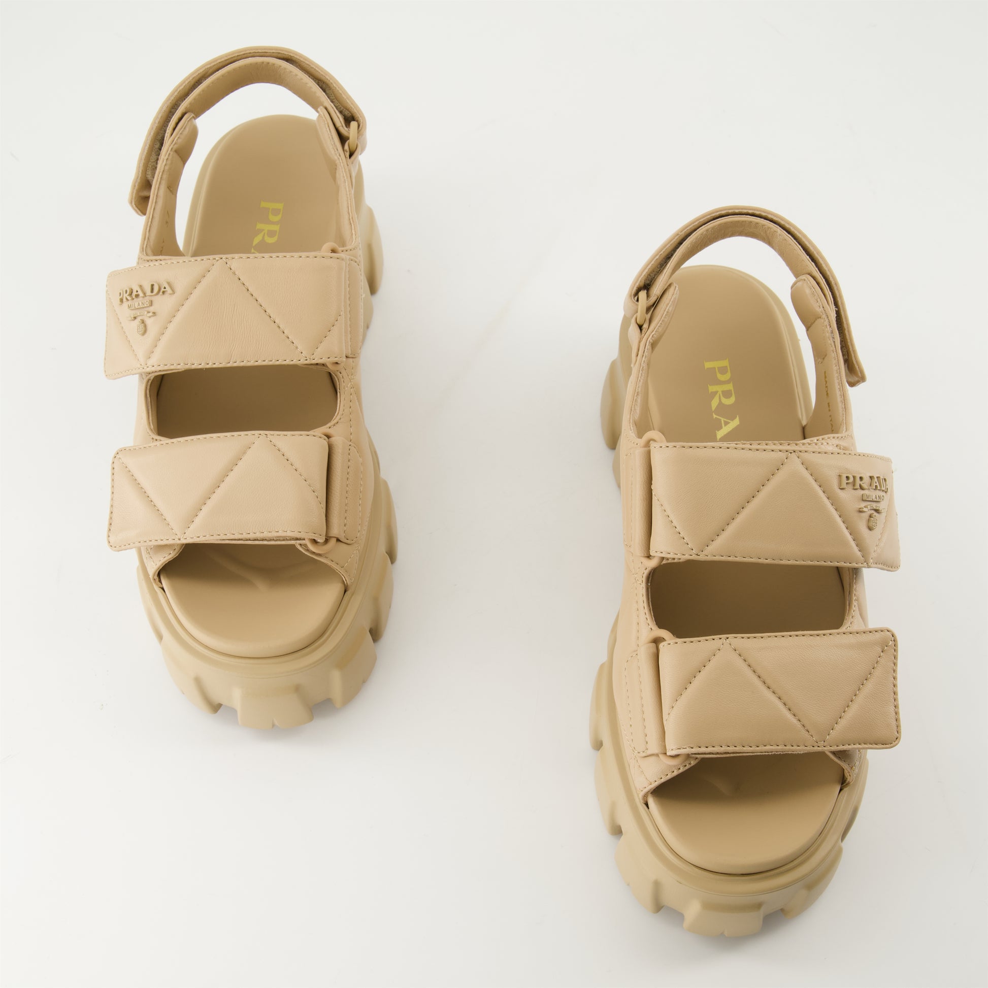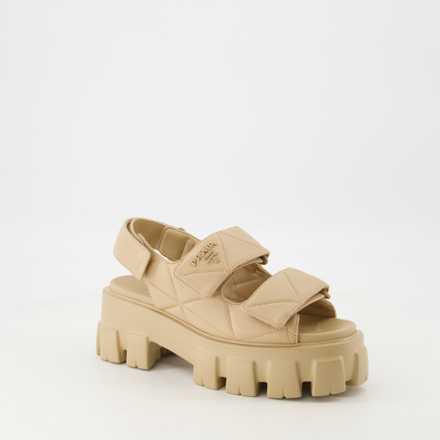 Sandales en cuir matelassé beige de Prada pour femme, collection Printemps-Été 2025. Elles présentent des pattes d'attache à scratch, un bout ouvert arrondi et une semelle crantée en gomme.