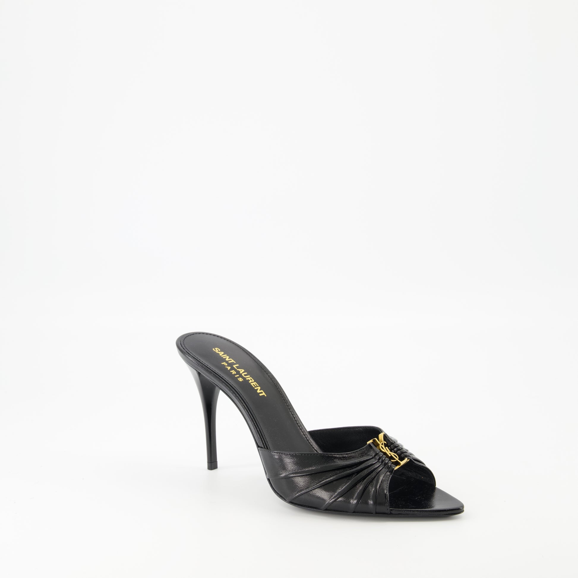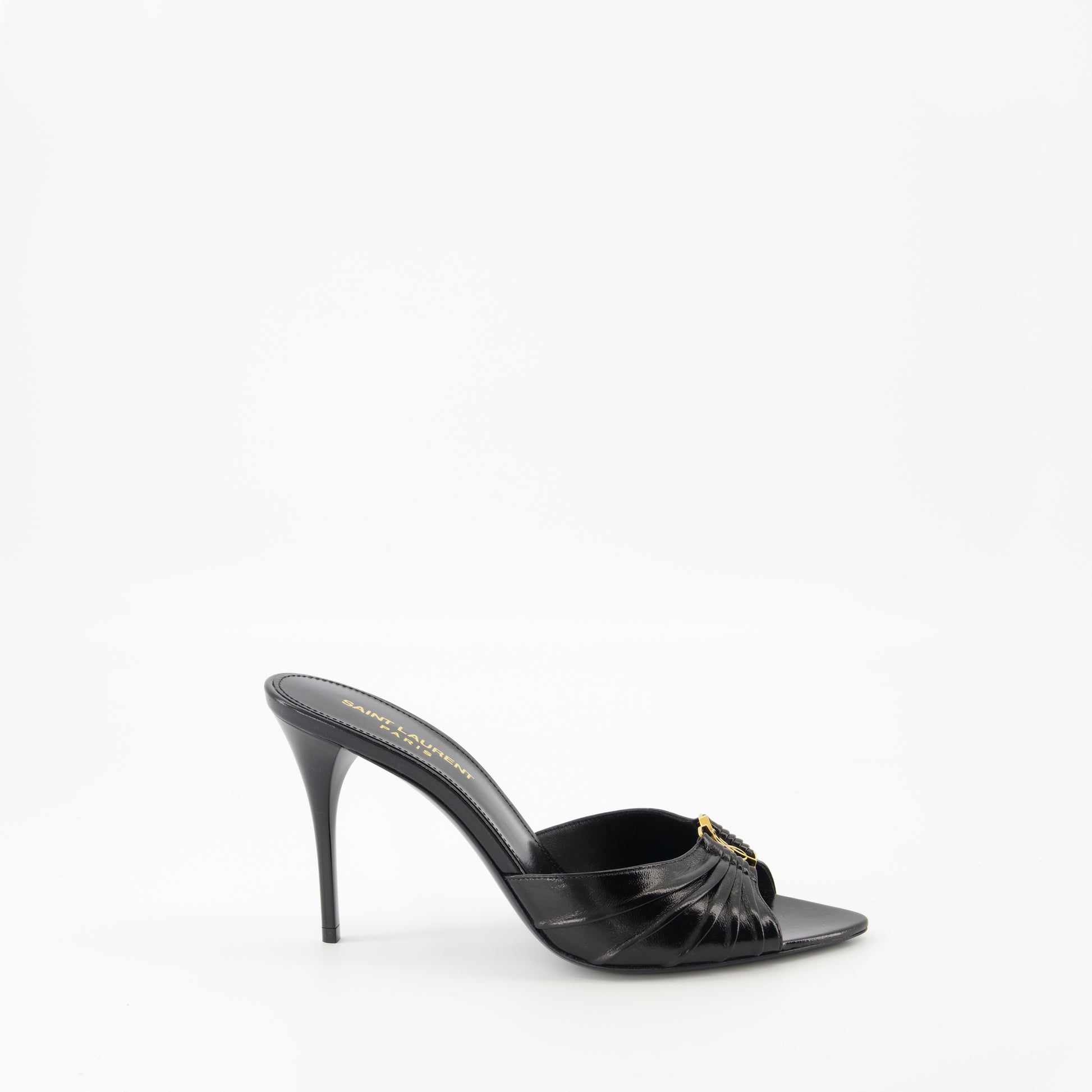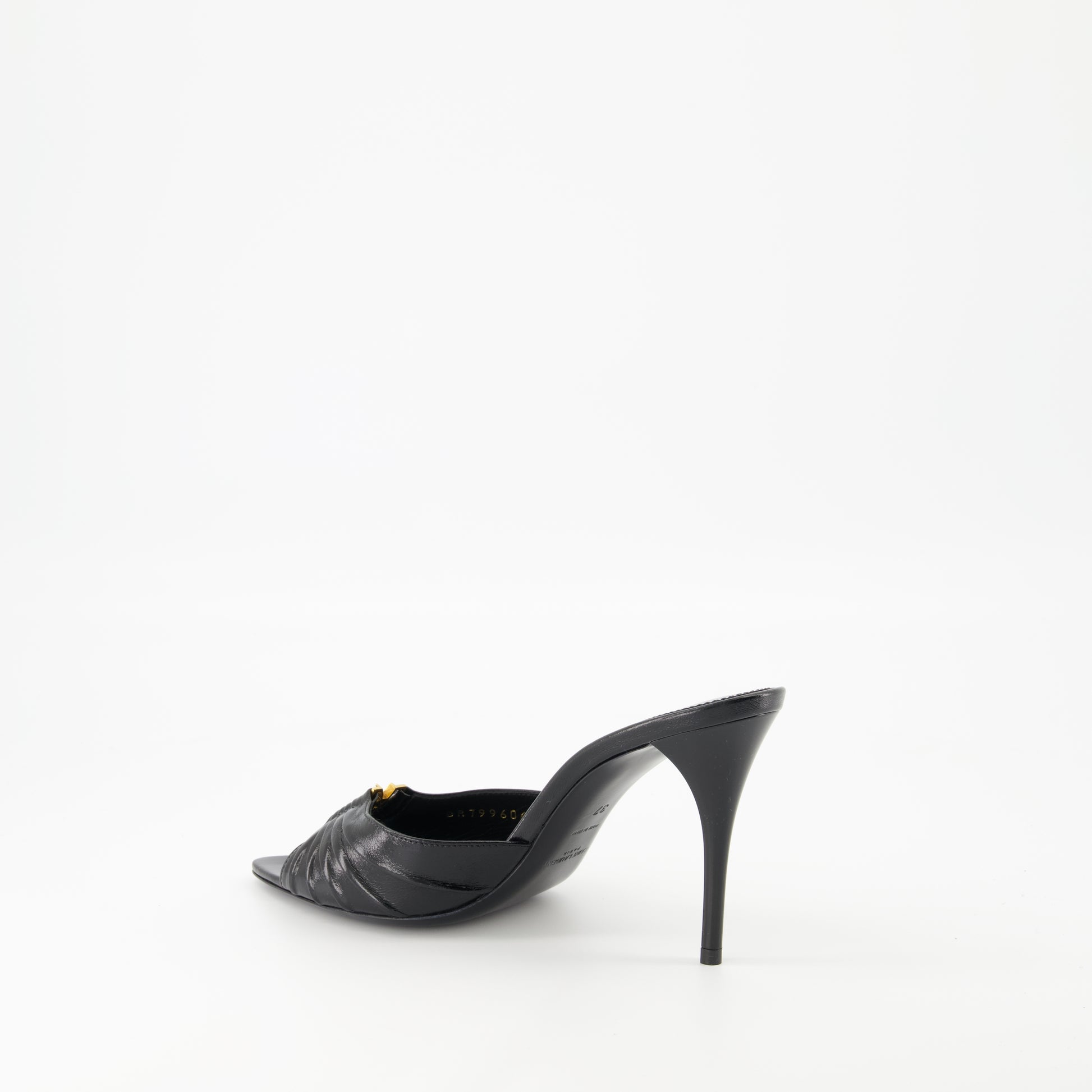 Les sandales à talons Babylone de Saint Laurent sont en cuir d'agneau noir. Destinées aux femmes, elles font partie de la collection Printemps-Été 2025 et présentent un design élégant et moderne.