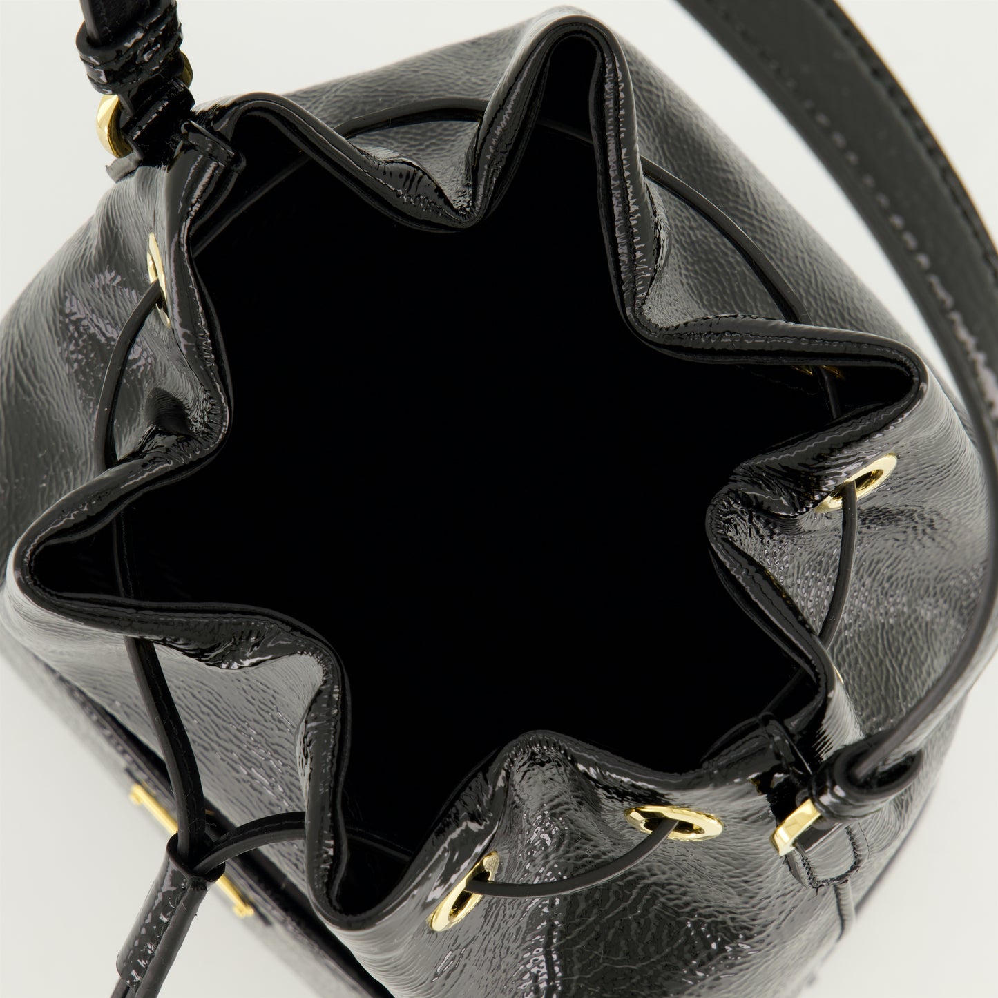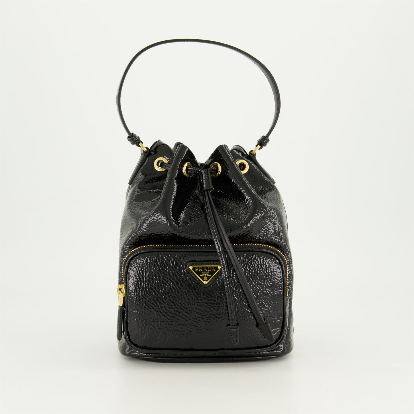 Sac seau Duet en cuir verni noir de Prada, conçu pour les femmes. Ce modèle fait partie de la collection Printemps-Été 2025 et allie élégance et praticité.
