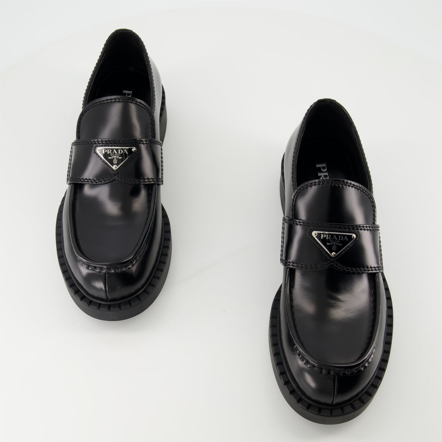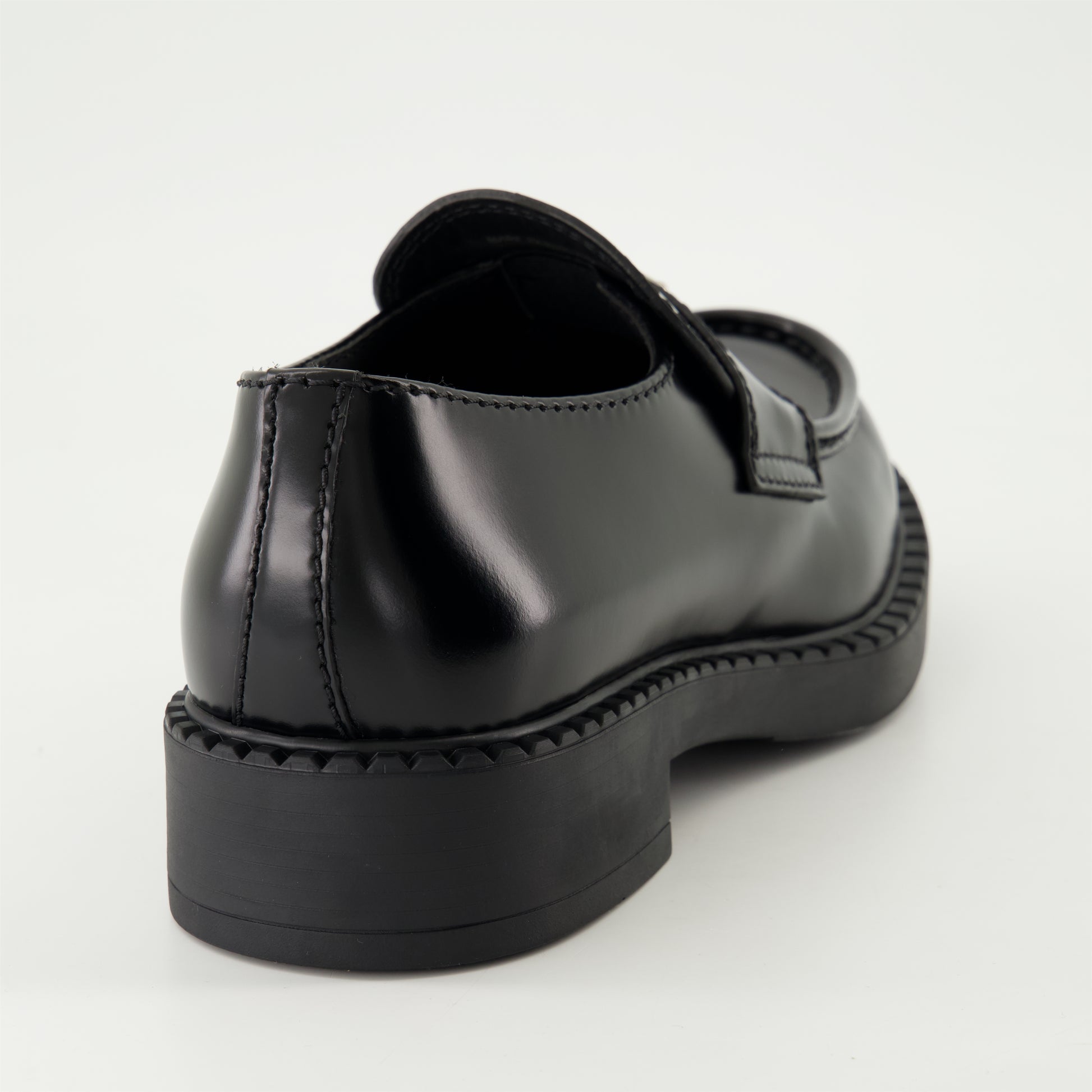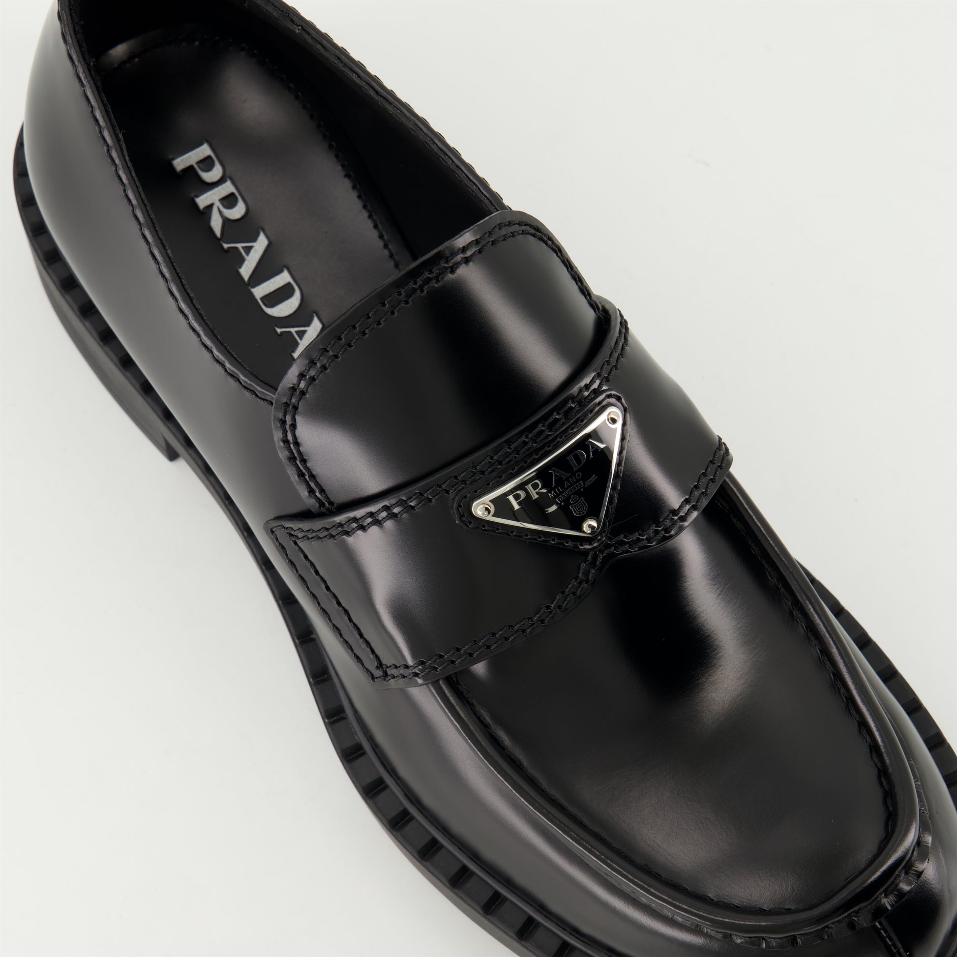 Mocassins Chocolate en cuir noir brossé de Prada, pour homme, sont un modèle à enfiler avec un design élégant. Ils font partie de la collection Printemps-Été 2025.