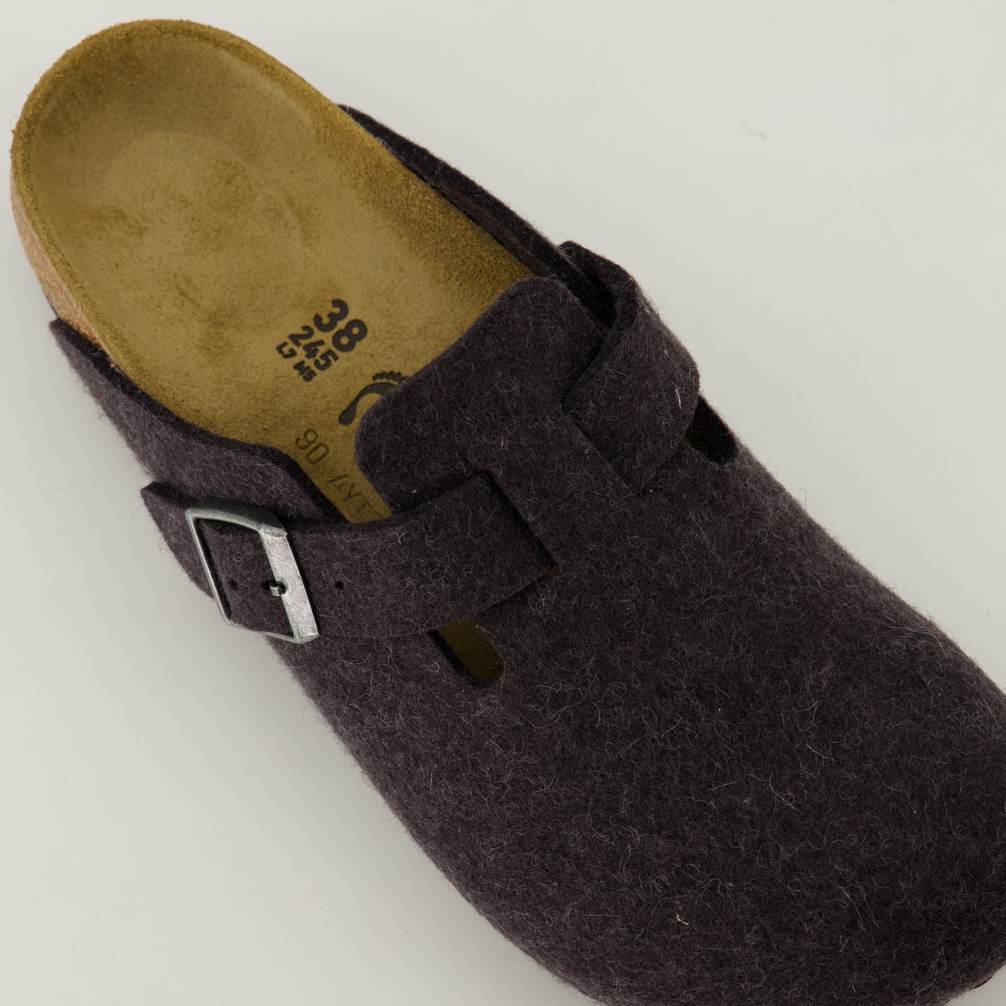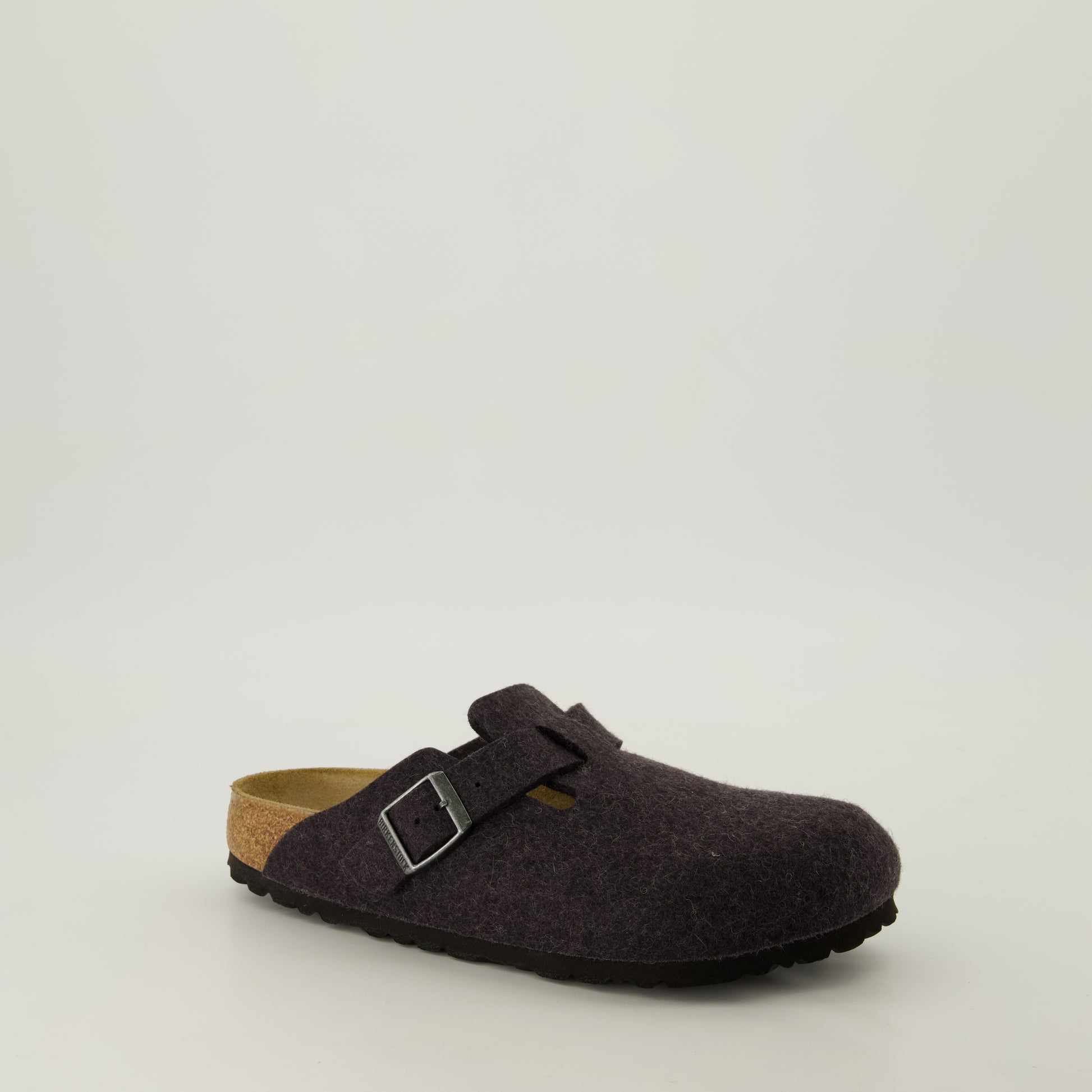 Mules Boston grise de Birkenstock, un modèle unisexe de la collection Automne-Hiver 2024, allient confort et style avec leur cuir de qualité et leur lit de pied anatomique.