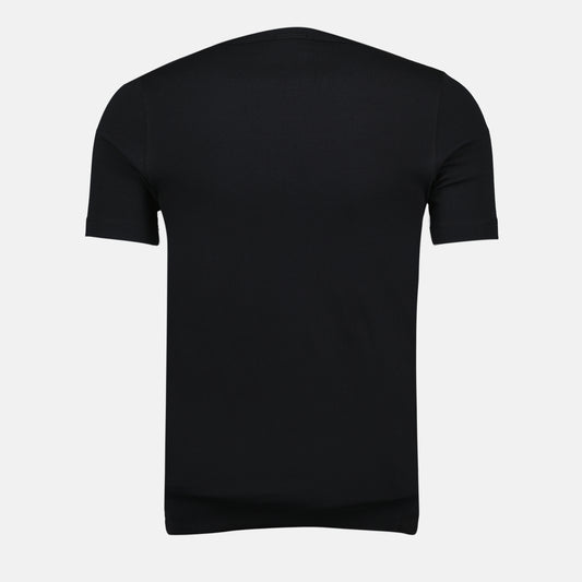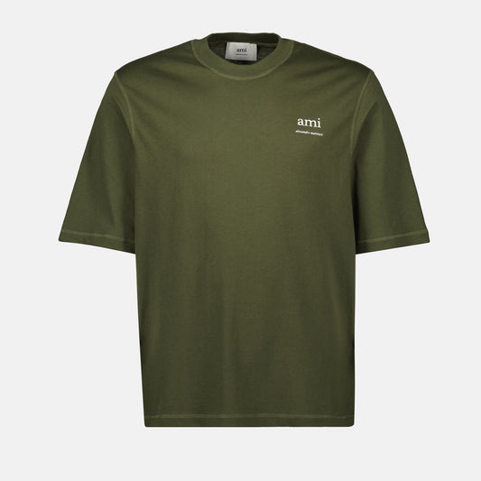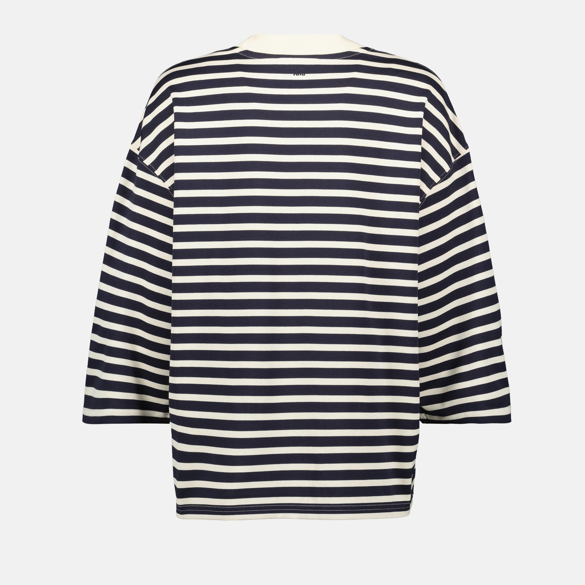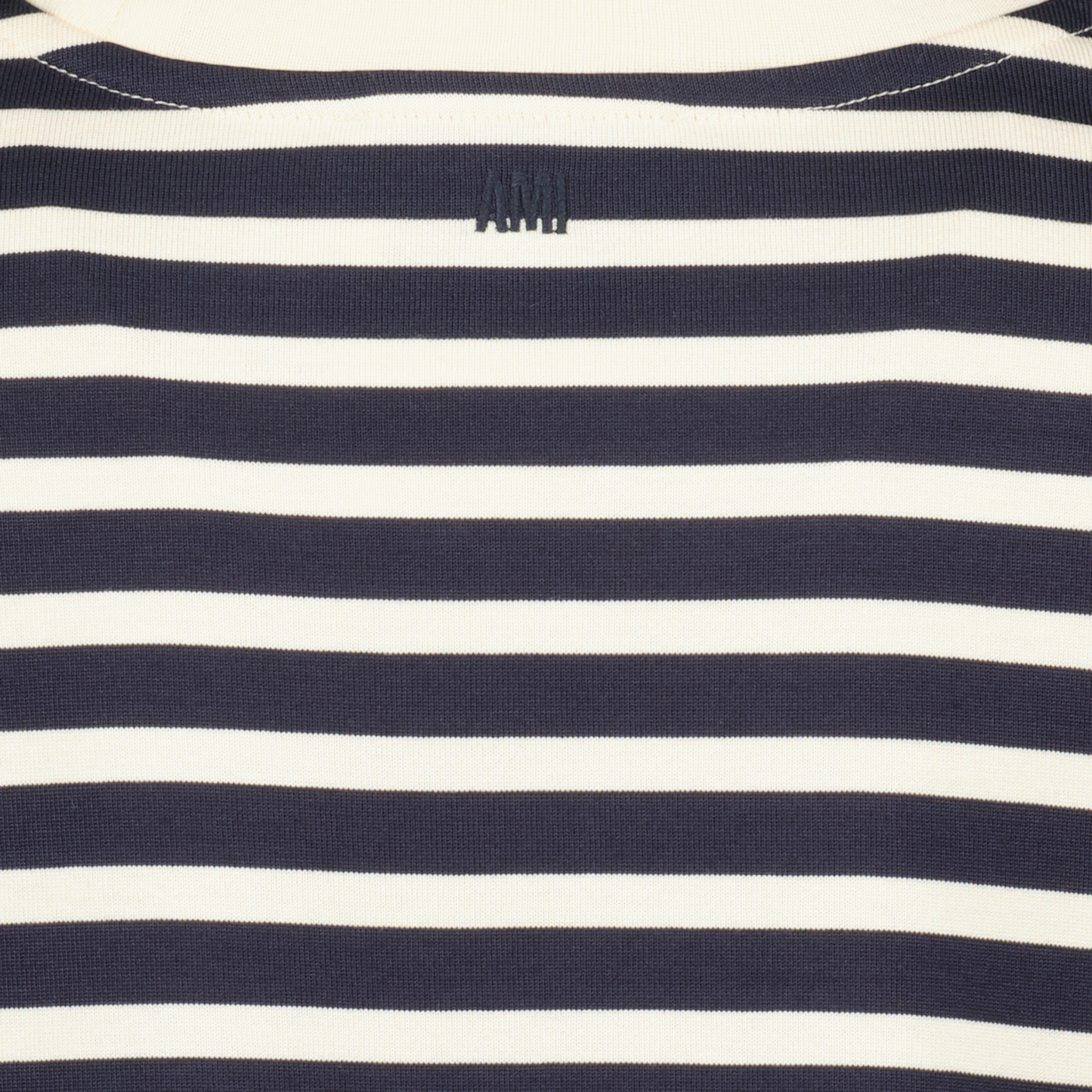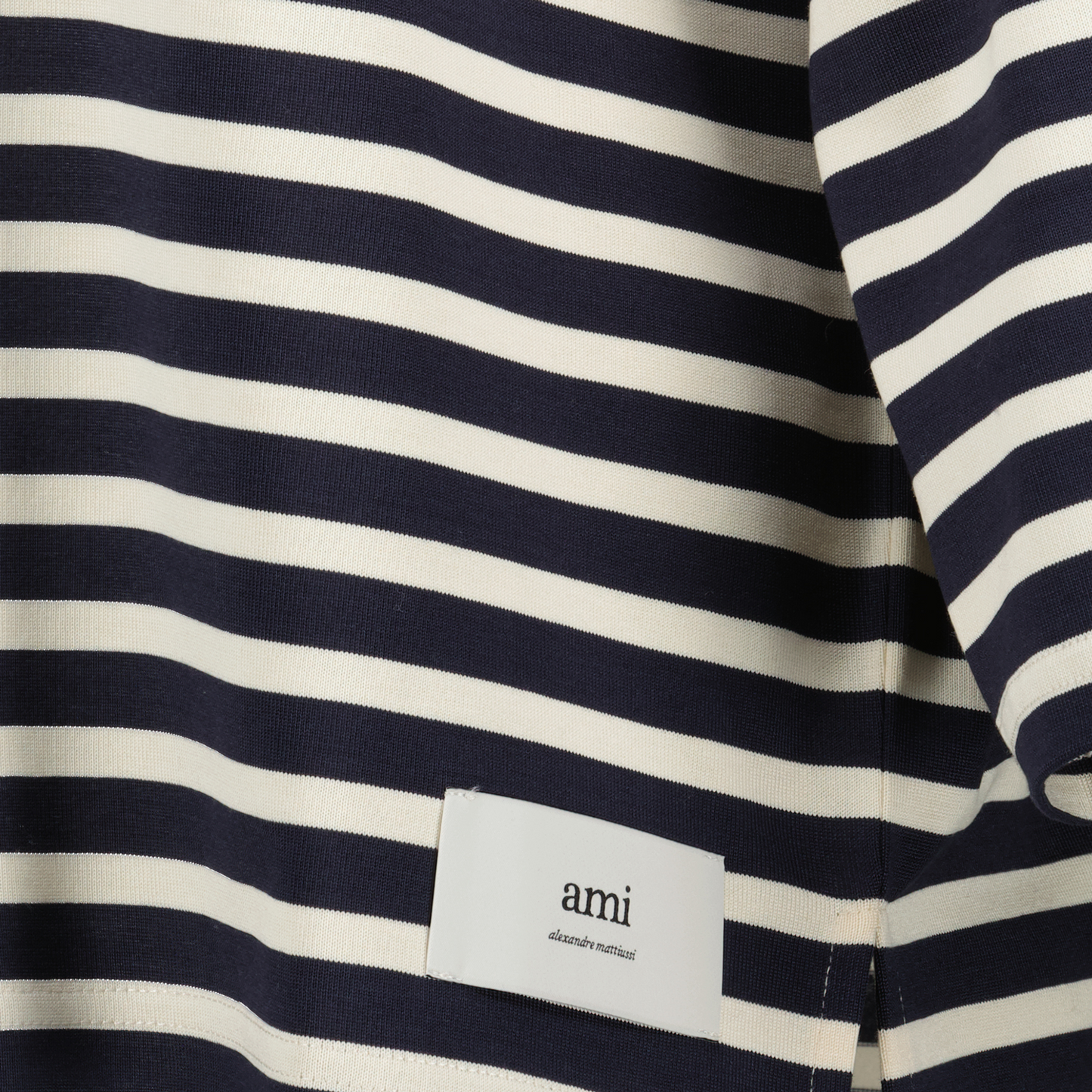 T-shirt rayé noir et blanc de la marque AMI Paris, conçu pour un genre unisexe. Ce modèle fait partie de la collection Printemps-Été 2025 et présente une coupe oversize en coton.
