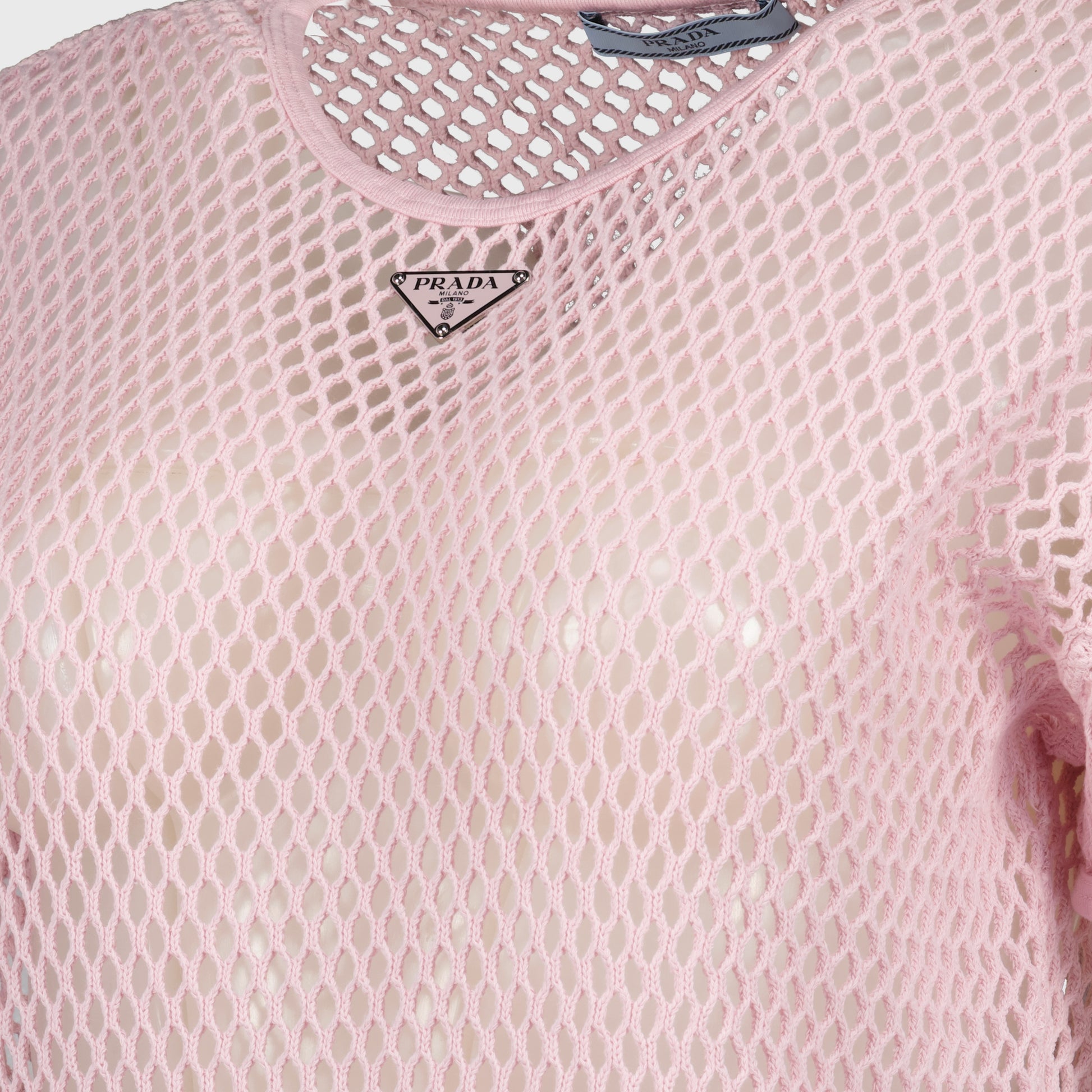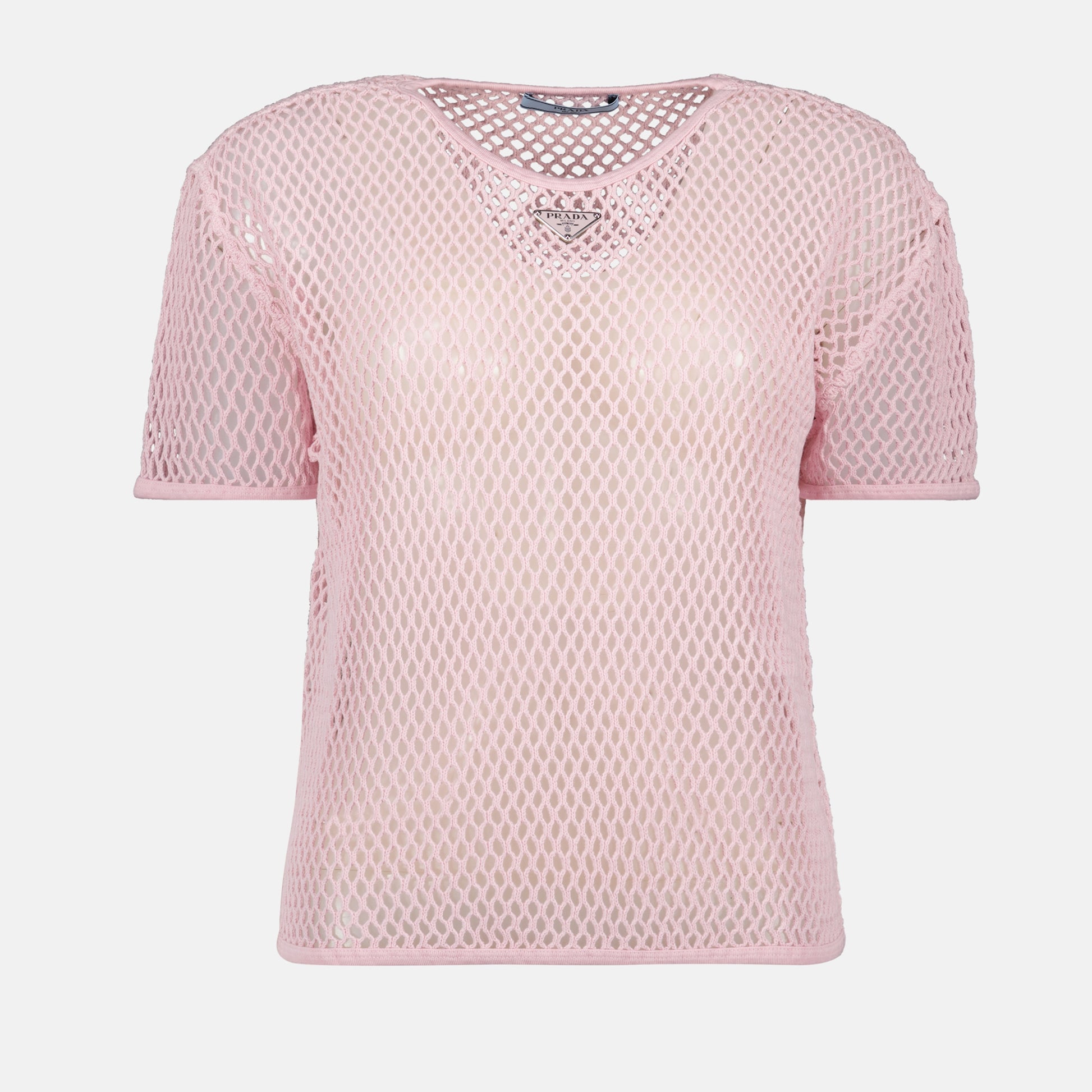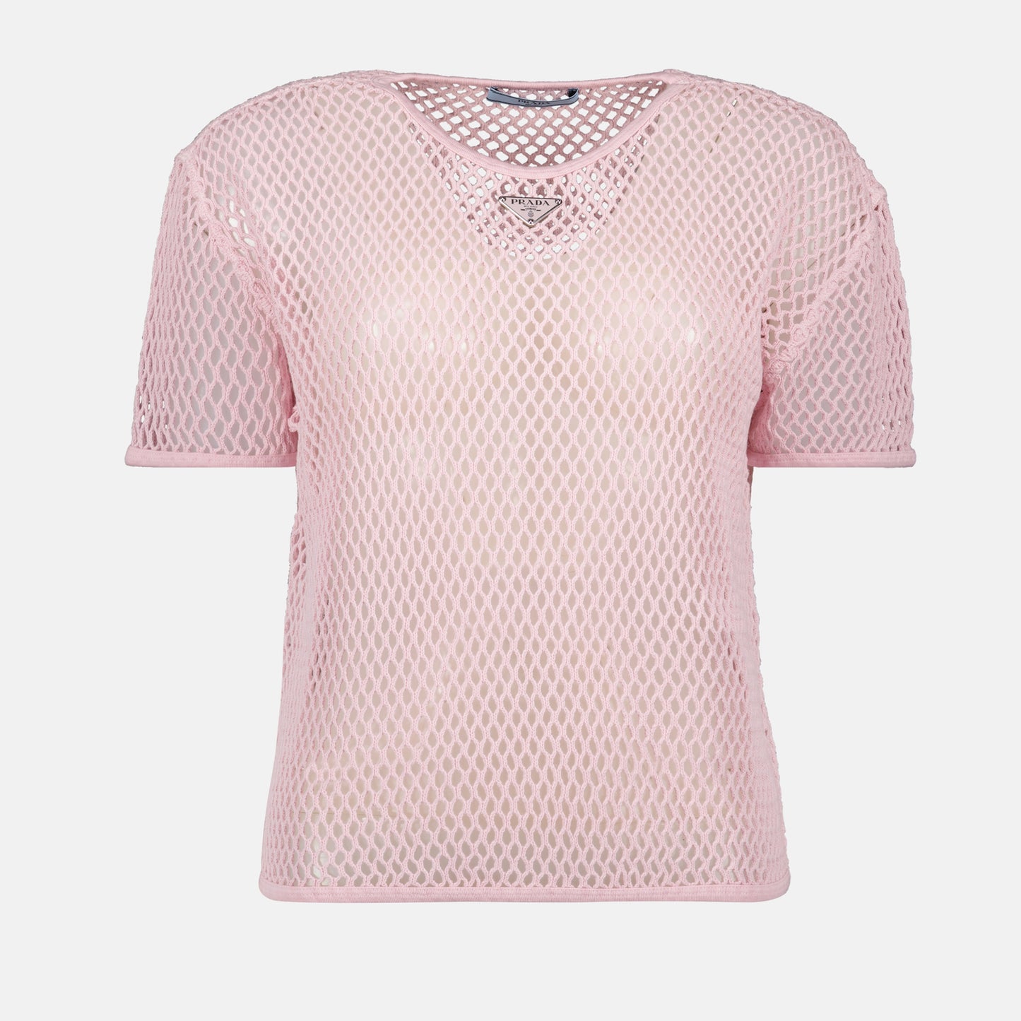 Top en mesh de coton rose de la marque Prada, conçu pour les femmes. Ce modèle fait partie de la collection Printemps-Été 2025 et présente un col rond et des manches courtes.