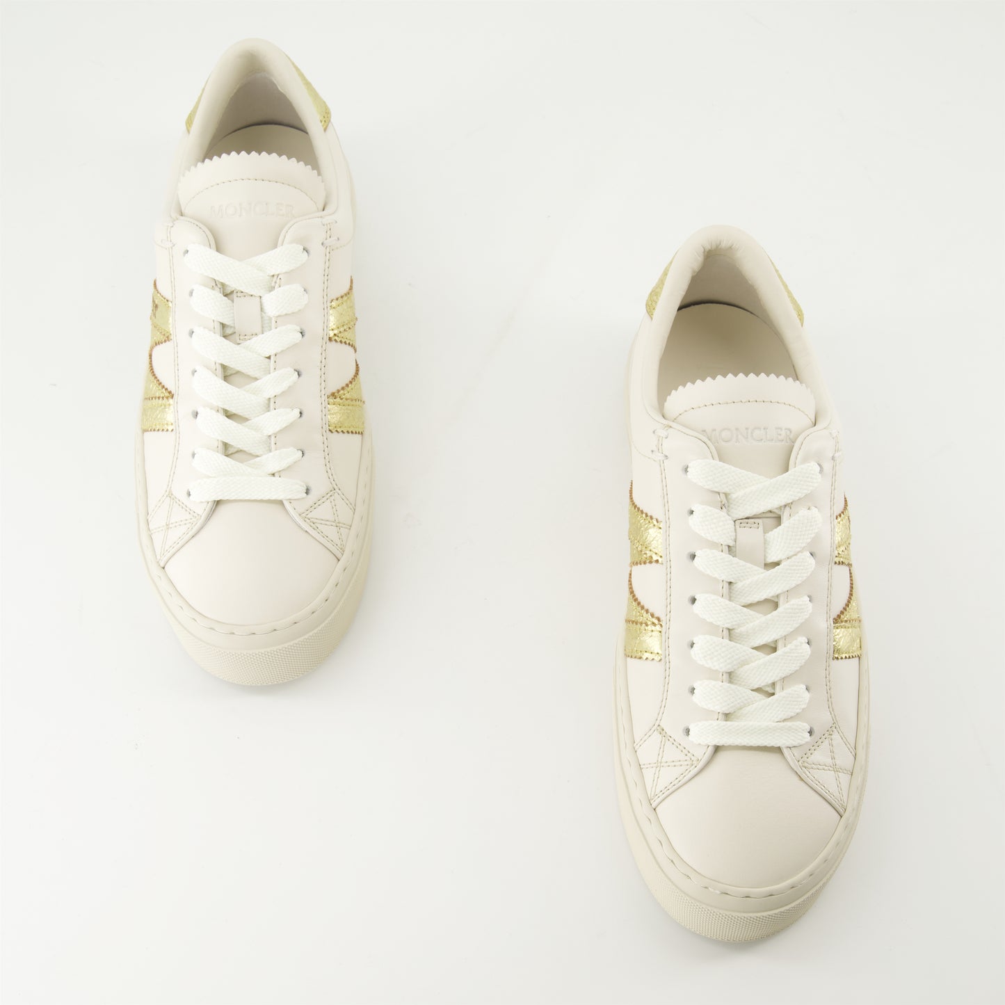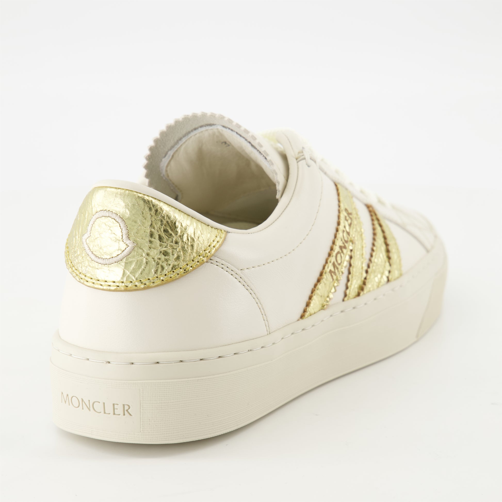 Baskets Monaco en cuir blanc et doré de la marque Moncler, conçues pour les femmes. Elles font partie de la collection Printemps-Été 2025 et présentent des détails dorés élégants.