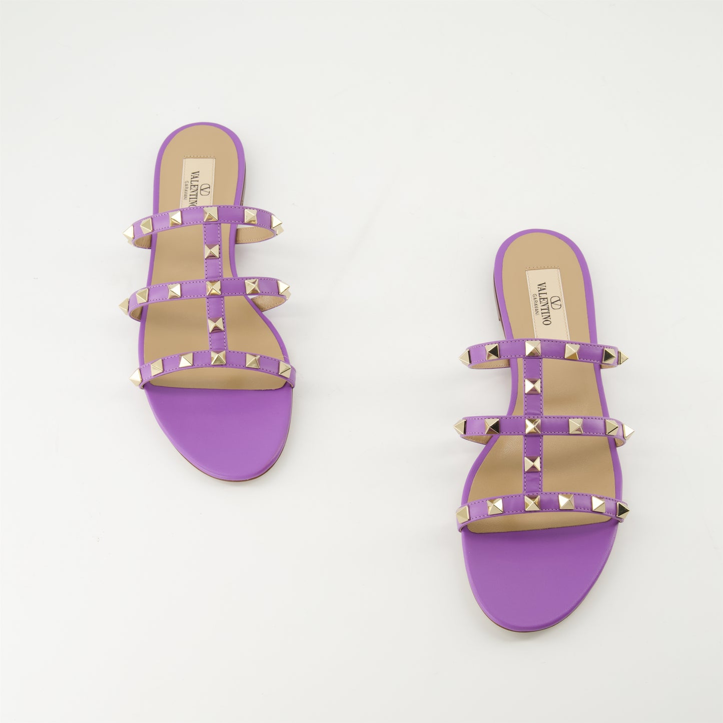 Sandales Rockstud en cuir violet de Valentino Garavani pour femme. Cette pièce fait partie de la collection Printemps-Été 2025 et se distingue par ses rockstuds et son design à trois brides.