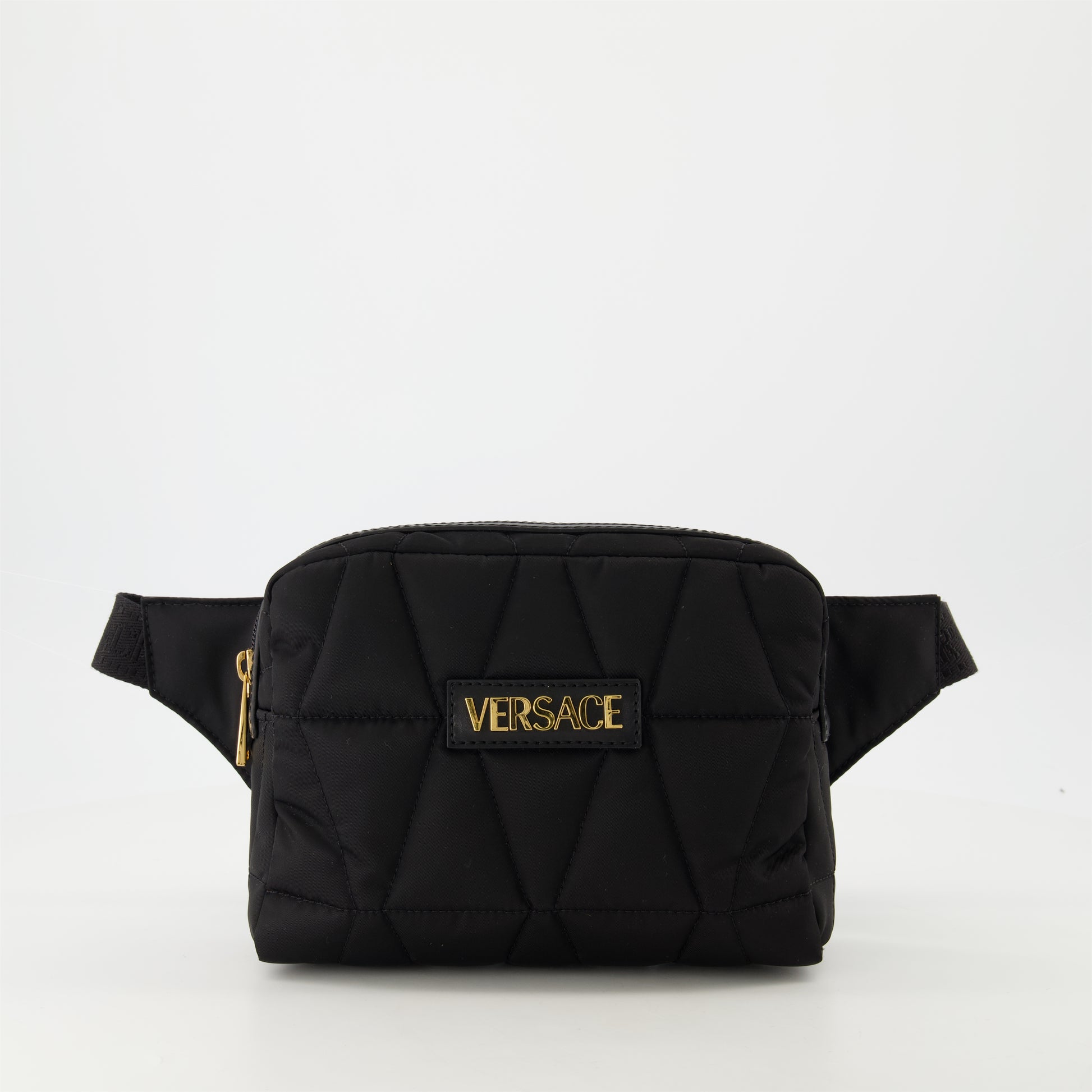 Sac banane en nylon matelassé de Versace pour homme, collection Printemps-Été 2025. Il présente une fermeture zippée, une bandoulière ajustable et un design en losanges matelassés.