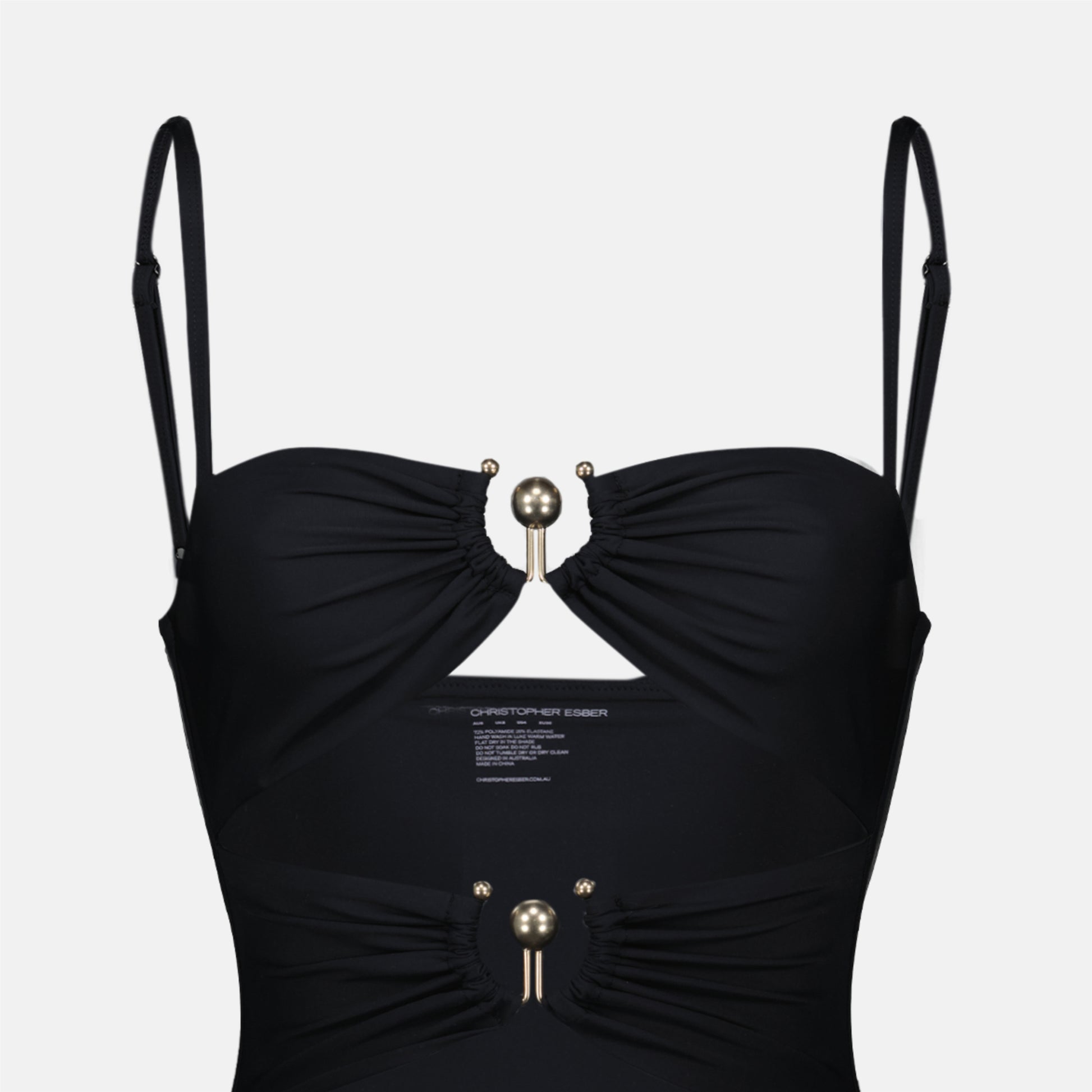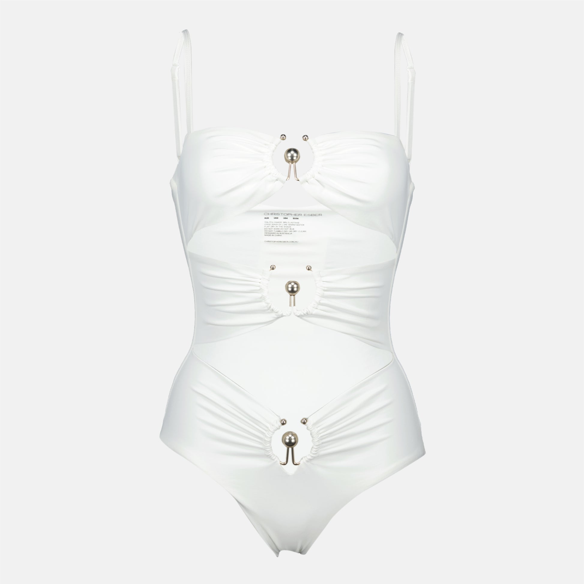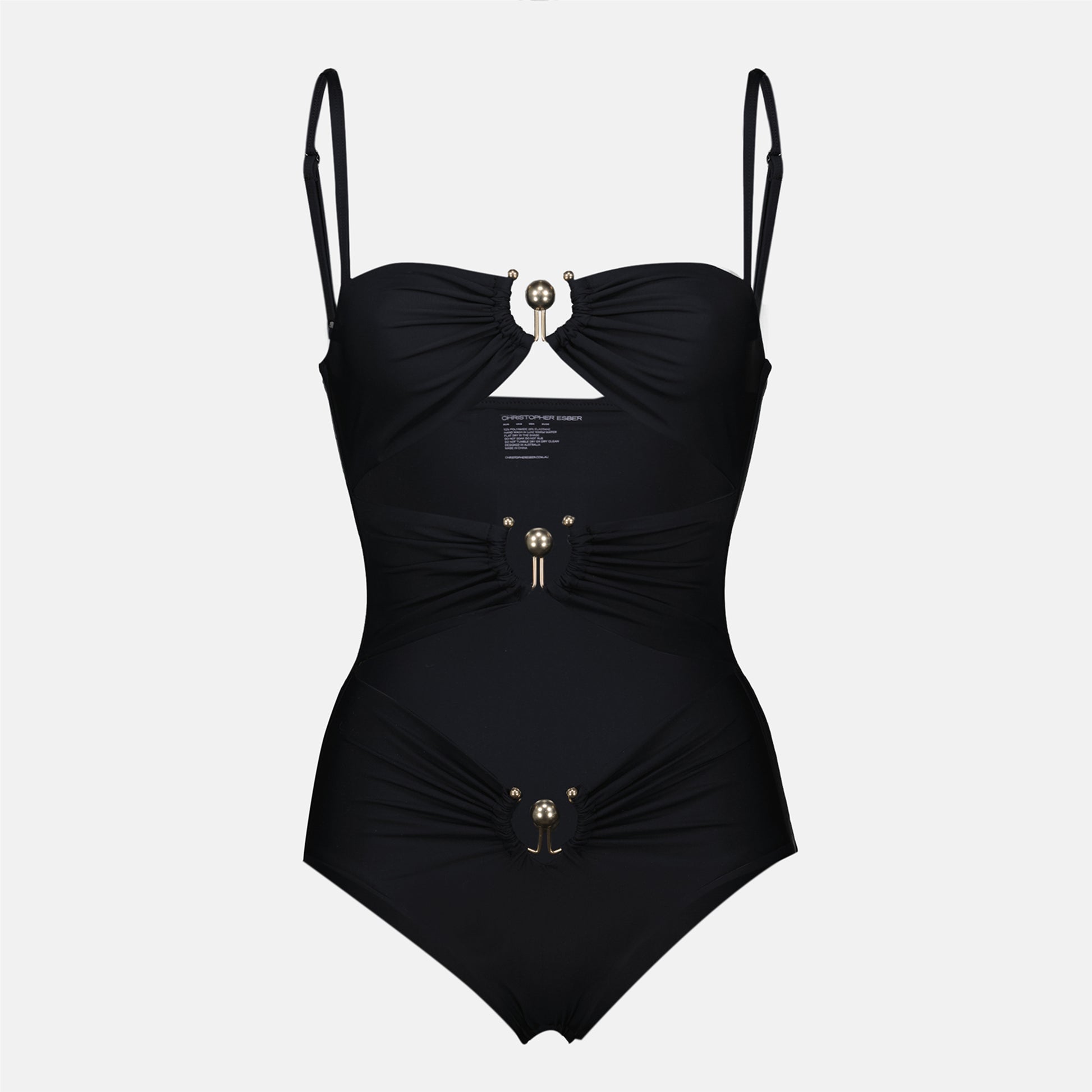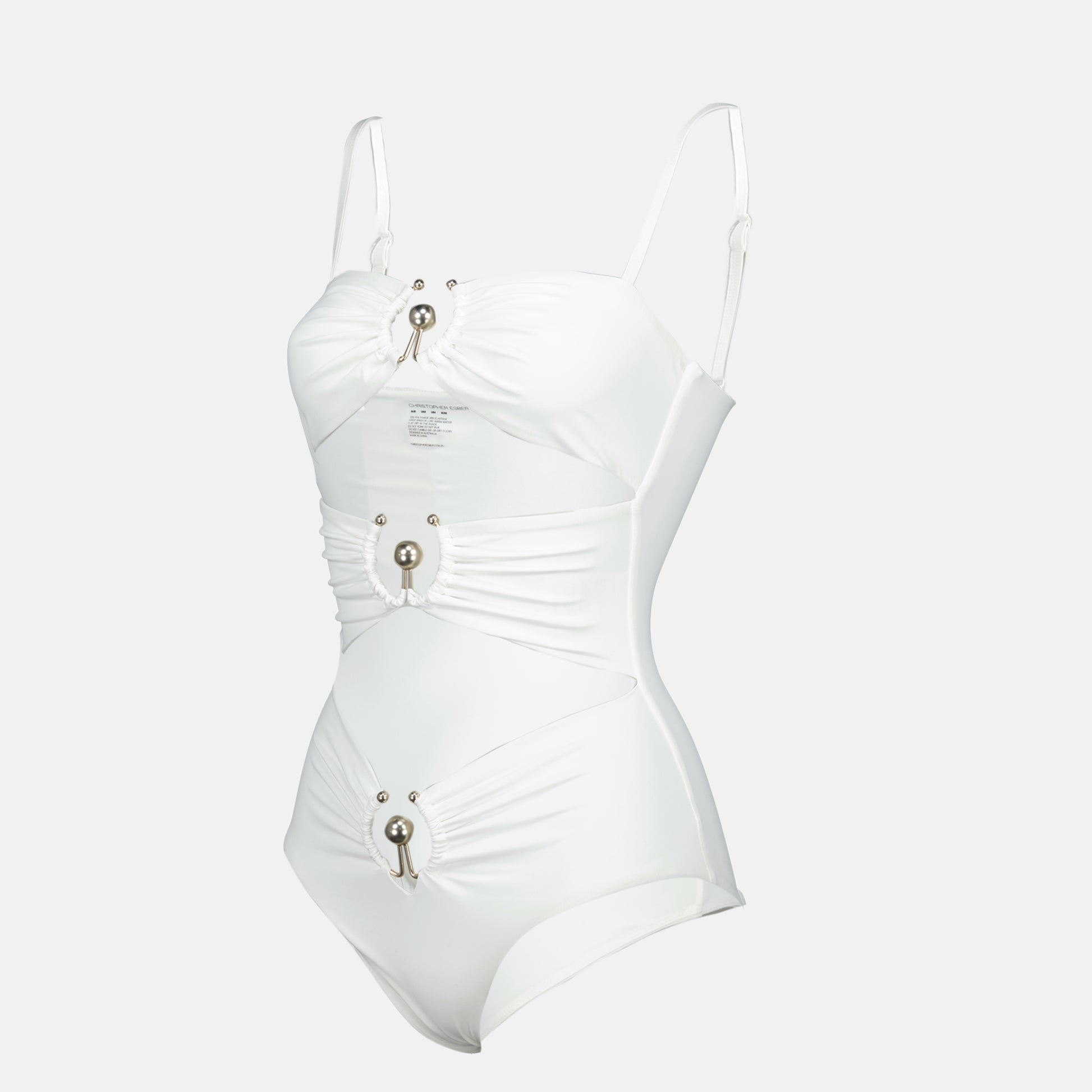 Backless dresses, one-piece swimsuits, or lightweight tops by Christopher Esber or MM6 kick off the selection, while Burberry trench coats, Moncler puffer jackets, or Khaite wool trousers set the stage for autumn. Logos remain present but subtle, as seen on AMI Paris sweaters or Saint Laurent shirts. Plays of volume, technical fabrics, or retro touches — like the checks at Burberry — add depth and contrast.