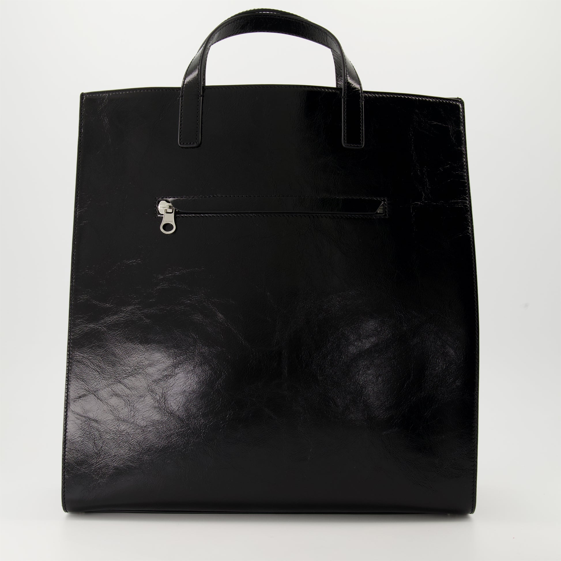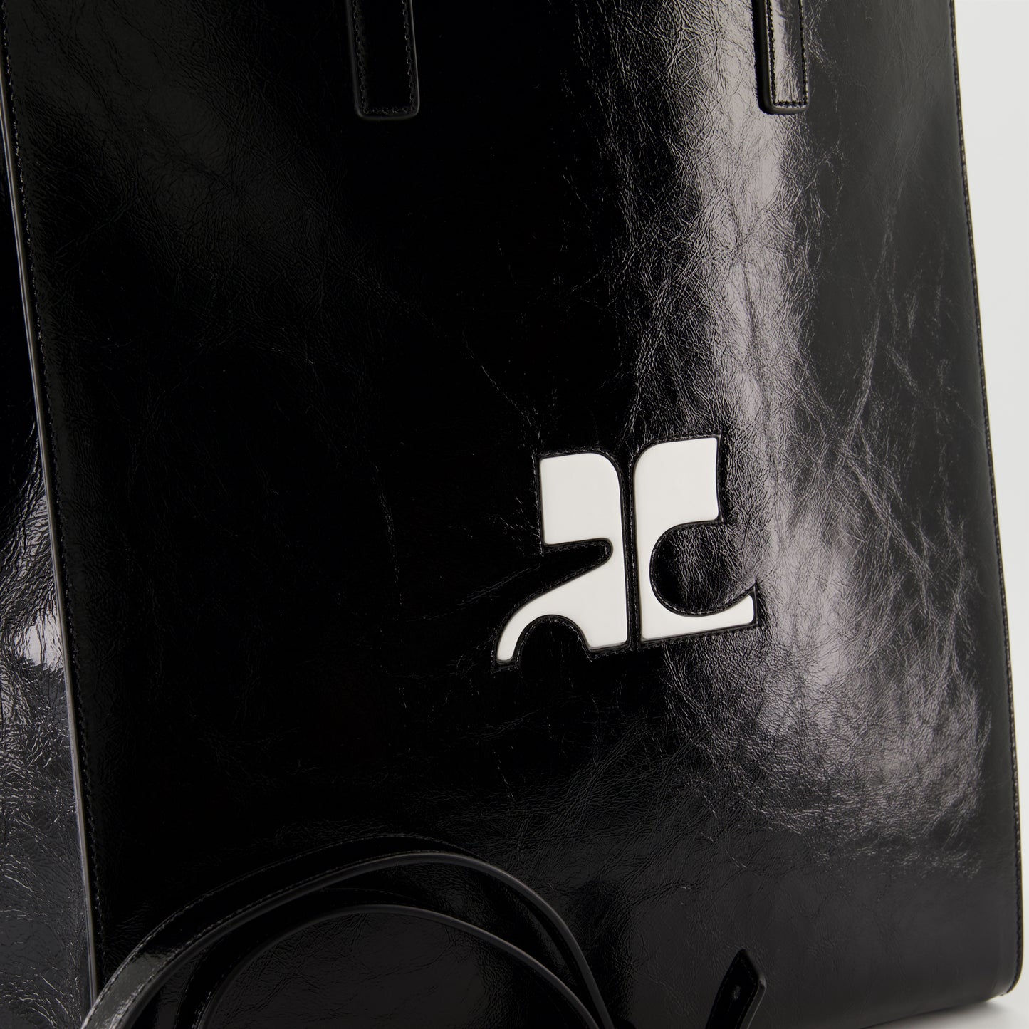 Sac cabas Héritage Courrèges collection Automne-Hiver 2024 pour Femme et Homme. Réalisé en cuir brillant. Article Couleur unie noir. Bandoulière ajustable et amovible et Poignées fixes.