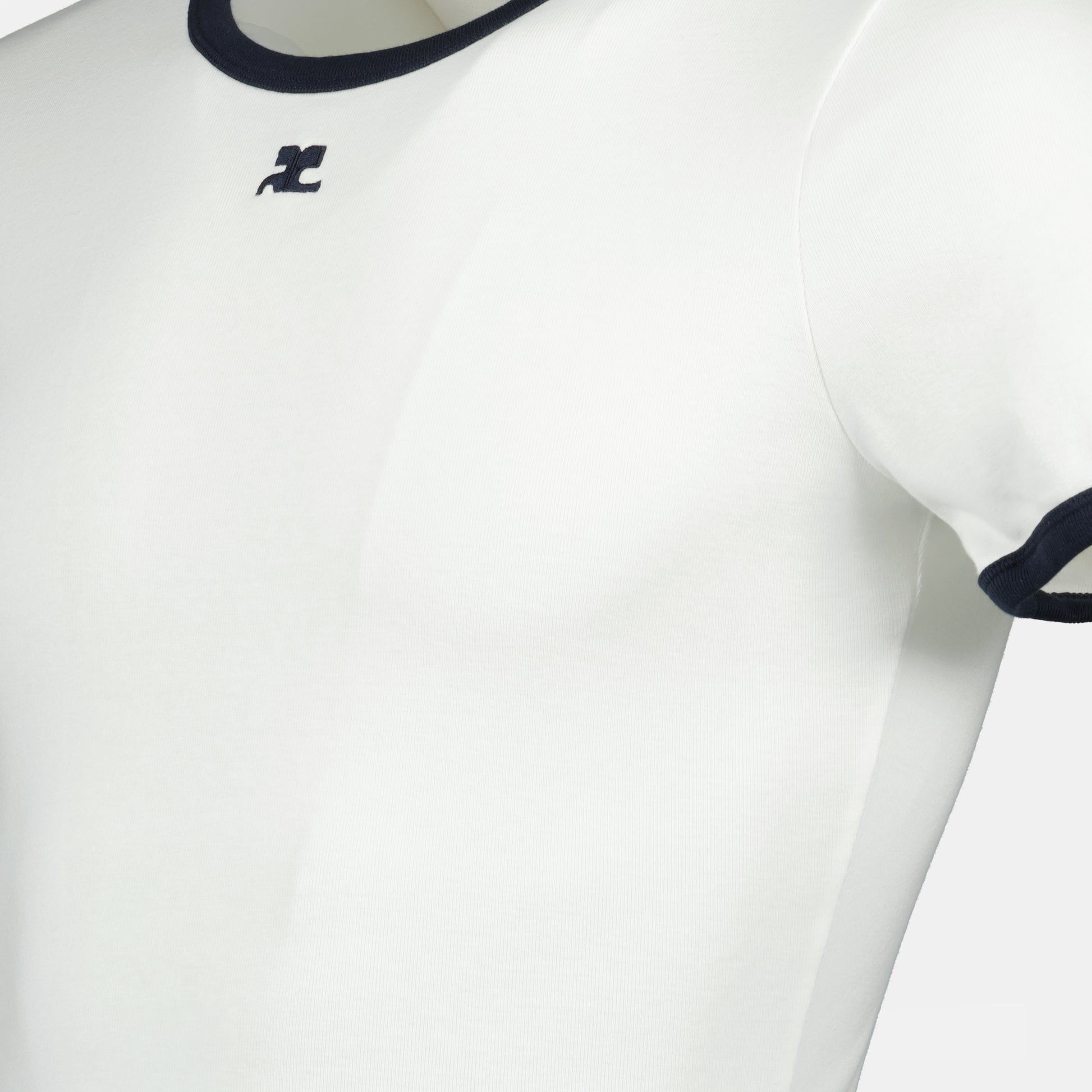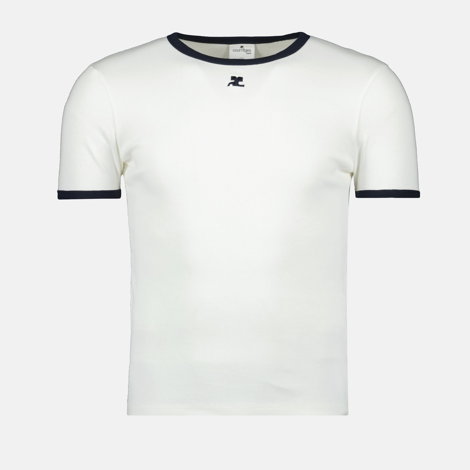 White and black signature T-shirt from the brand Courrèges, designed for men. This unisex model is part of the Spring-Summer 2025 collection and is made of cotton.