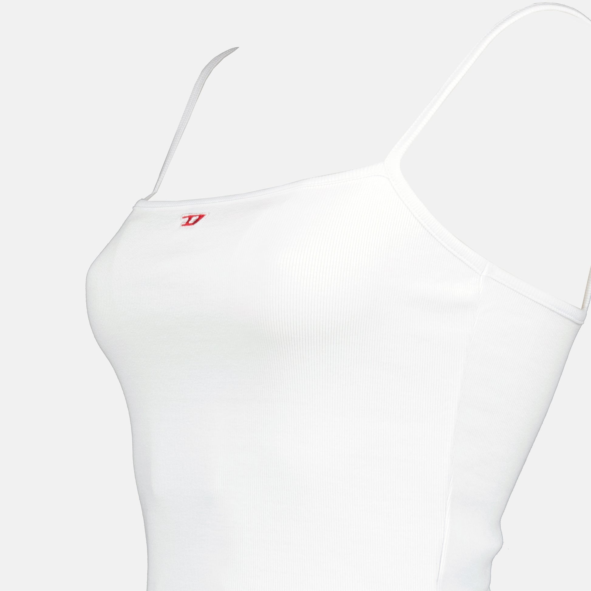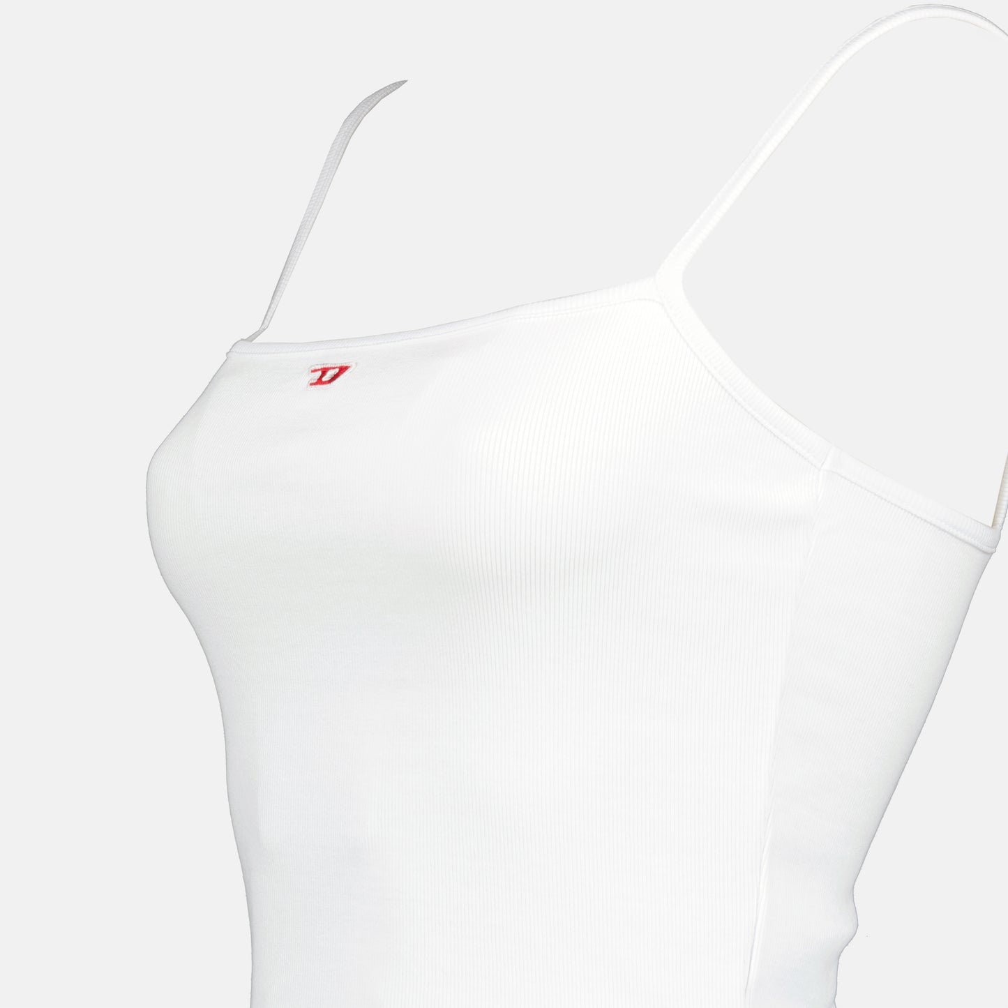 Débardeur T-Hop-D Diesel collection Automne-Hiver 2024 pour Femme. Réalisé en jersey stretch et côtelé. Article Couleur unie blanc. Encolure droite et Bretelles fines. Cet article est disponible en plusieurs déclinaisons.