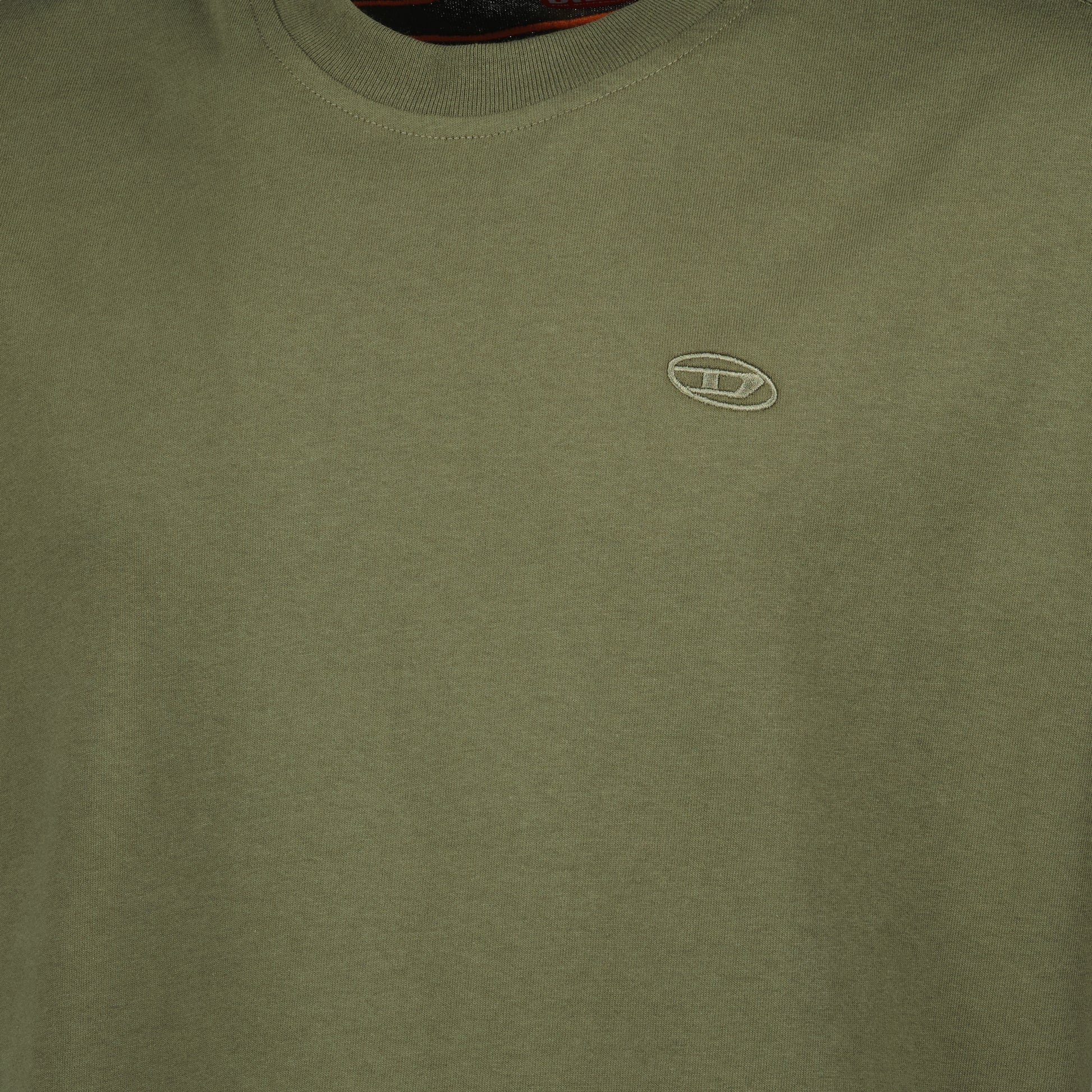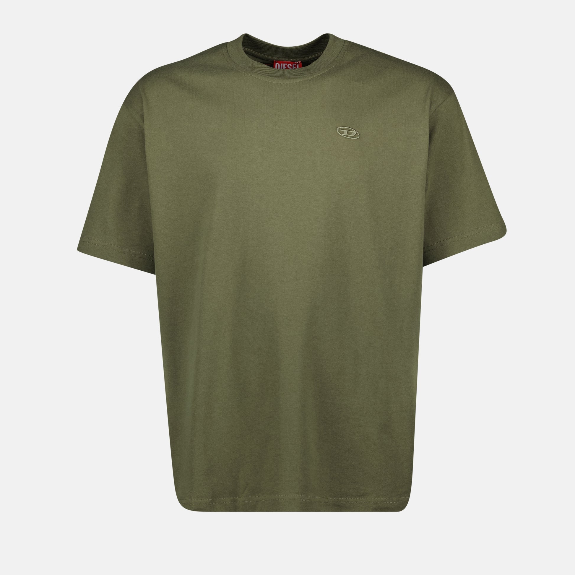 The khaki T-Boggy-Megoval T-shirt from Diesel is designed for men. It is part of the Spring-Summer 2025 collection and features an oversized cut with an embossed logo.