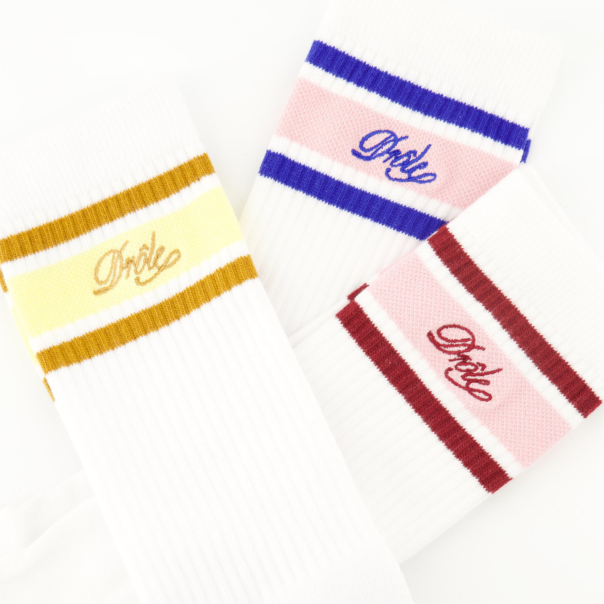 Lot de trois chaussettes Drôle de Monsieur pour homme de la collection Printemps-Été 2025. Elles sont en coton avec des rayures jaune, bleu et rouge sur fond blanc.