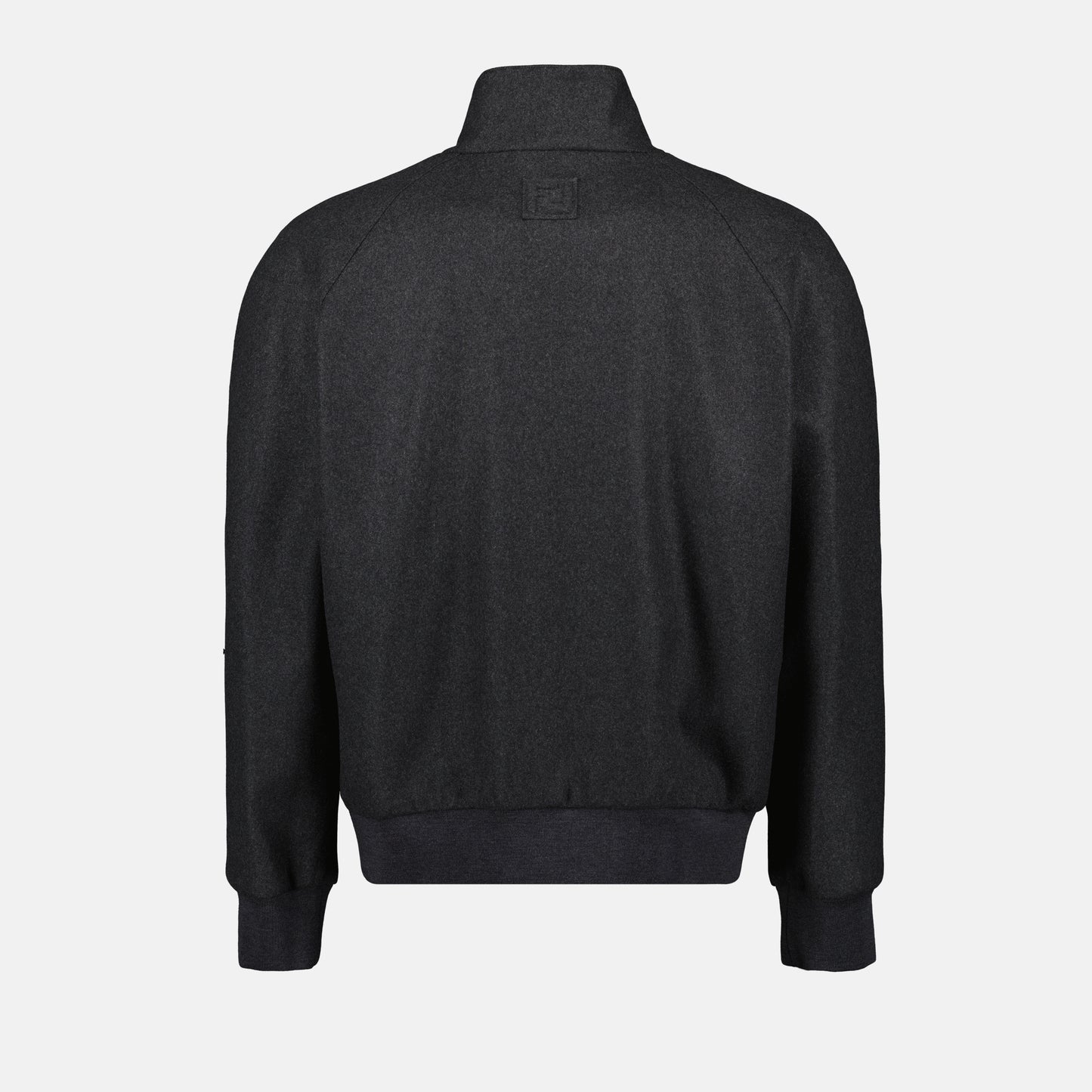 Cashmere bomber jacket from the Fendi Fall-Winter 2024 collection for men. Made from cashmere. Grey color. Buttoned collar and long sleeves.