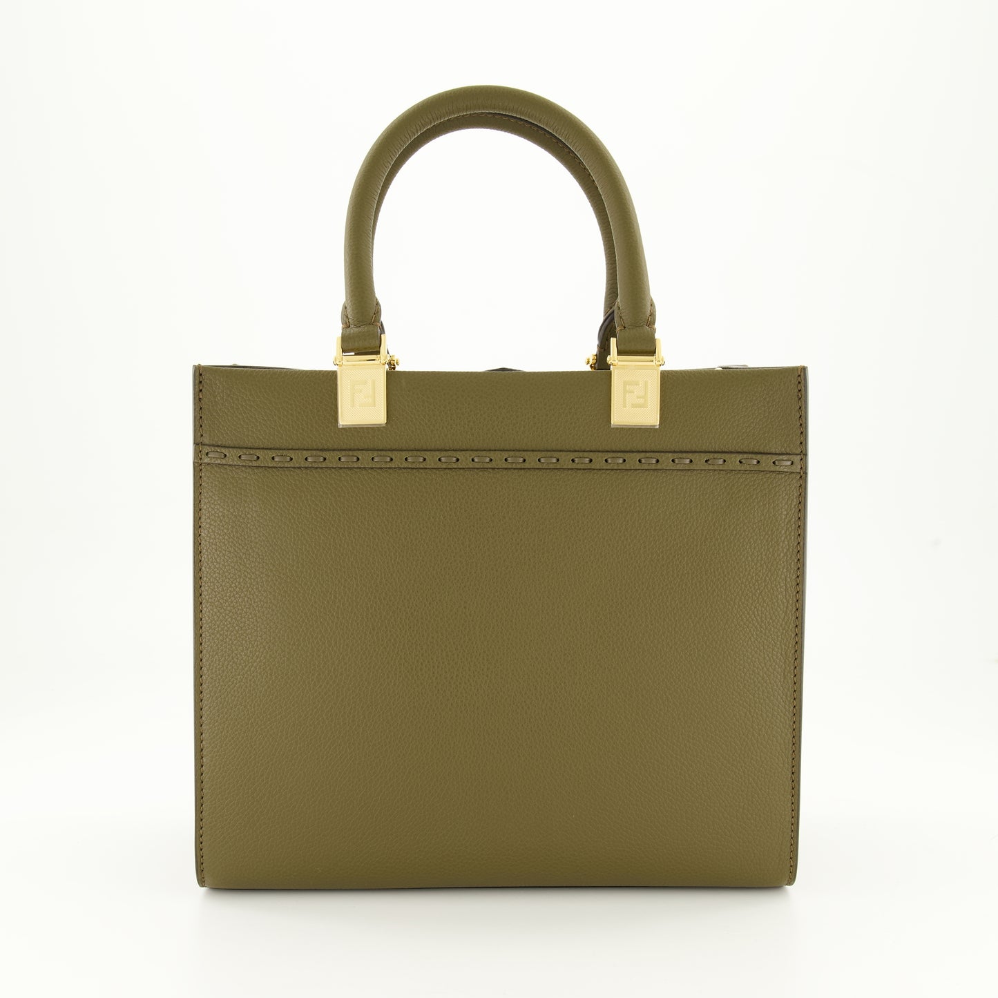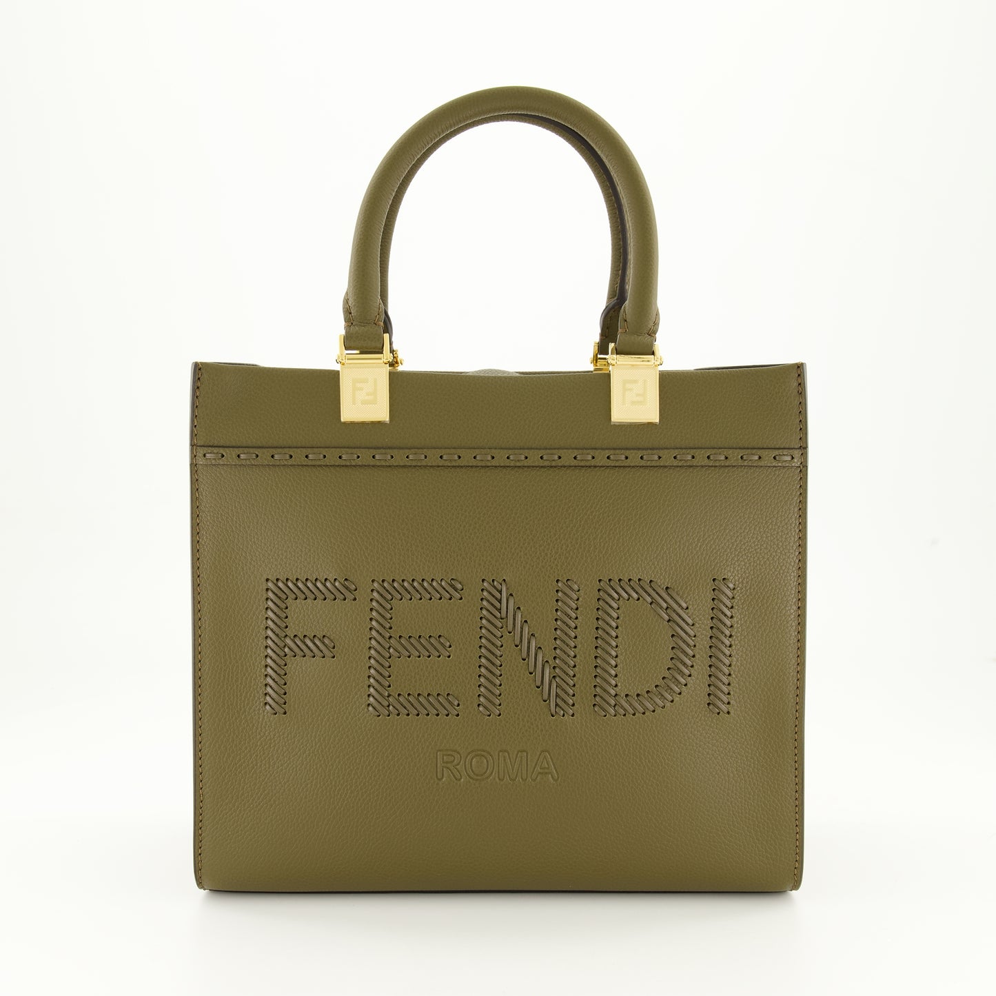 Mini sac Sunshine Fendi collection Automne-Hiver 2024 pour Femme. Réalisé en cuir lisse. Article Couleur vert kaki. Bandoulière ajustable et amovible et Poignées fixes.