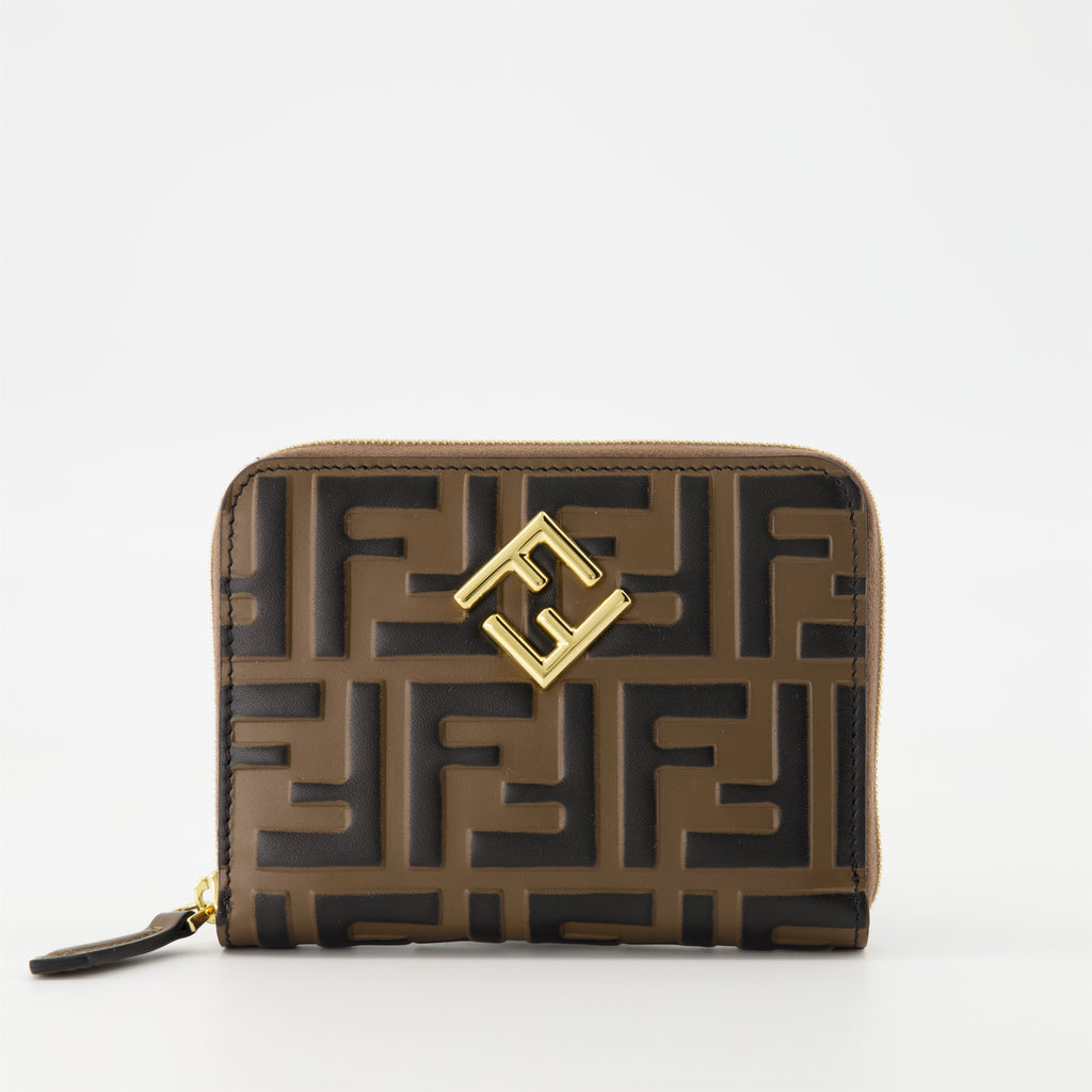 Brown FF Diamonds zipper wallet from Fendi for women. It is part of the Spring-Summer 2025 collection and is made of calf leather with a black embossed FF print.