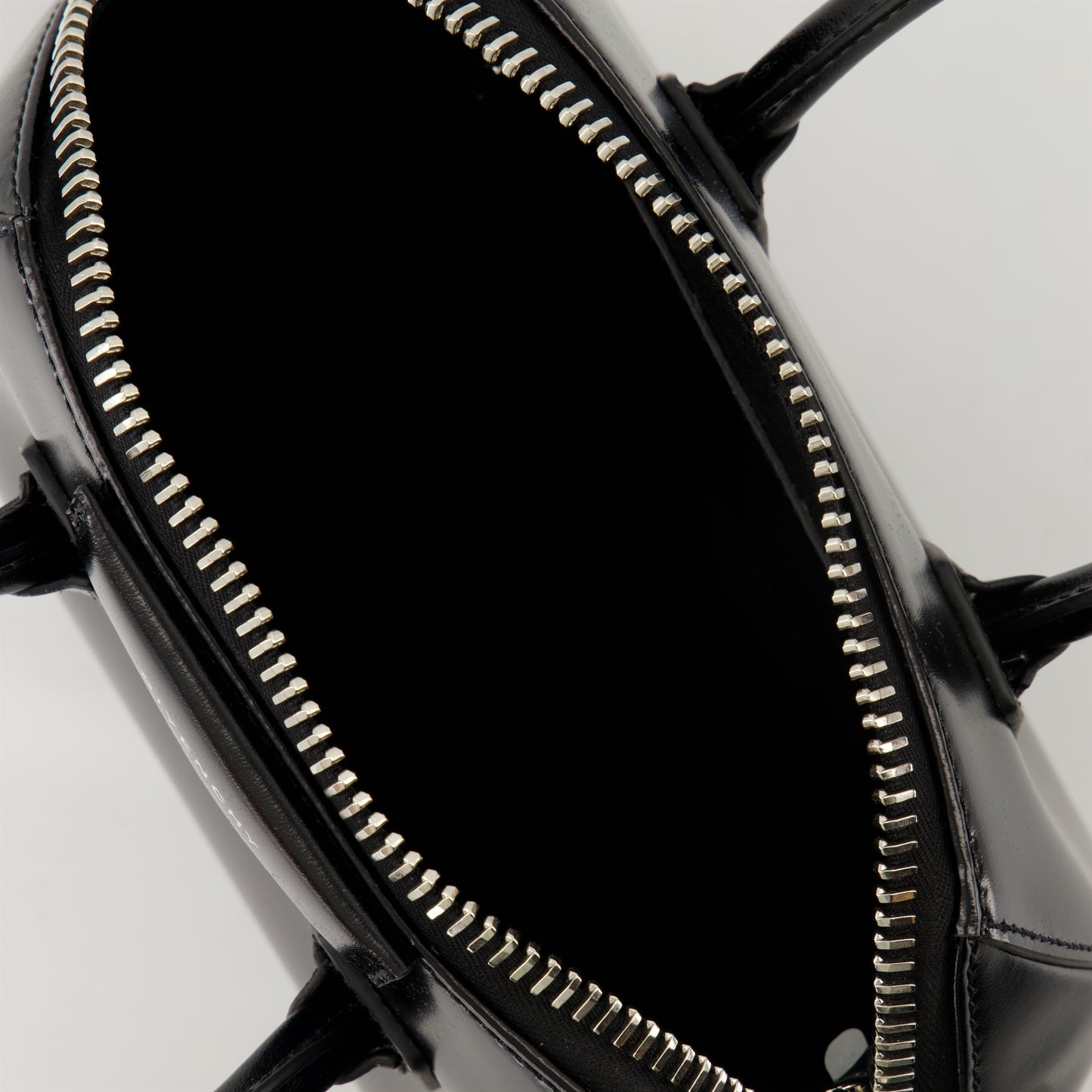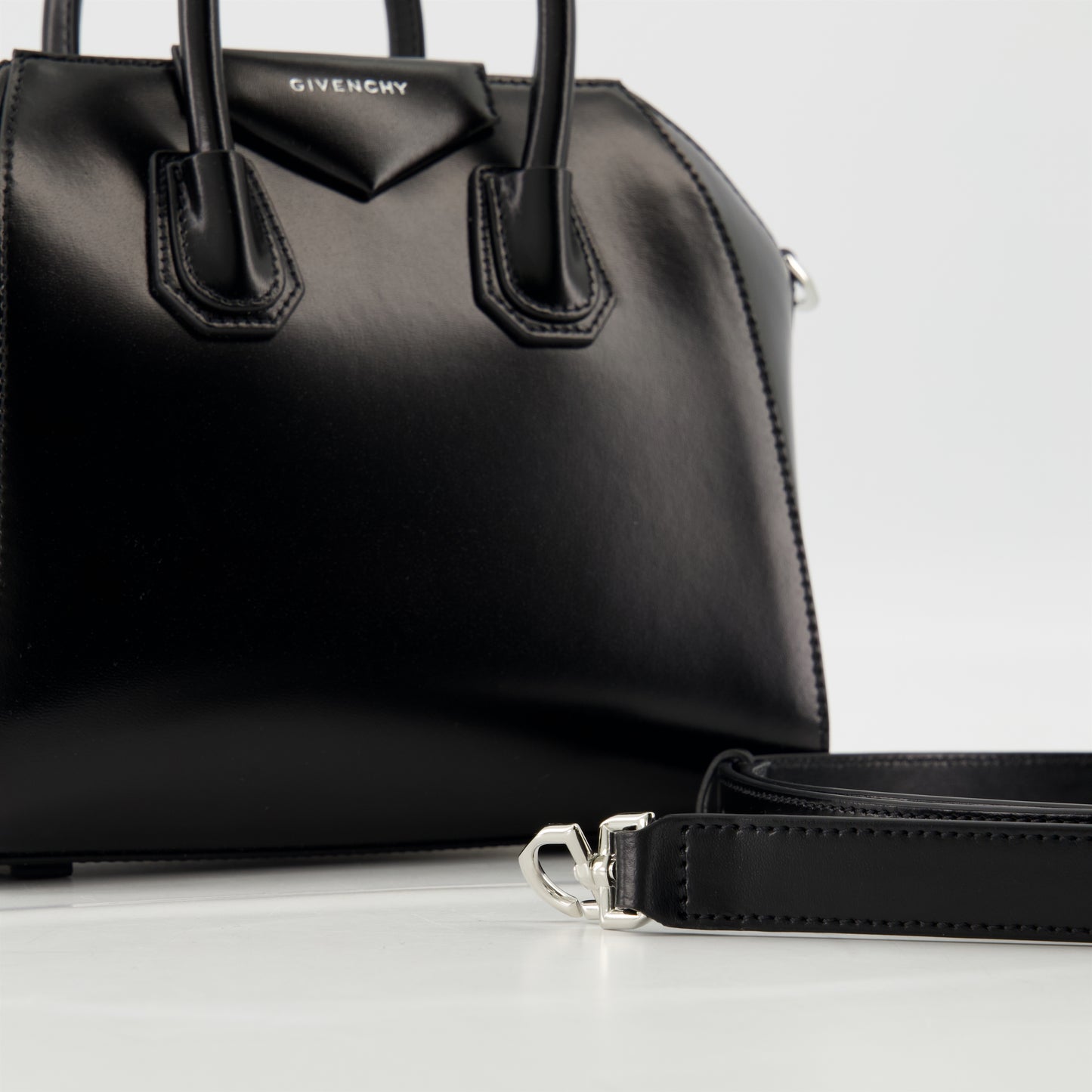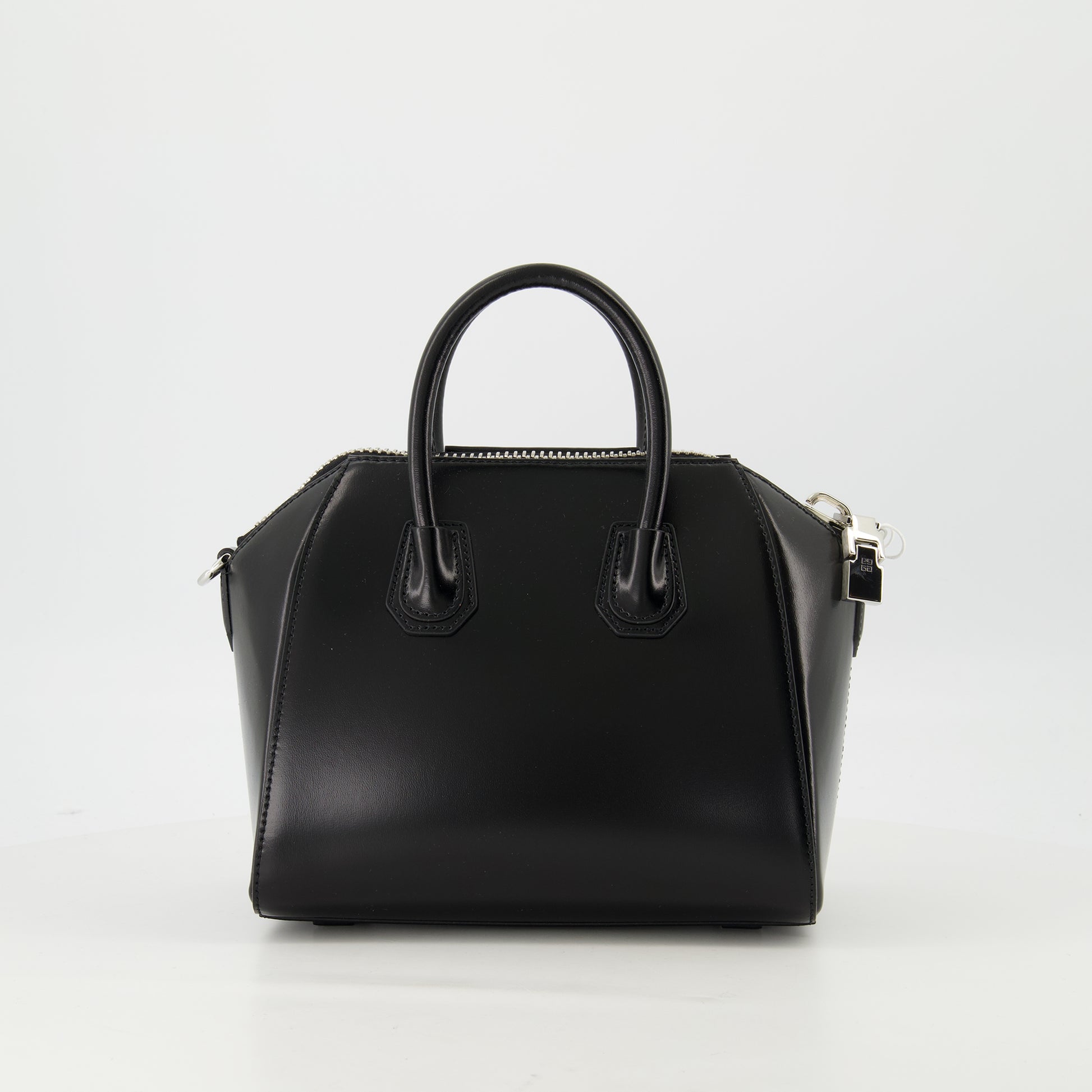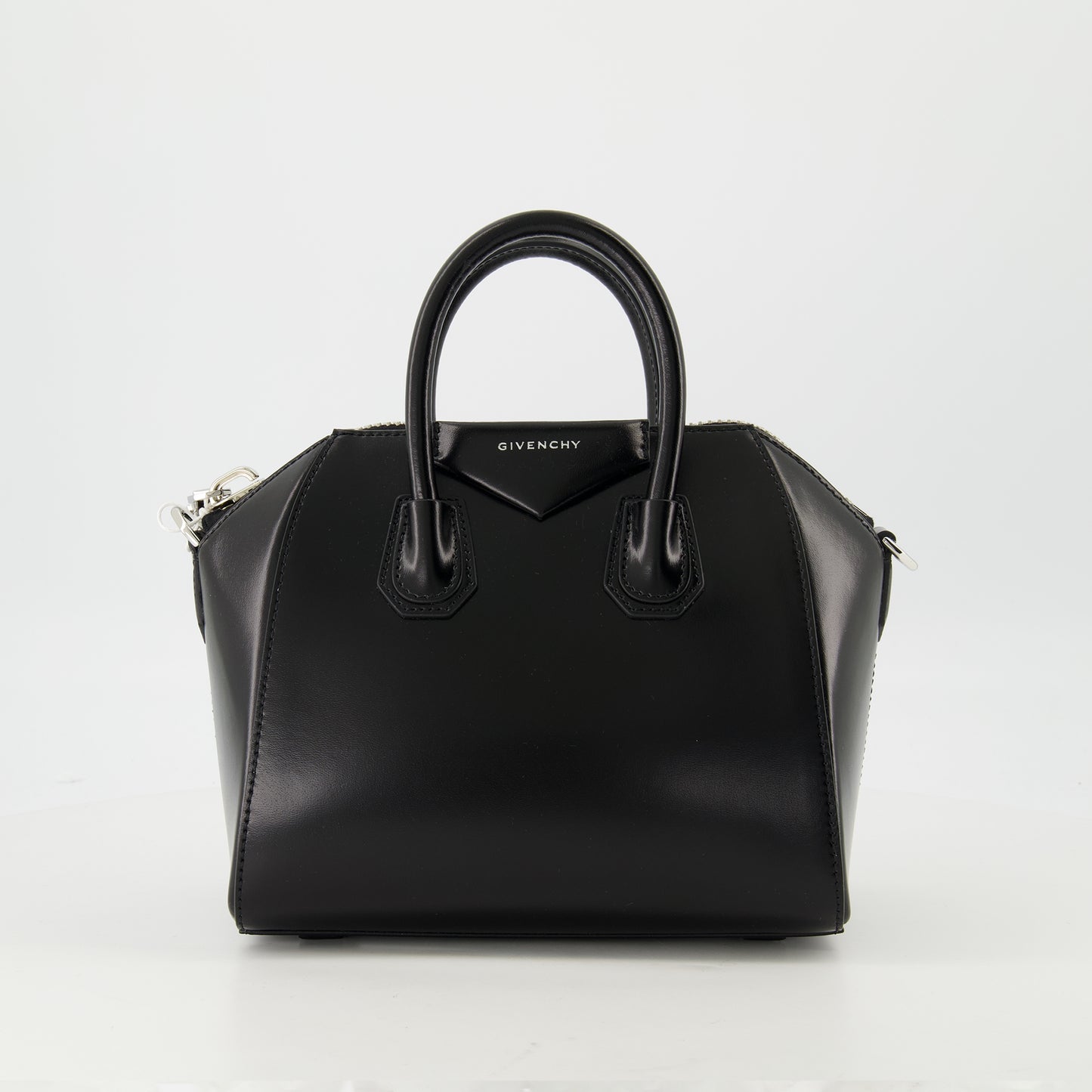 Mini Antigona bag in Box leather from Givenchy for women, Spring-Summer 2025 collection. It features a zip closure, an adjustable shoulder strap, and a metallic lettering logo.