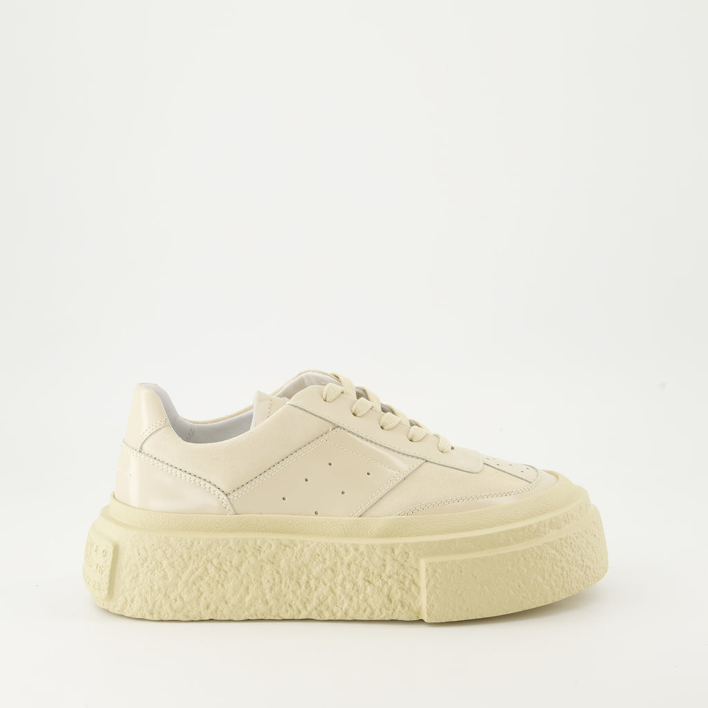 MM7 platform sneakers from the Autumn-Winter 2024 collection for Women. Made of glossy leather. Item Color beige. Round toe and Thick sole.