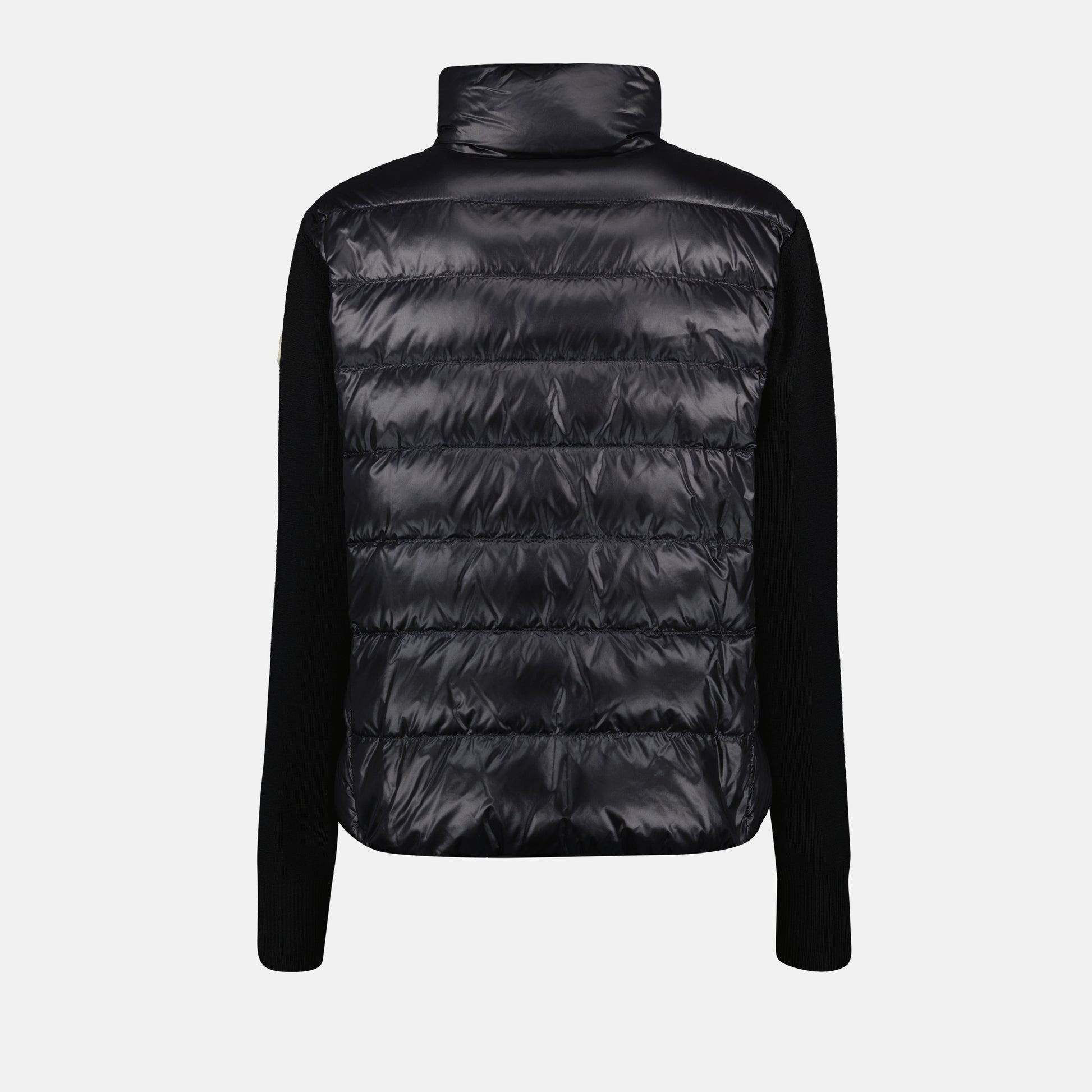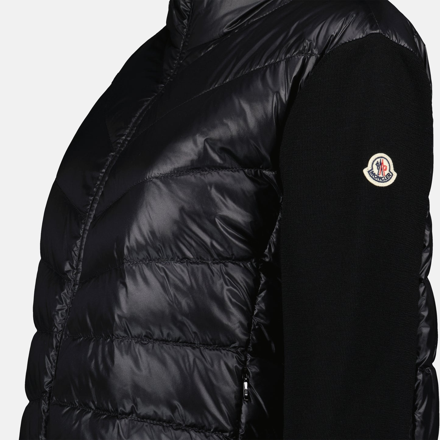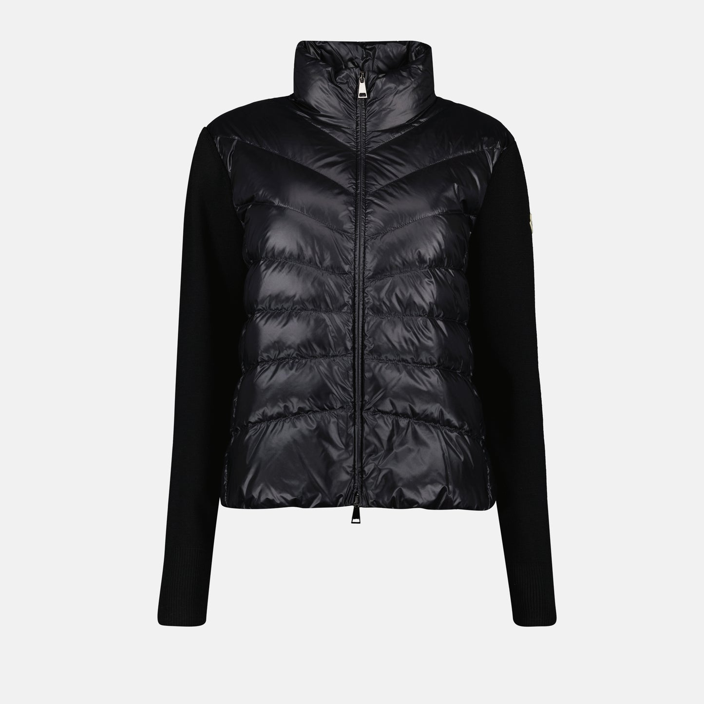 Bi-material jacket from the Moncler Autumn-Winter 2024 collection for Women. Made of nylon and wool. Item Color: black. Standing collar and long sleeves.