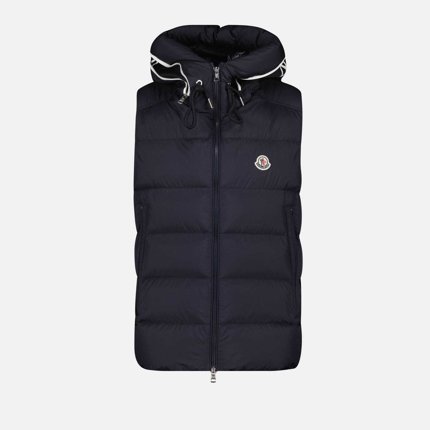 Cardamine sleeveless down jacket from Moncler for men, perfect for autumn-winter 2024. Made from navy blue polyester, it features a high collar and zipped side pockets.