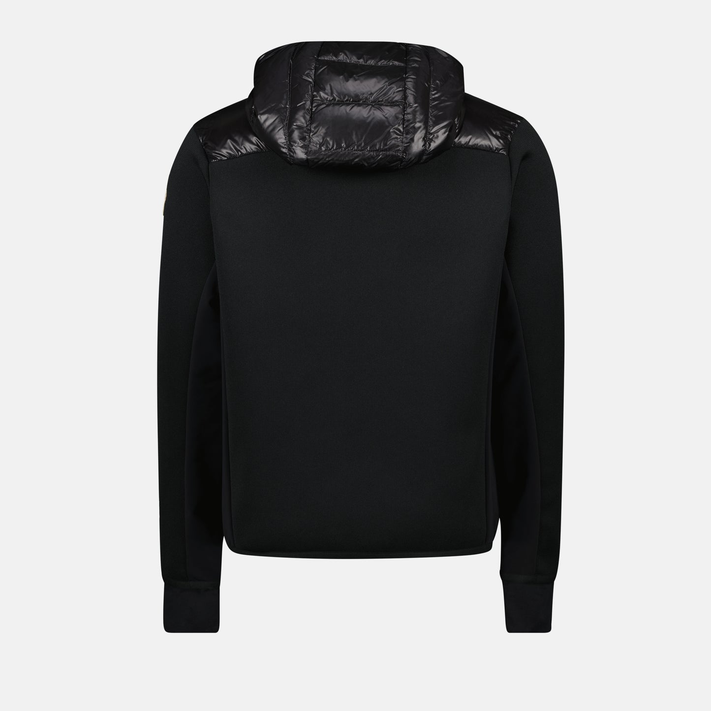 Veste bi-matière noire de Moncler Grenoble pour homme, collection Automne-Hiver 2024. Elle présente un col montant, des manches longues et un design élégant en nylon brillant et matelassé.
