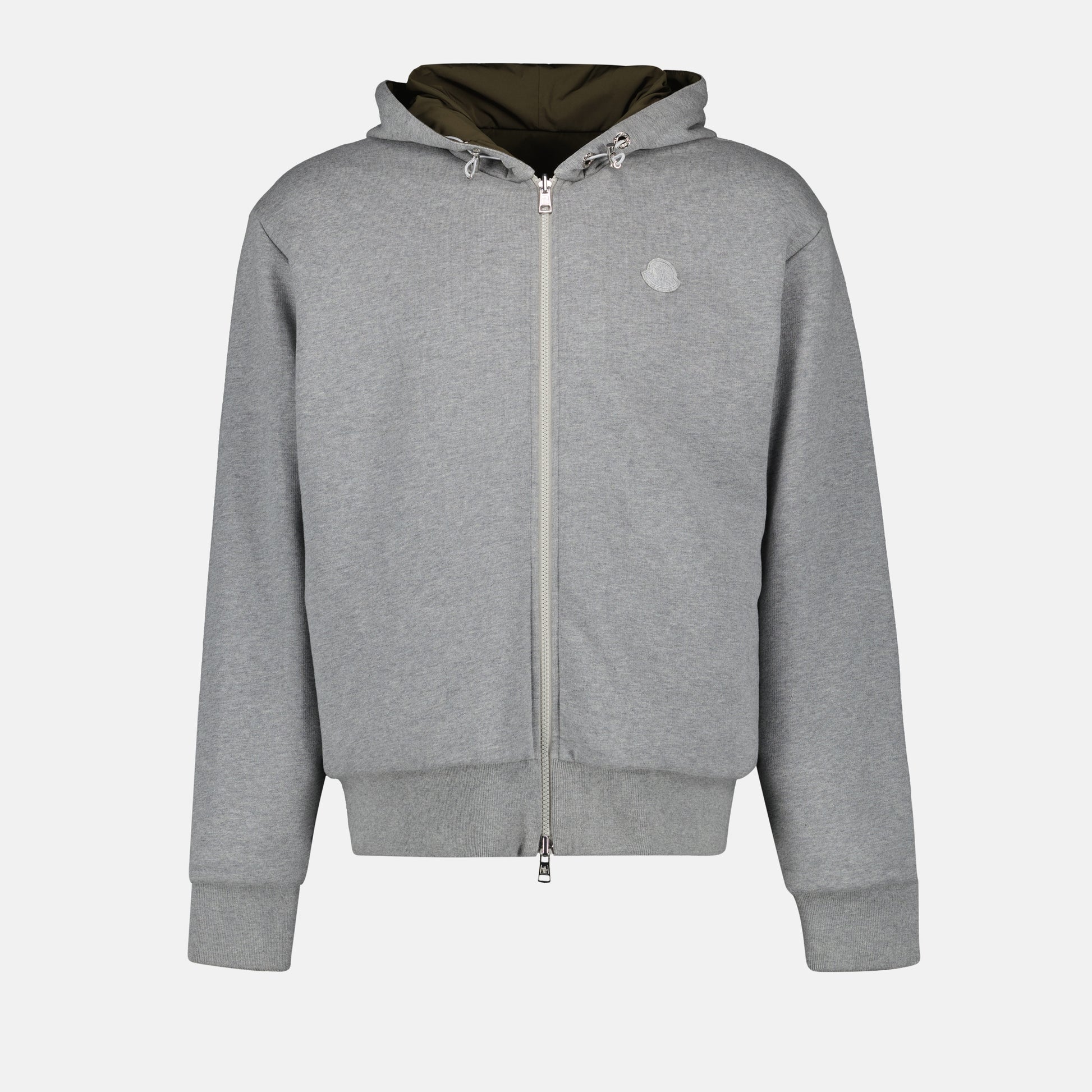Reversible zip sweatshirt in khaki and gray from Moncler for men, part of the Autumn-Winter 2024 collection. It features an oversized fit, an adjustable hood, and side slit pockets.