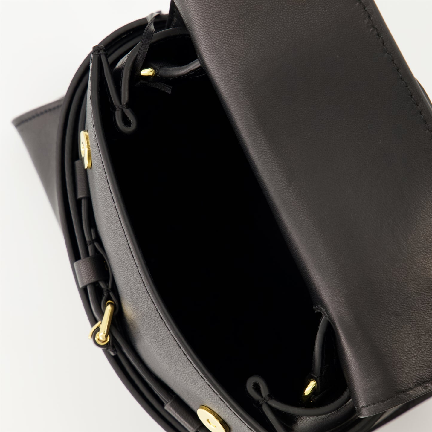 The black Tie Me small bag from Moschino is an elegant accessory for women. It is part of the Spring-Summer 2025 collection and is made of nappa lamb leather.