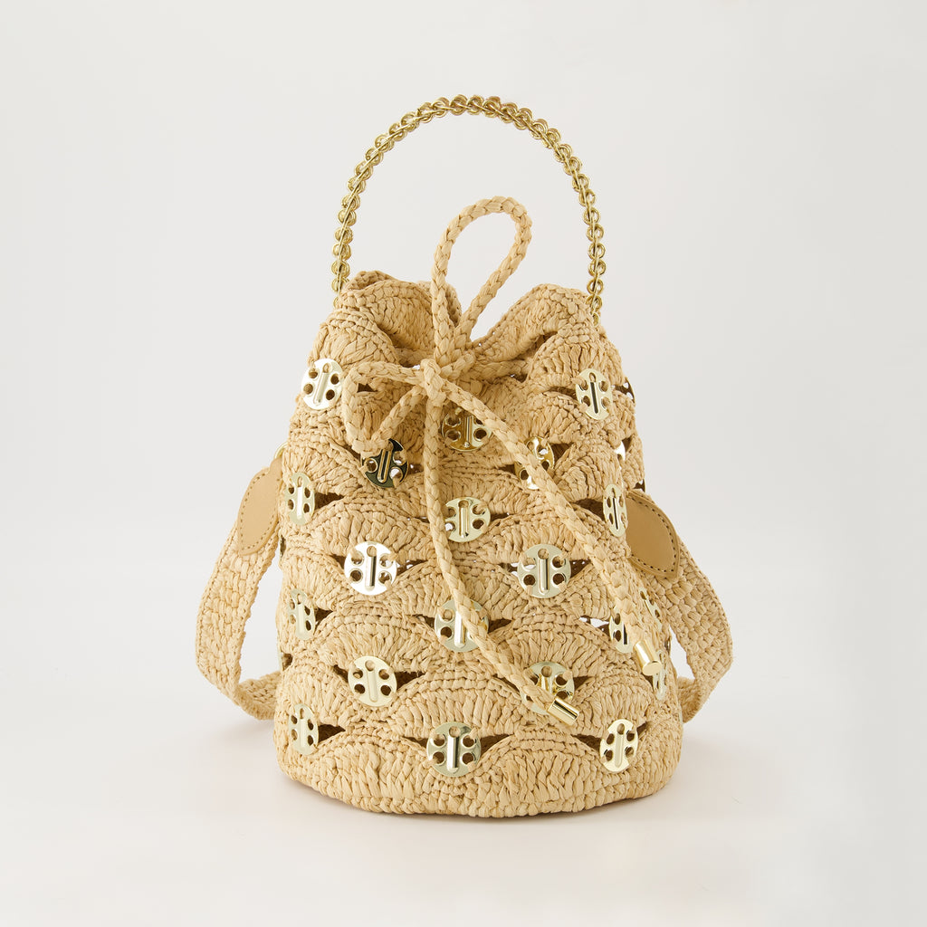 The signature 1969 raffia bucket bag from Rabanne is an elegant women's accessory. It is part of the Spring-Summer 2025 collection and features refined details.