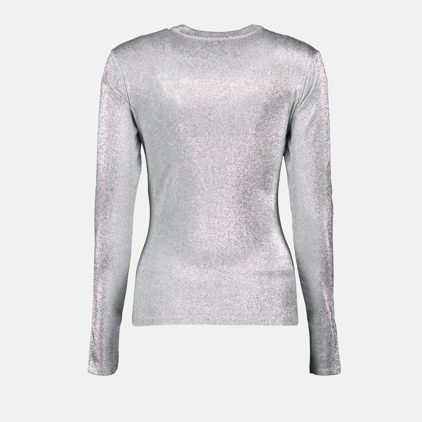 Draped lurex top from the Rabanne Autumn-Winter 2024 collection for Women. Made of lurex. Silver-colored item. Round neck and long sleeves. This item is available in several variations.