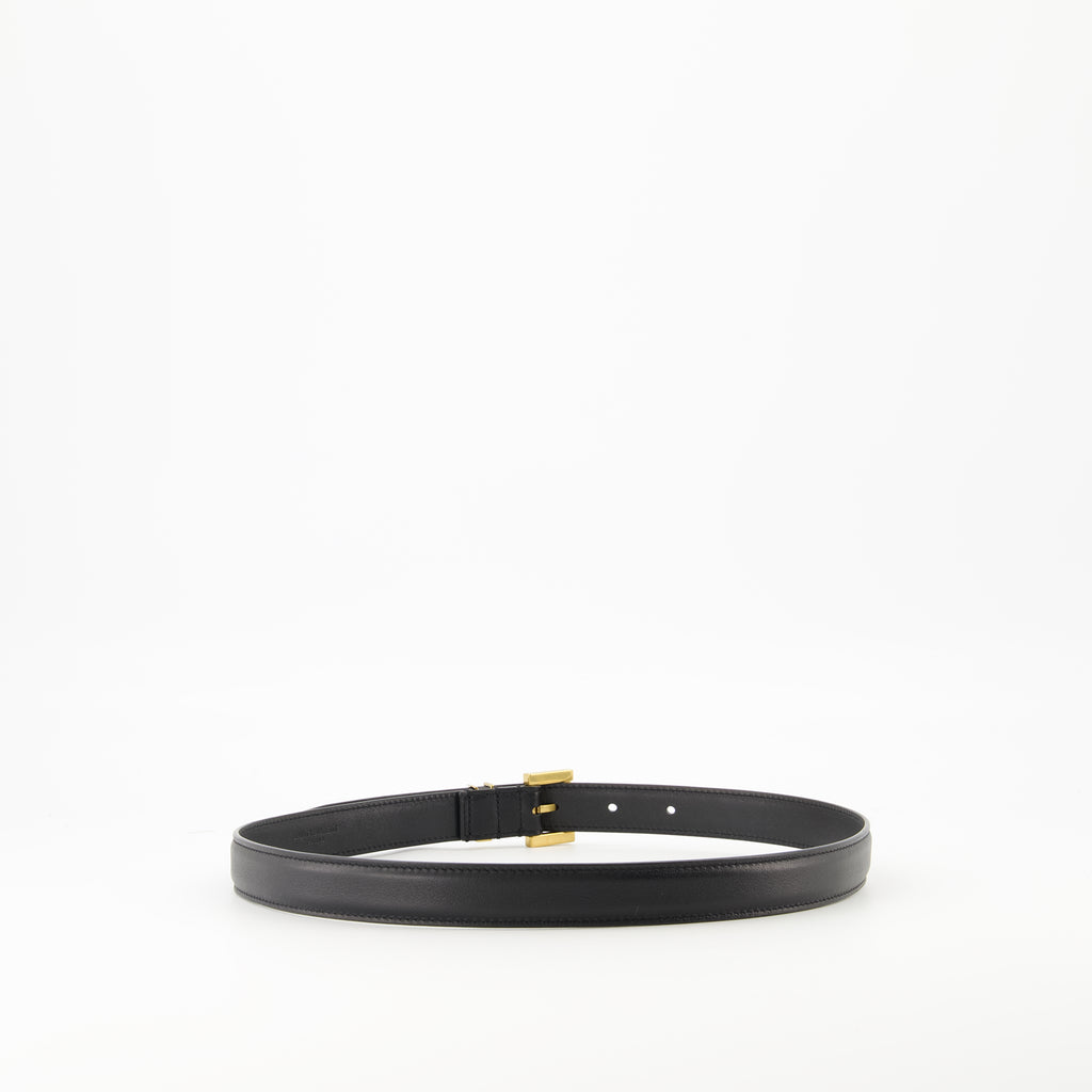 The black Cassandre fine belt from Saint Laurent is an elegant accessory for women. Made from calf leather, it is part of the Spring-Summer 2025 collection.