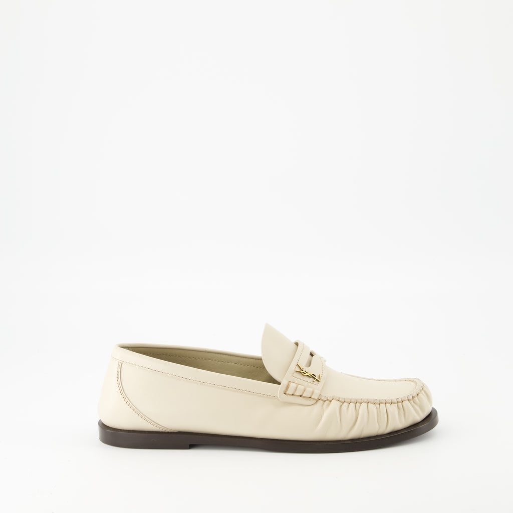 The beige Laurent loafers from Saint Laurent are women's shoes from the Spring-Summer 2025 collection. They feature an elegant design in calfskin leather with golden metal finishes.