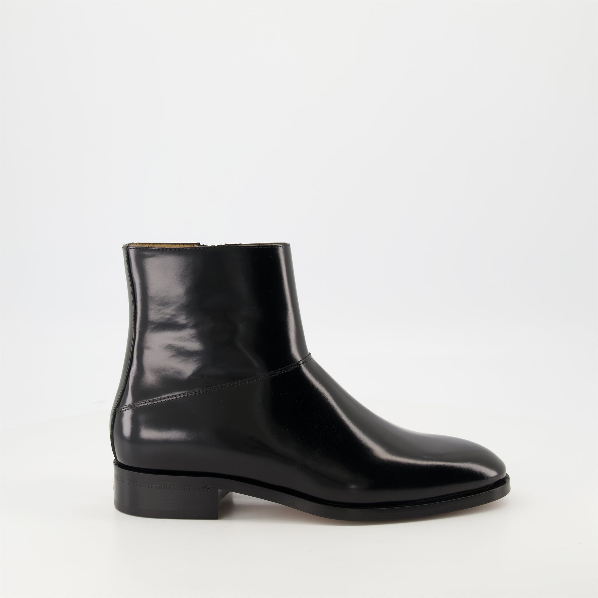 Pat leather ankle boots in black by Valentino Garavani for men. This pair is part of the Spring-Summer 2025 collection and stands out with its shiny leather and VLogo Signature.