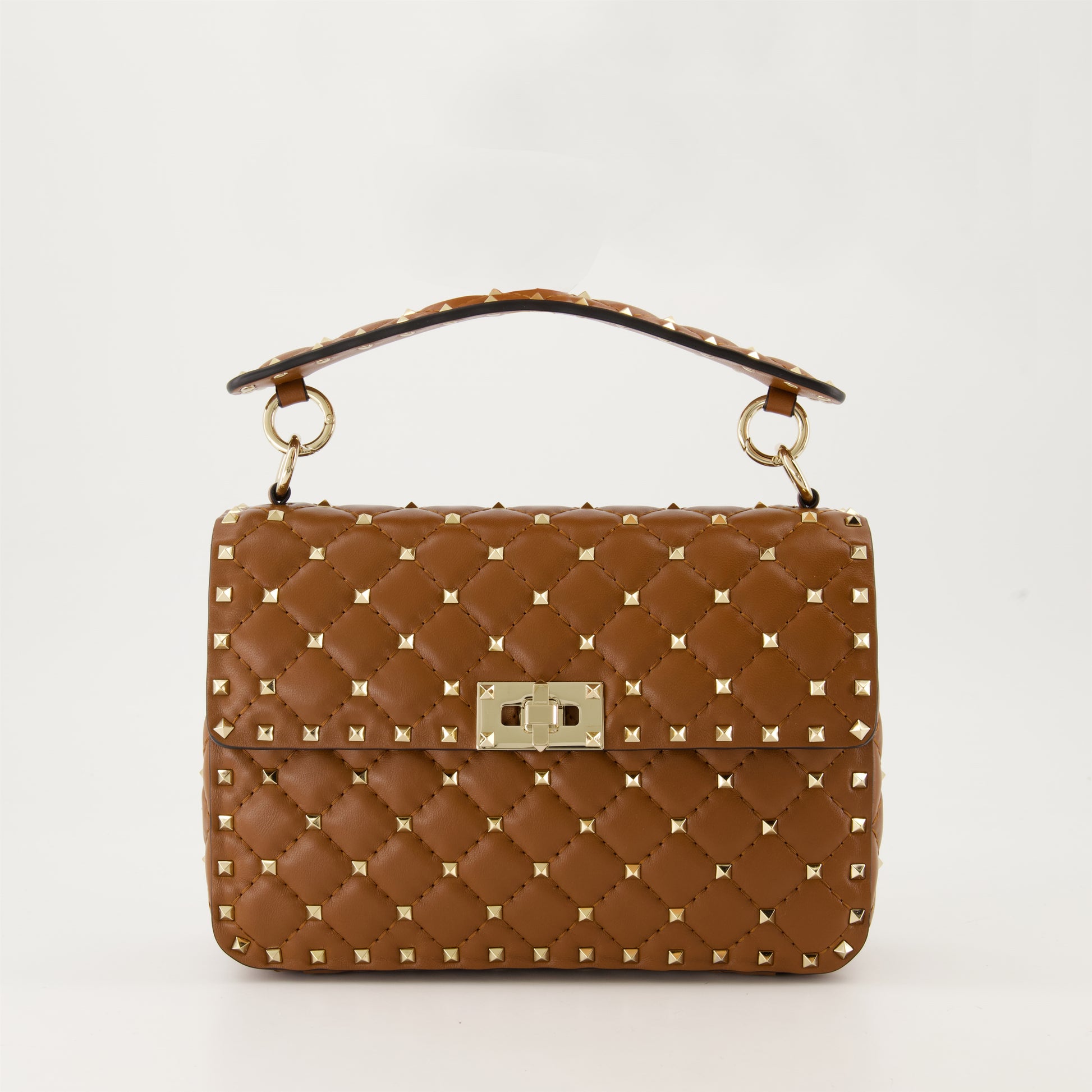 Medium Rockstud Spike Bag from the Valentino Garavani Fall-Winter 2024 collection for Women. Made from quilted nappa leather. Item Color: Brown. Detachable chain shoulder strap and detachable handle. This item is available in several variations.