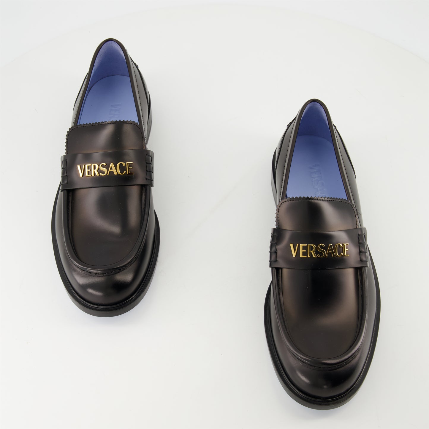 Black leather loafers by Versace for men, made from goat leather with a slip-on design and metallic finishes. This piece is part of the Spring-Summer 2025 collection.