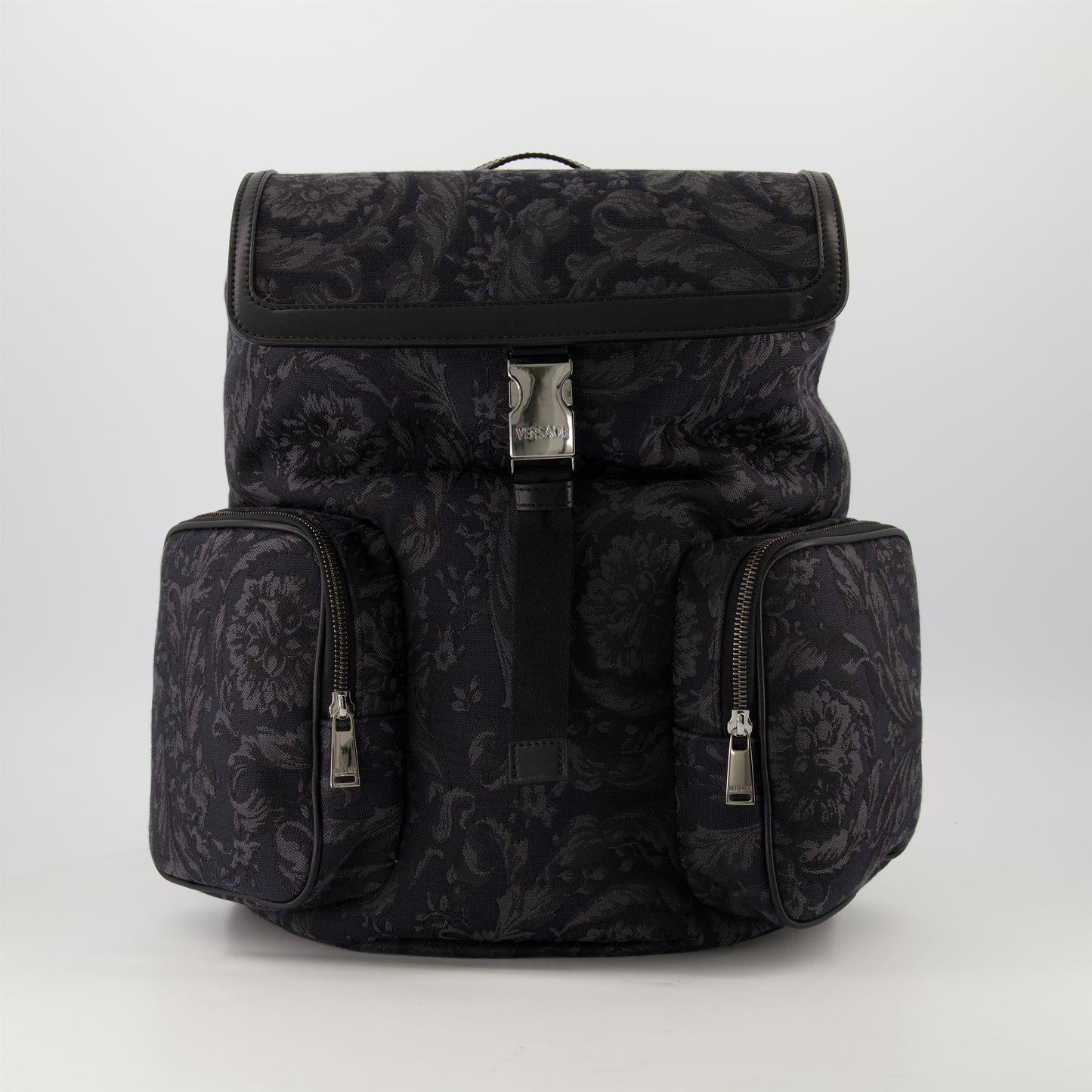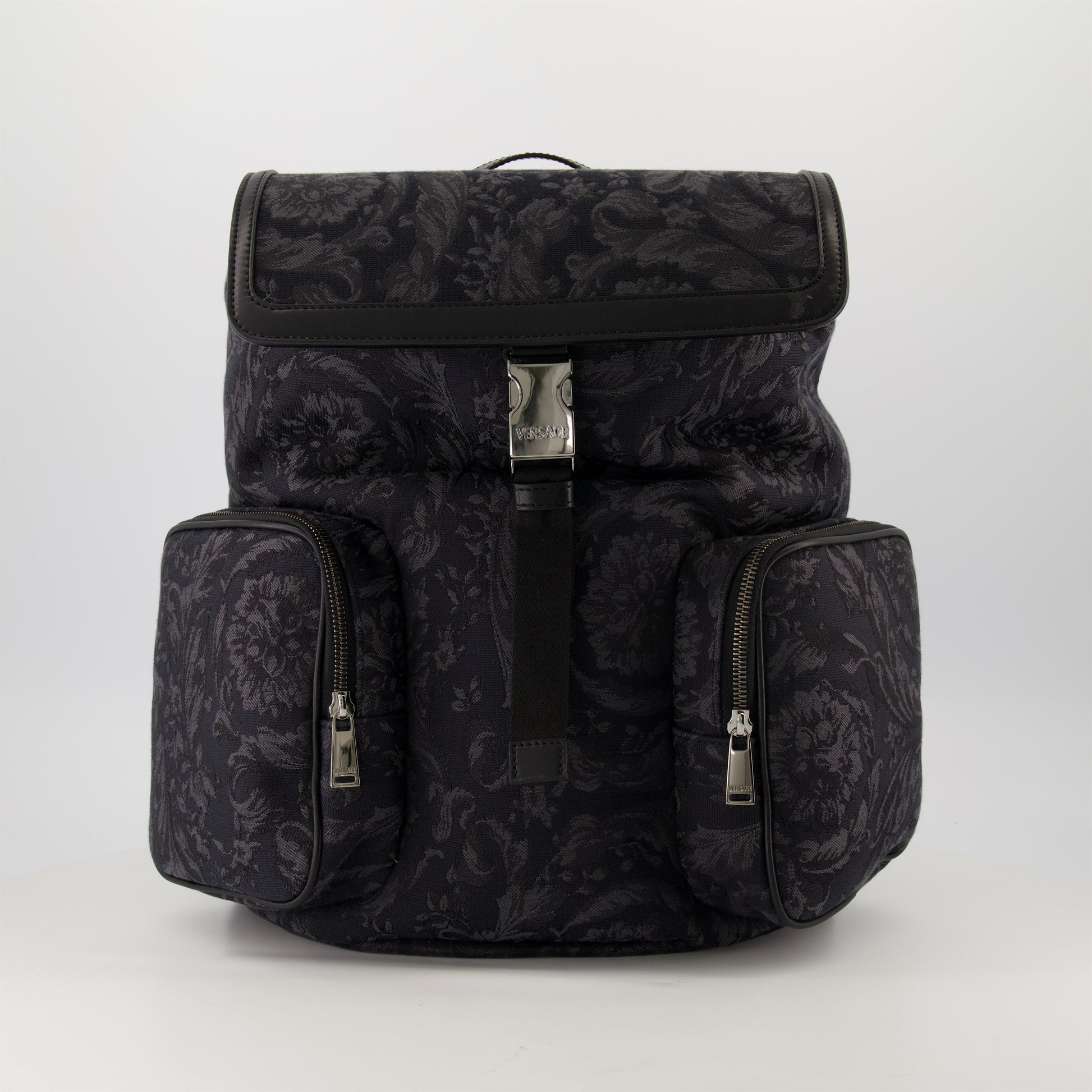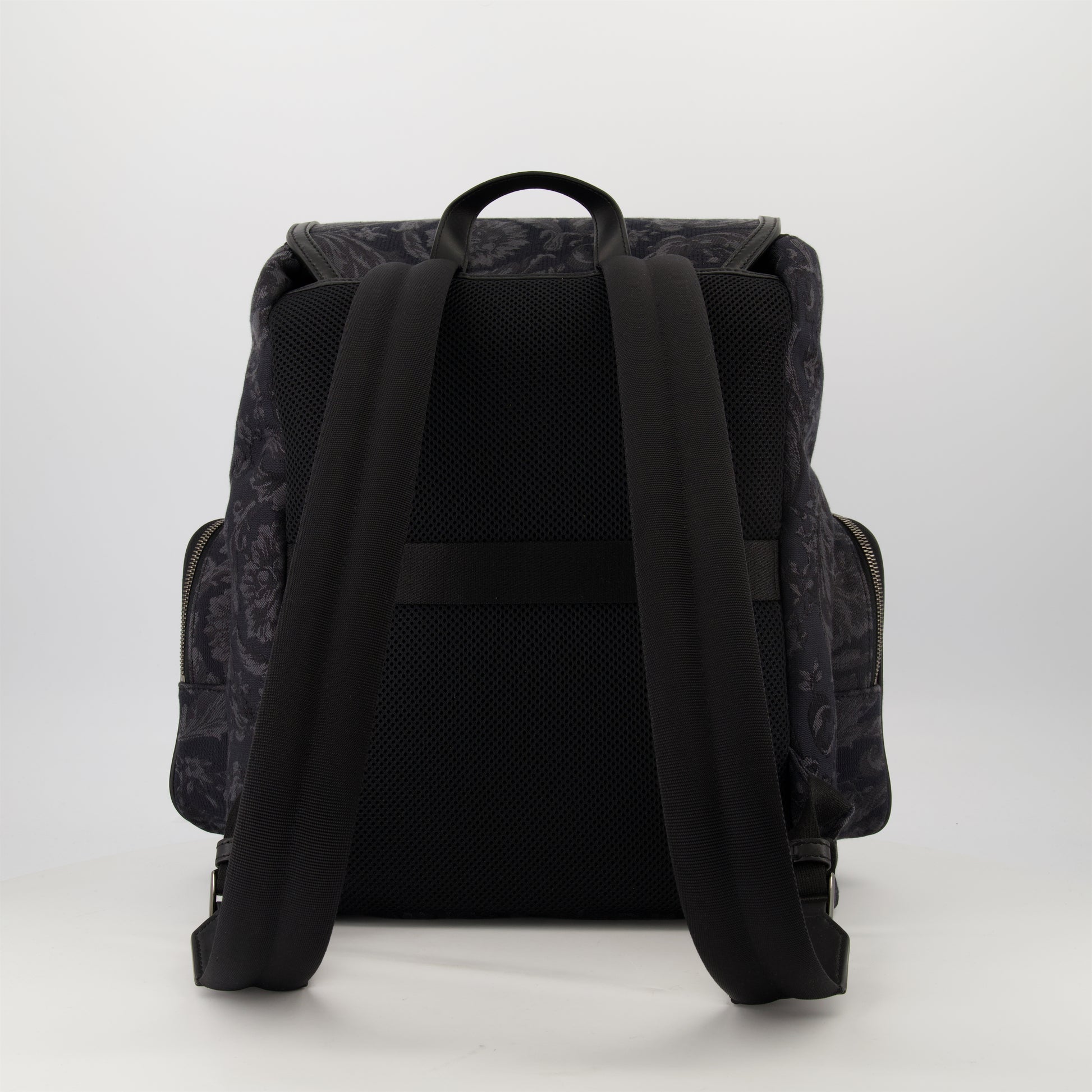 Black Barocco backpack by Versace for men, made of polyester and cotton. This piece is part of the Spring-Summer 2025 collection and features a neo Barocco jacquard print.