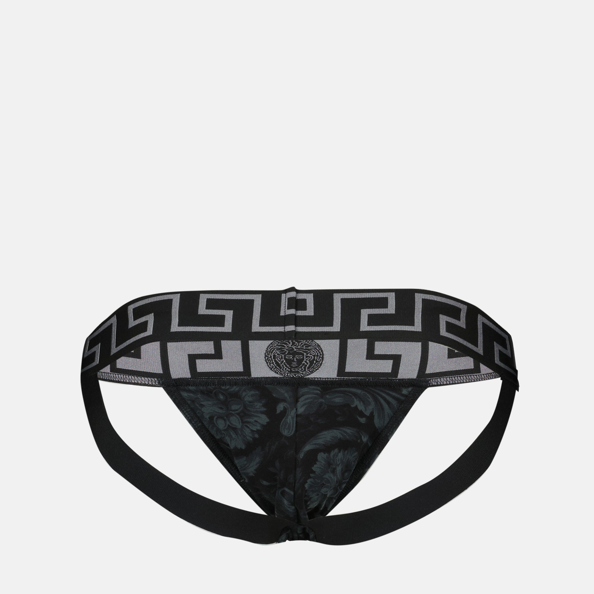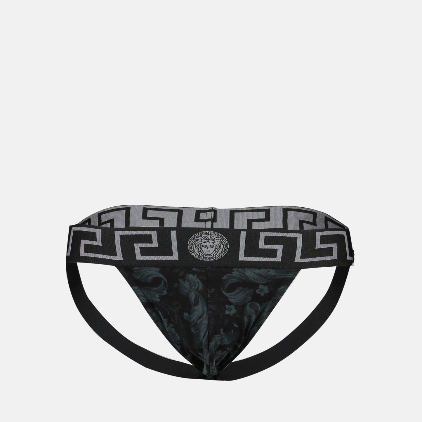 The black Barocco suspensor from Versace is a men's model from the Spring-Summer 2025 collection. It is made of polyamide, cotton, and polyester with a printed logo and an elastic waist.