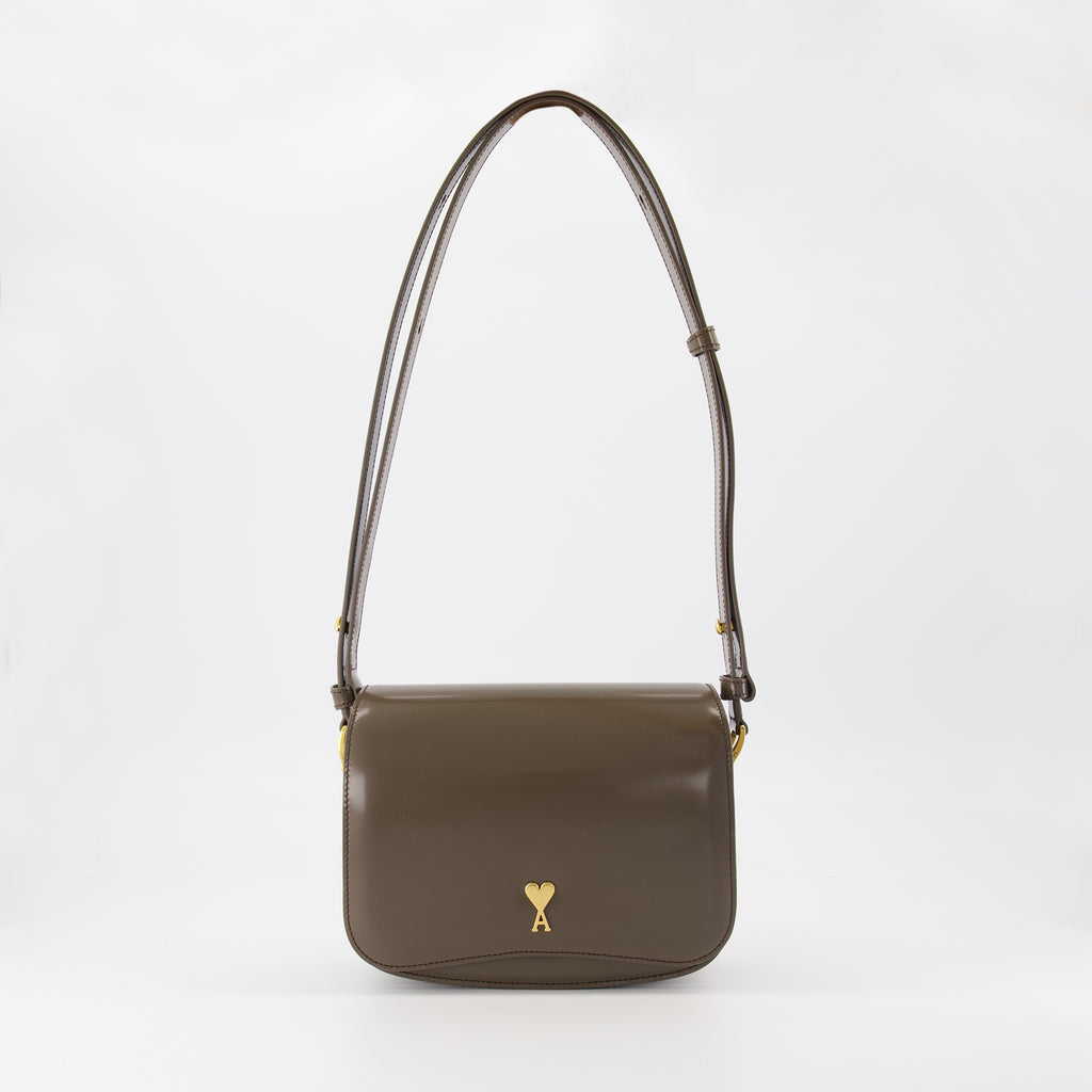 Sac Paris marron de la marque Ami Paris, un modèle unisexe réalisé en cuir de veau. Collection Automne-Hiver 2025, il présente un rabat aimanté et une bandoulière ajustable.