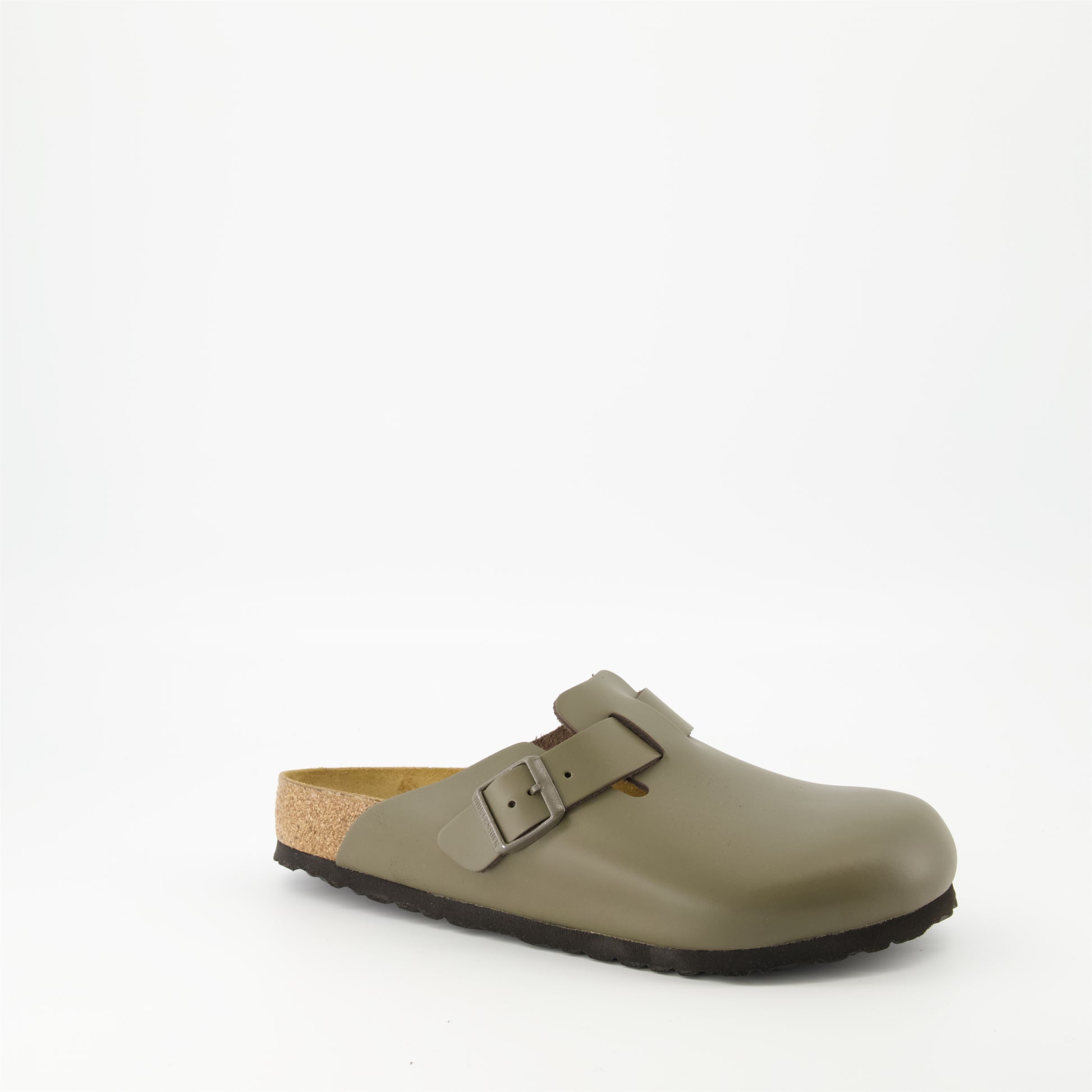 Mules Boston kaki de Birkenstock pour homme, collection Printemps-Été 2025. Réalisées en cuir avec une semelle moulée confortable et un design à enfiler, elles sont disponibles en plusieurs couleurs.