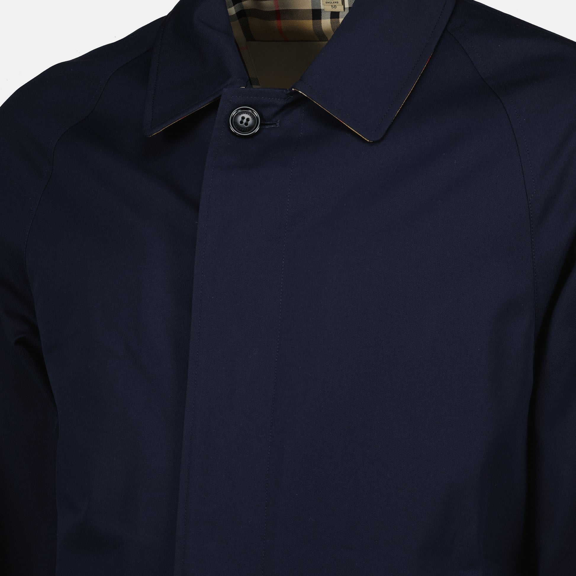 Le trench Camden bleu marine de Burberry est un manteau pour homme. Il fait partie de la collection Automne-Hiver 2025 et est réalisé en coton et viscose.