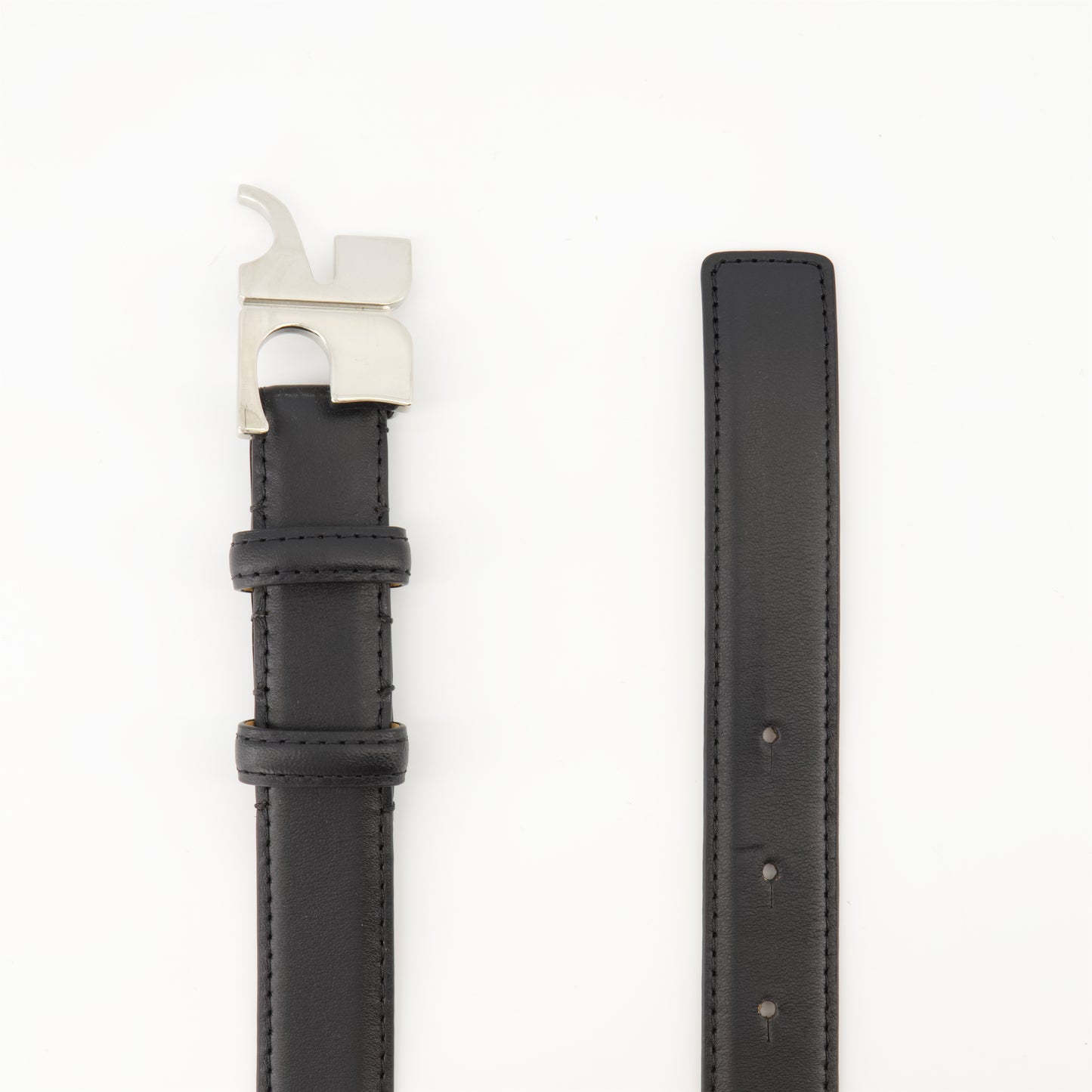 Ceinture Ac en cuir noir de la marque Courrèges, conçue pour homme. Elle fait partie de la collection Printemps-Été 2025 et présente une fermeture à boucle et des finitions en métal argenté.