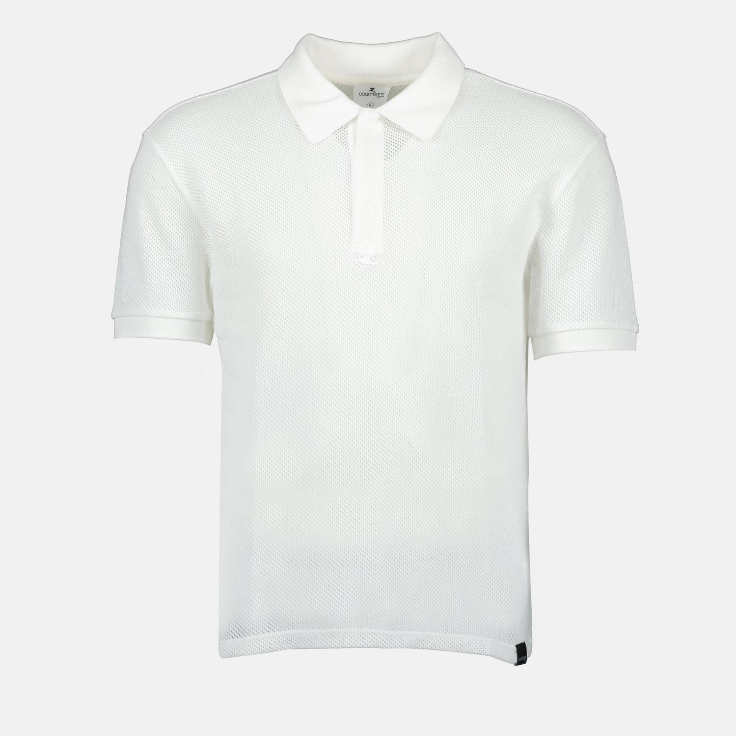 Polo blanc en résille de la marque Courrèges pour homme. Ce modèle fait partie de la collection Printemps-Été 2025 et présente une coupe droite avec des détails soignés.