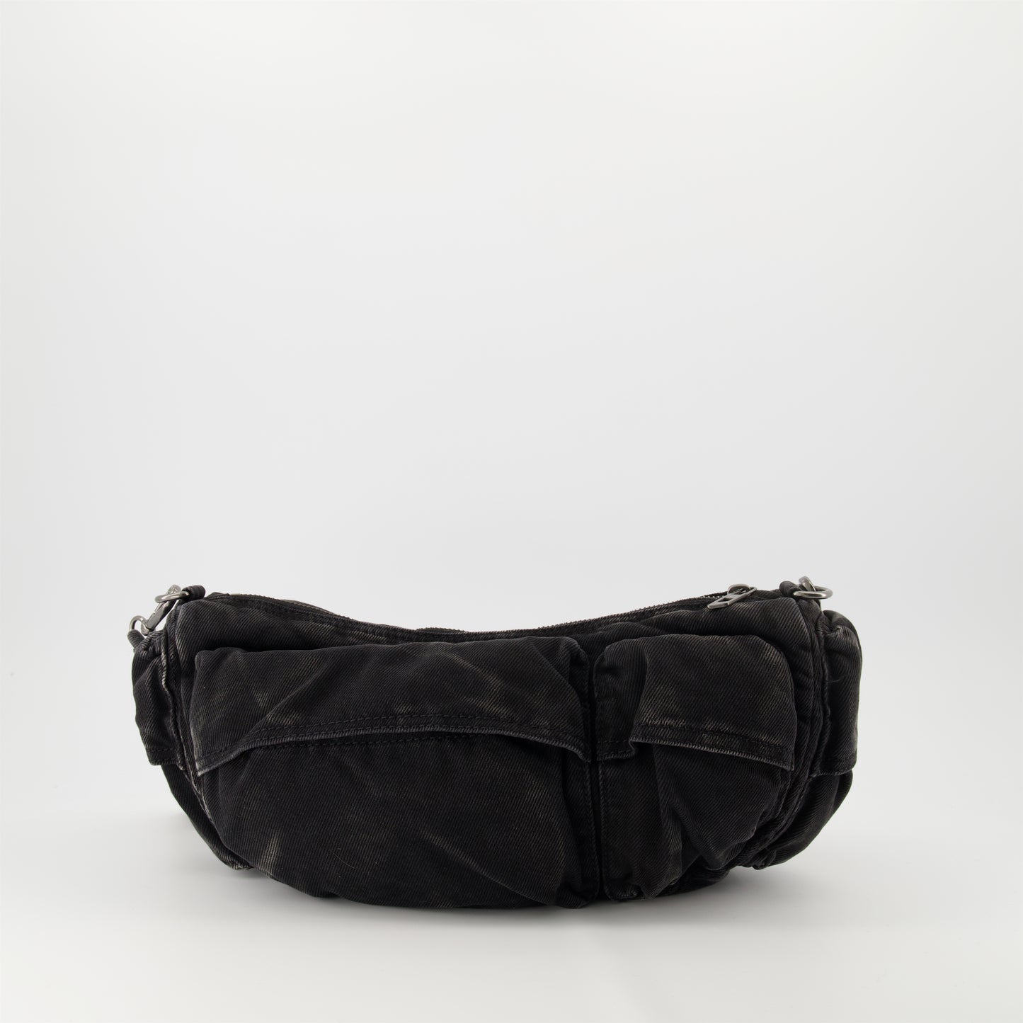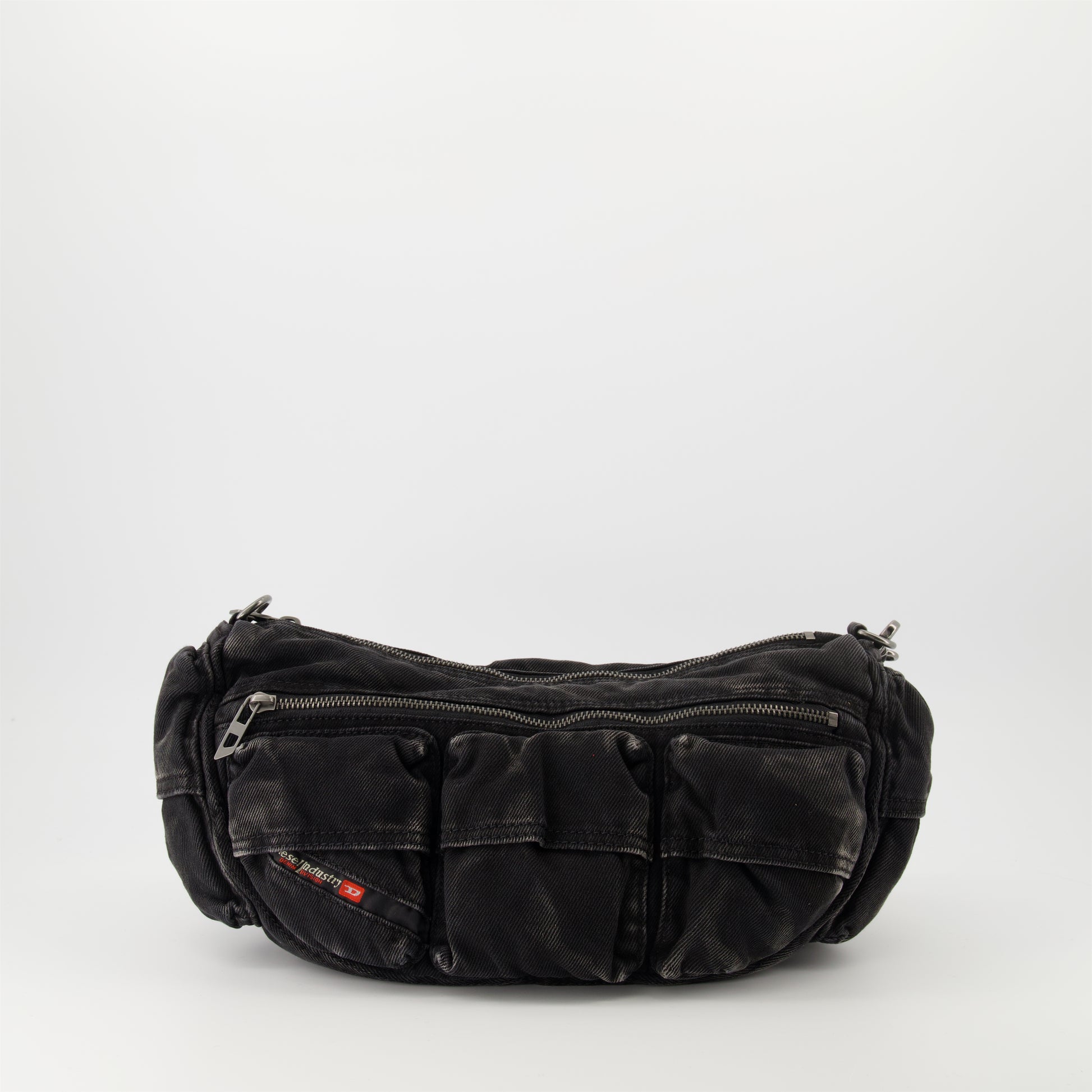 Sac Multi-Pkts en denim noir de la marque Diesel, un modèle unisexe de la collection Printemps-Été 2025. Il dispose d'une fermeture zippée, d'une bandoulière ajustable et de nombreuses poches pratiques.