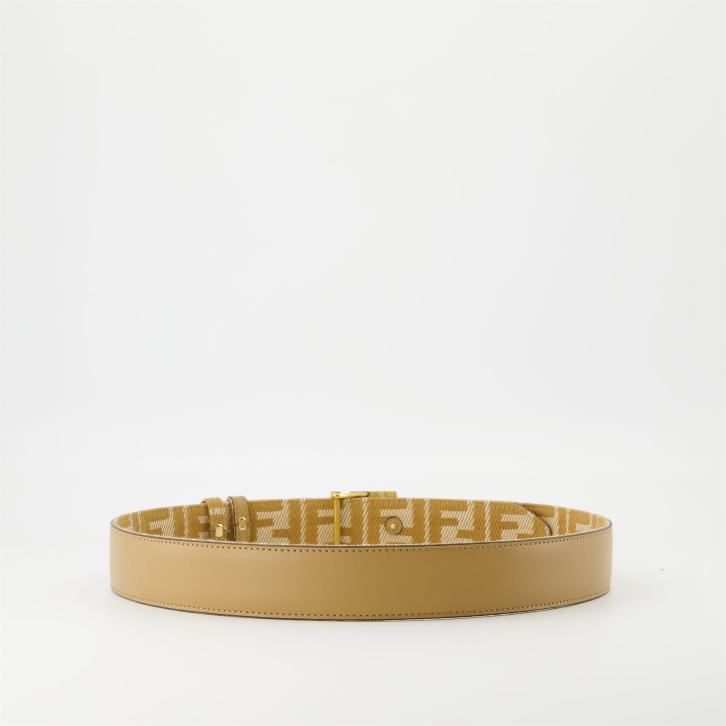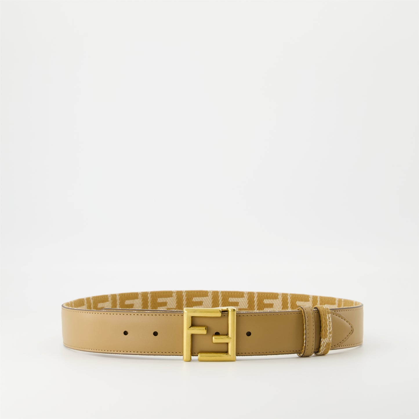 Ceinture FF réversible marron de Fendi pour femme. Cette pièce fait partie de la collection Printemps-Été 2025 et allie cuir et tissu avec un design ajustable et un logo métallique.