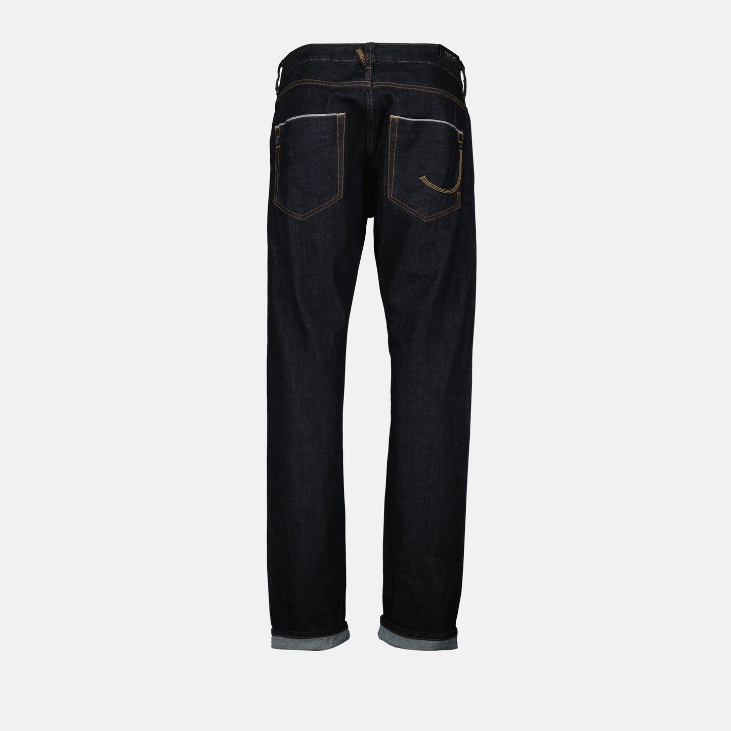 Jeans en denim bleu doncé de la marque Japan Rag, conçu pour homme. Ce modèle fait partie de la collection Printemps-Été 2025 et présente une coupe droite avec un design à cinq poches.