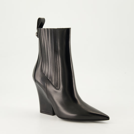 Bottines en cuir Stitch-Out MM6 collection Automne-Hiver 2024 pour Femme. Réalisé en cuir brillant. Article Couleur noir. Bout arrondi et Semelle en cuir.