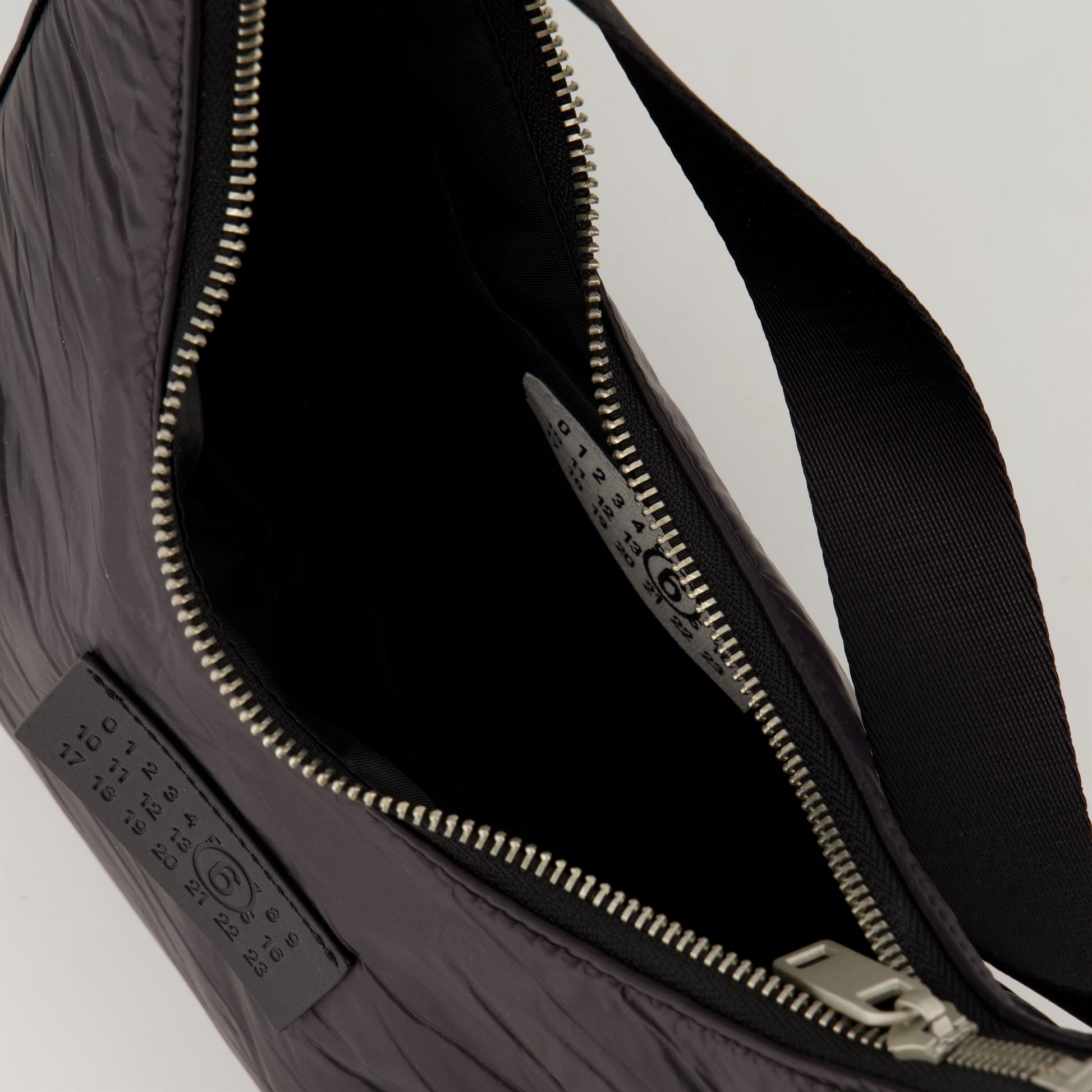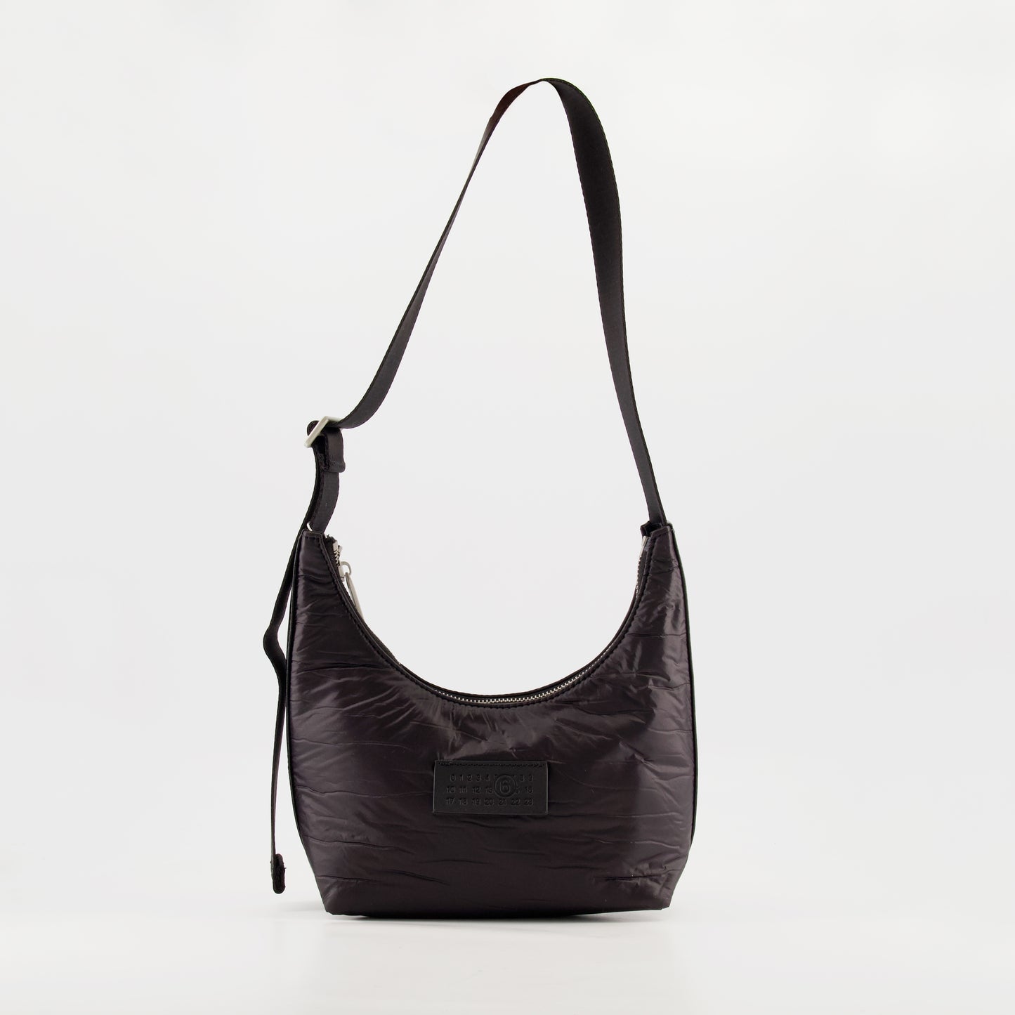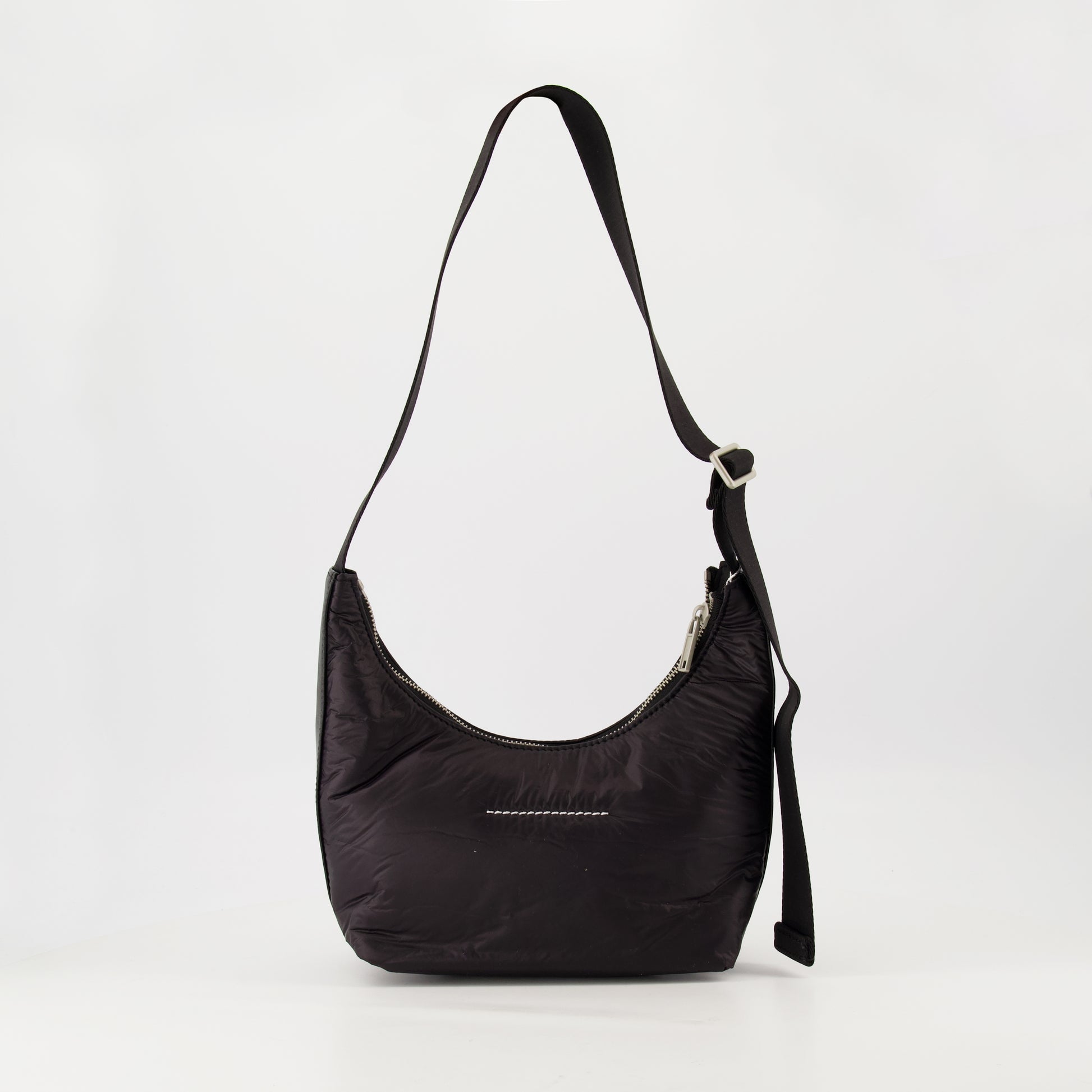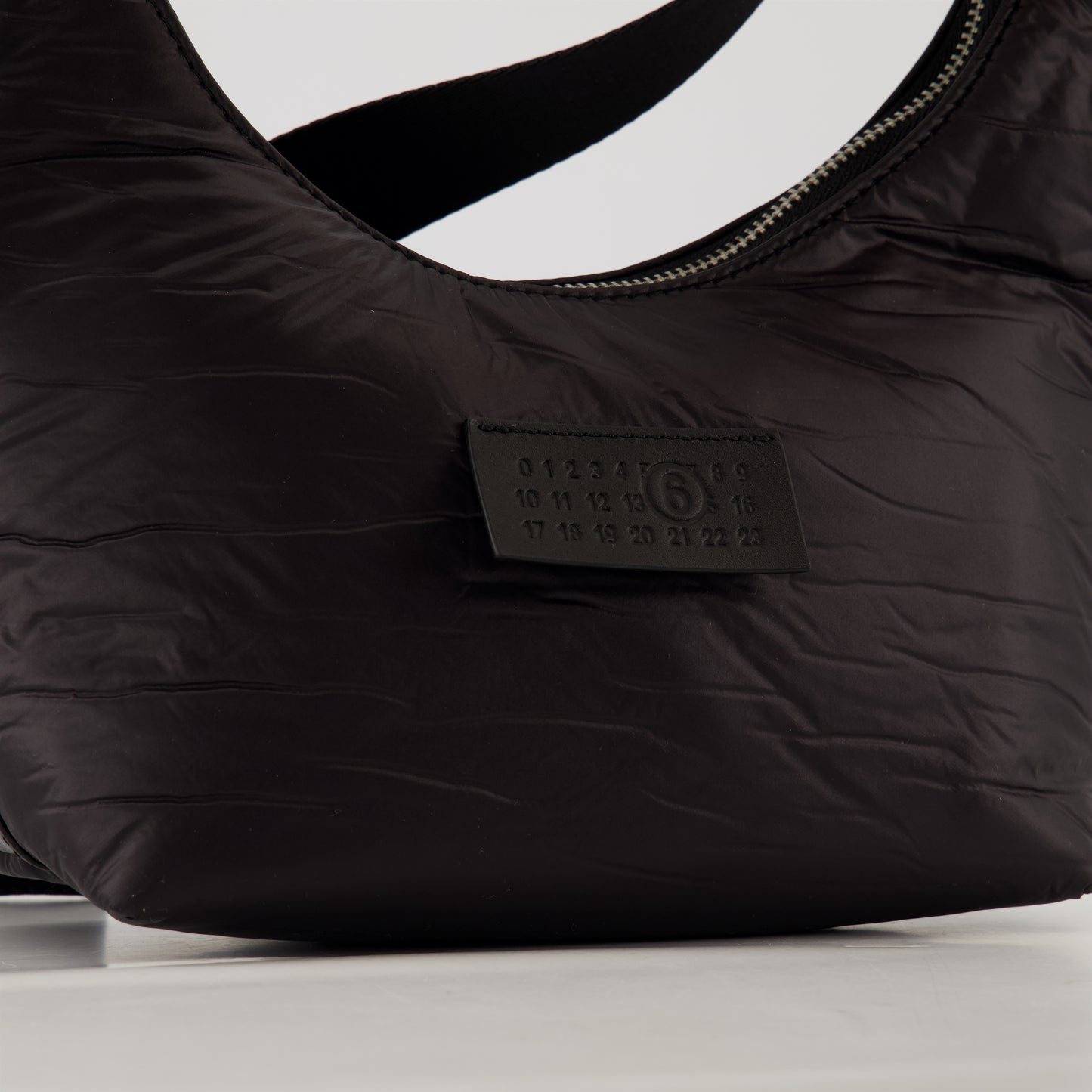 Sac Hobo noir de MM6, conçu pour les femmes, allie style et fonctionnalité. Cette pièce fait partie de la collection Printemps-Été 2025, réalisée en nylon brillant avec des détails raffinés.