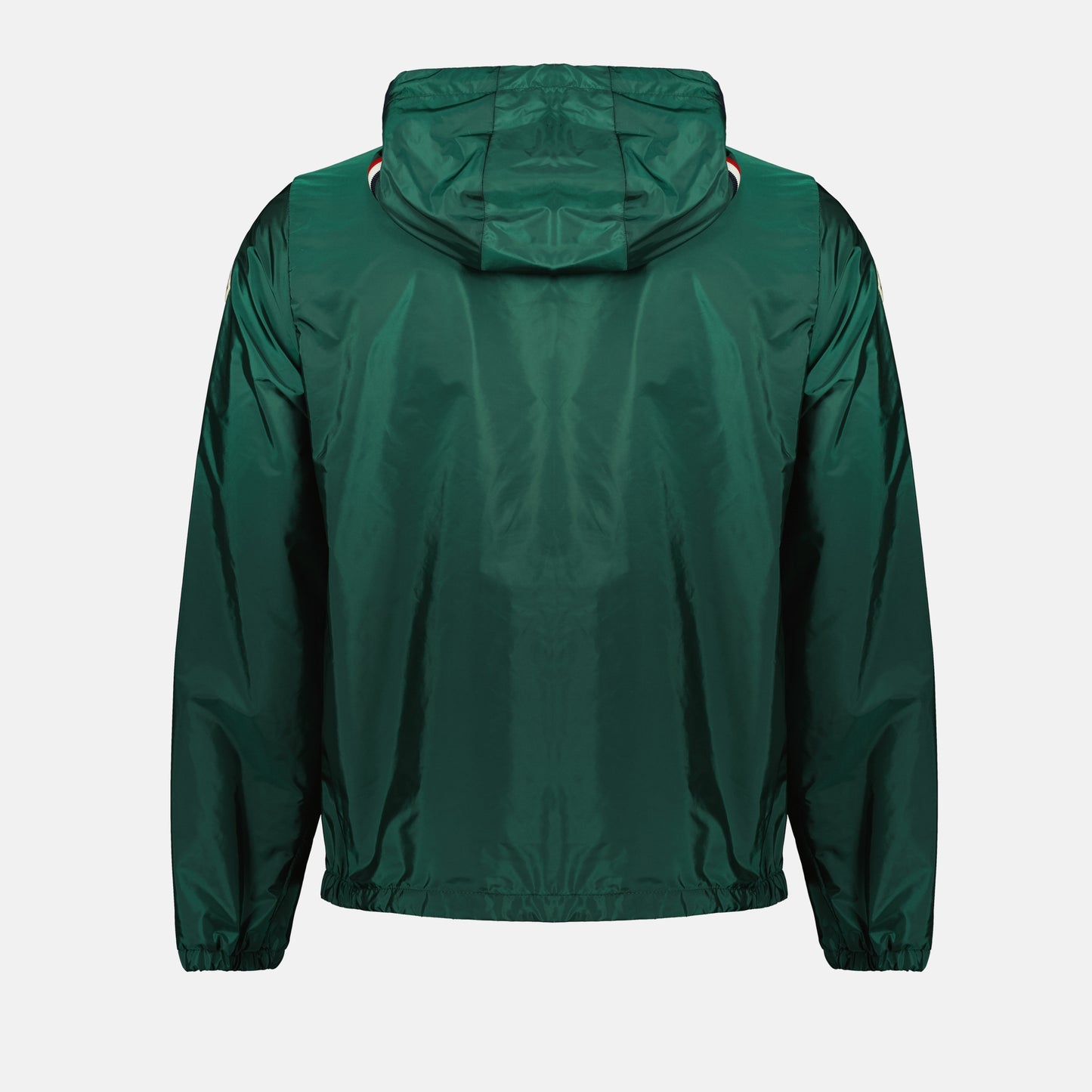 Le coupe-vent Grimpeurs vert de Moncler est un vêtement pour homme de la collection Printemps-Été 2025. Il est conçu en polyamide avec une capuche ajustable et des détails tricolores.