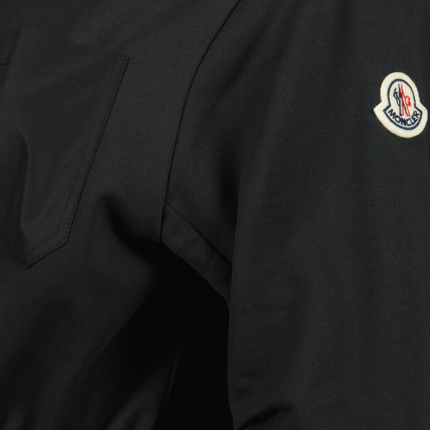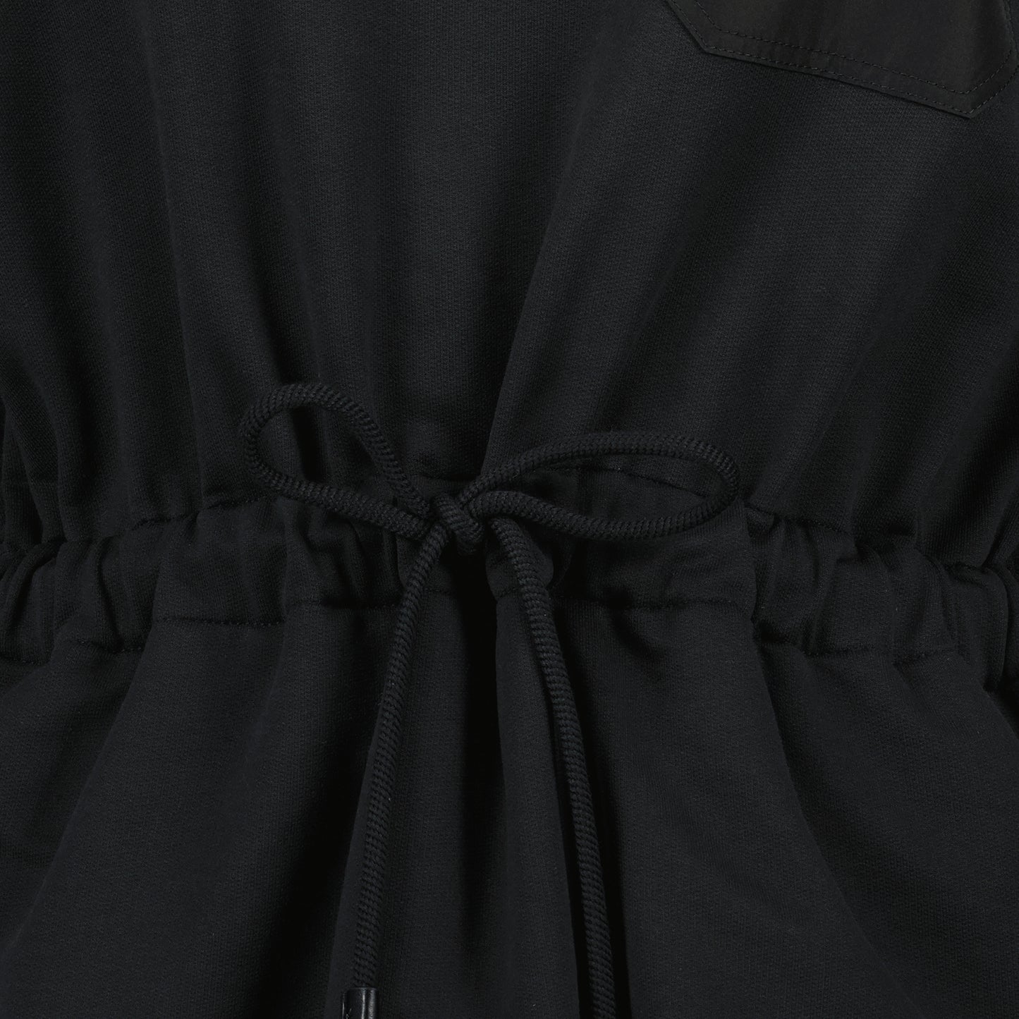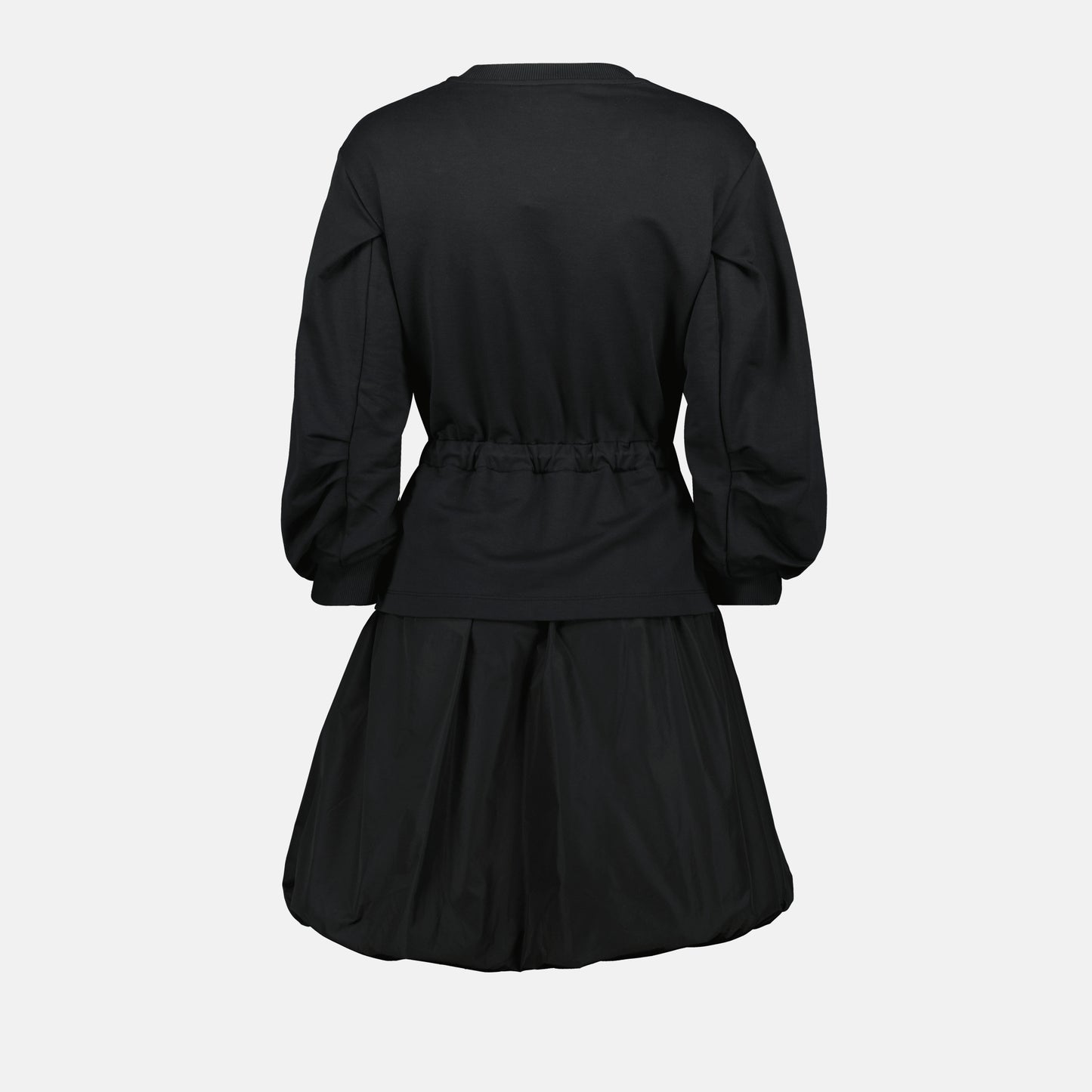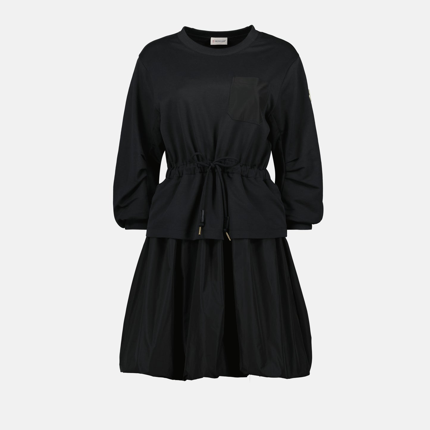 Robe bi-matière noire de Moncler pour femme, issue de la collection Printemps-Été 2025. Elle présente un col rond, des manches courtes et une taille ajustable avec cordon de serrage.