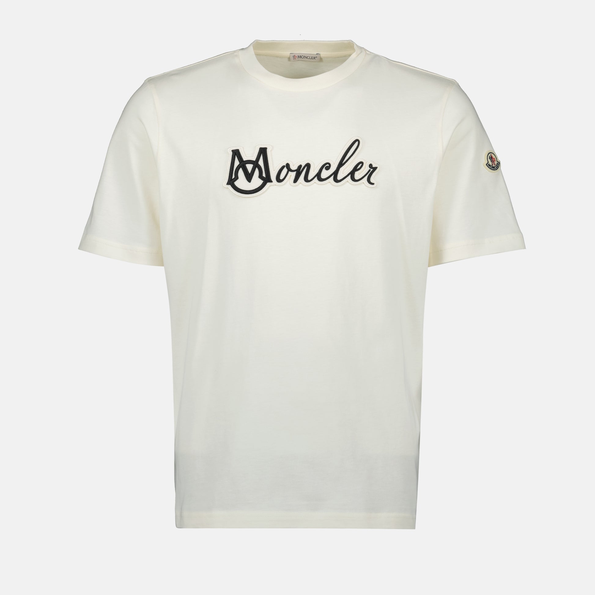 T-shirt à logo brodé blanc de Moncler pour homme, réalisé en coton. Cette pièce fait partie de la collection Printemps-Été 2025 et est disponible en plusieurs couleurs.